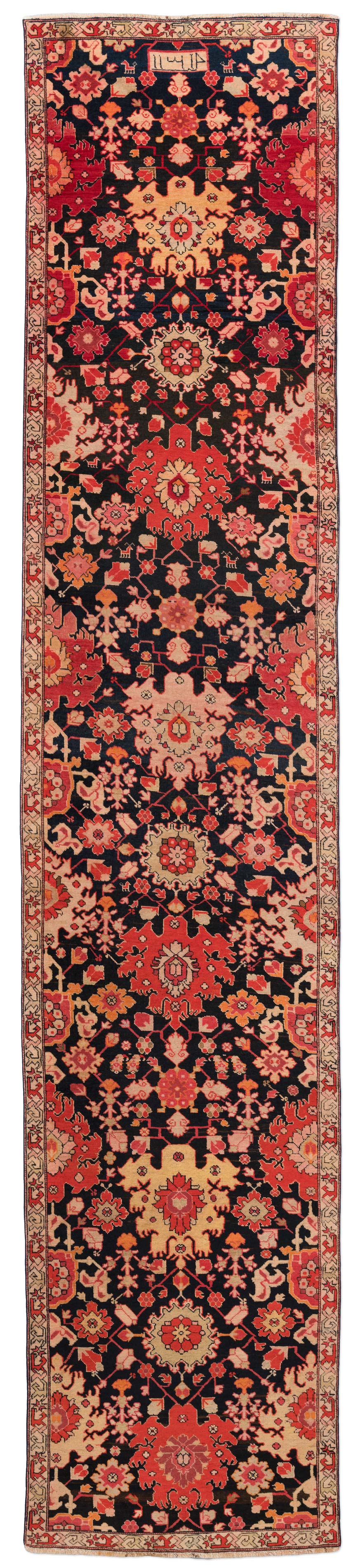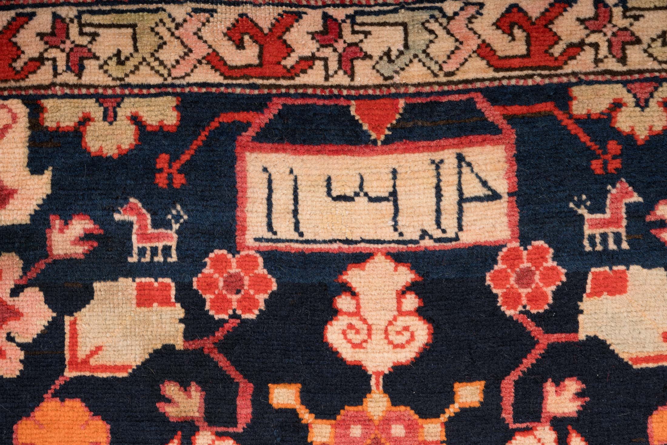 Dieser antike Schirwan-Teppich aus Aserbaidschan besticht durch seine leuchtende Farbpalette und hochwertige Handwerkskunst. Die Hauptfarbe ist ein tiefes dunkles, fast schwarzes Marineblau, das von kräftigem Rot und warmem Beige akzentuiert wird. Diese Kombination verleiht dem Teppich eine zeitlose Eleganz. Die Musterung ist reichhaltig und detailliert, mit floralen und geometrischen Elementen, die harmonisch miteinander verwoben sind. Die Verwendung von Schafwolle für Schuss und Kette sowie der Einsatz von Naturfarben unterstreichen die Authentizität und Qualität dieses Sammlerstücks. Trotz eines kleinen Flecks und altersbedingter Oxidation der braunen Farbtöne, bleibt der Teppich in sehr gutem Erhaltungszustand. Ein signiertes Meisterwerk um 1900, das sowohl Kenner als auch Liebhaber faszinieren wird. Tauchen Sie ein in die Geschichte und Kultur des Kaukasus mit diesem einzigartigen Teppich, der nicht nur ein Kunstwerk, sondern auch ein Stück lebendige Geschichte ist.