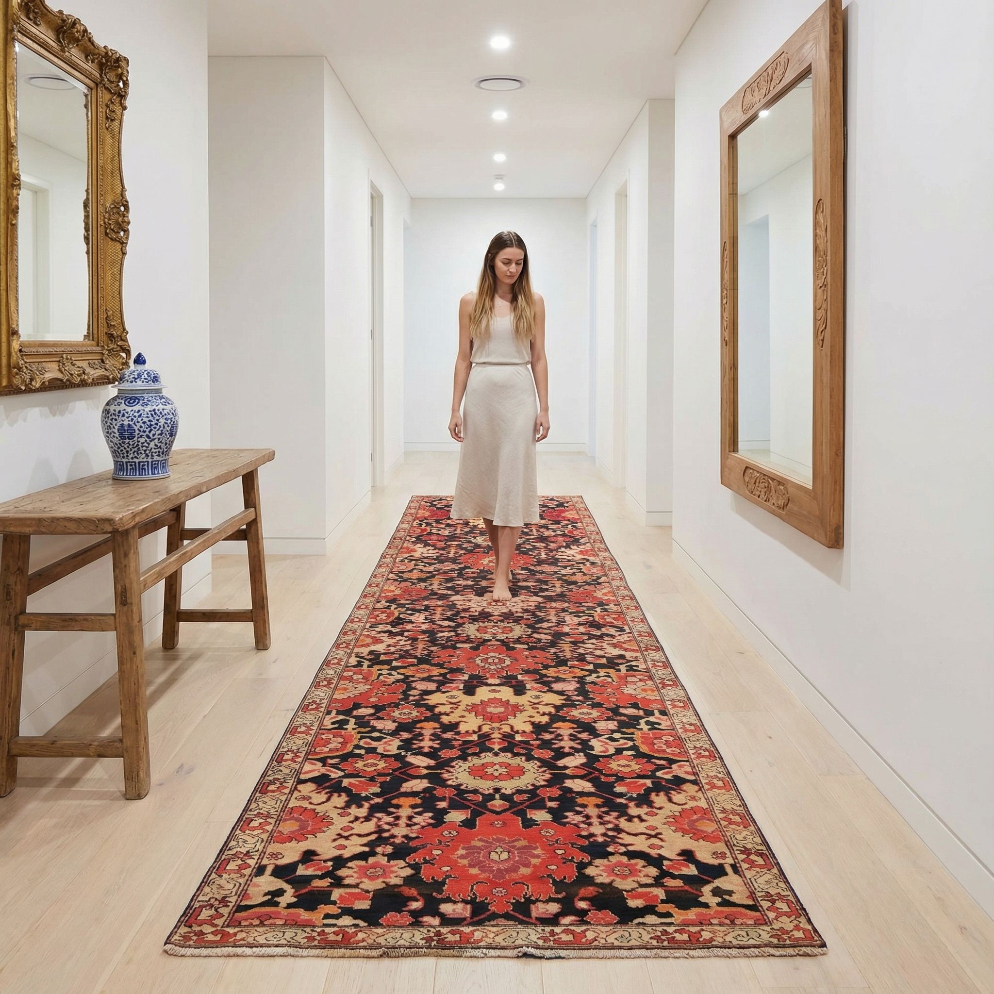 Im BOHO-Style darf dieser Läufer seine volle Leuchtkraft entfalten, denn hier trifft die Freiheit des Mix-and-Match auf echten Vintage-Charme. Die lebendigen Rottöne und das tiefe Blau bilden einen aufregenden Kontrast zu Rattanmöbeln, vielen Grünpflanzen und weichen Textilien, was den lässigen, künstlerischen Look perfektioniert. Als antikes Original bringt er genau jene Seele und leichte Unvollkommenheit mit, wie die charmante Oxidation der Brauntöne, die den unkonventionellen Bohème-Charakter so begehrenswert machen. Ob als farbenfroher Akzent im Flur oder als Highlight im Wohnbereich – dieser Teppich erzählt eine Geschichte und lädt in einer entspannten Umgebung zum Träumen ein.