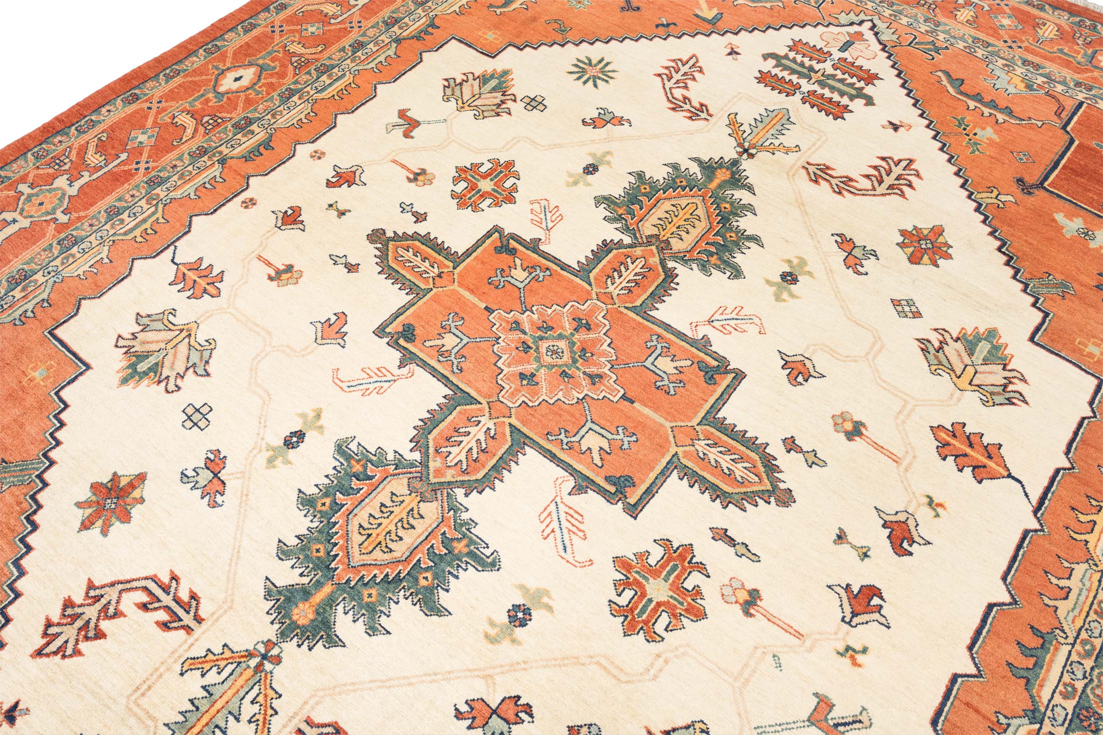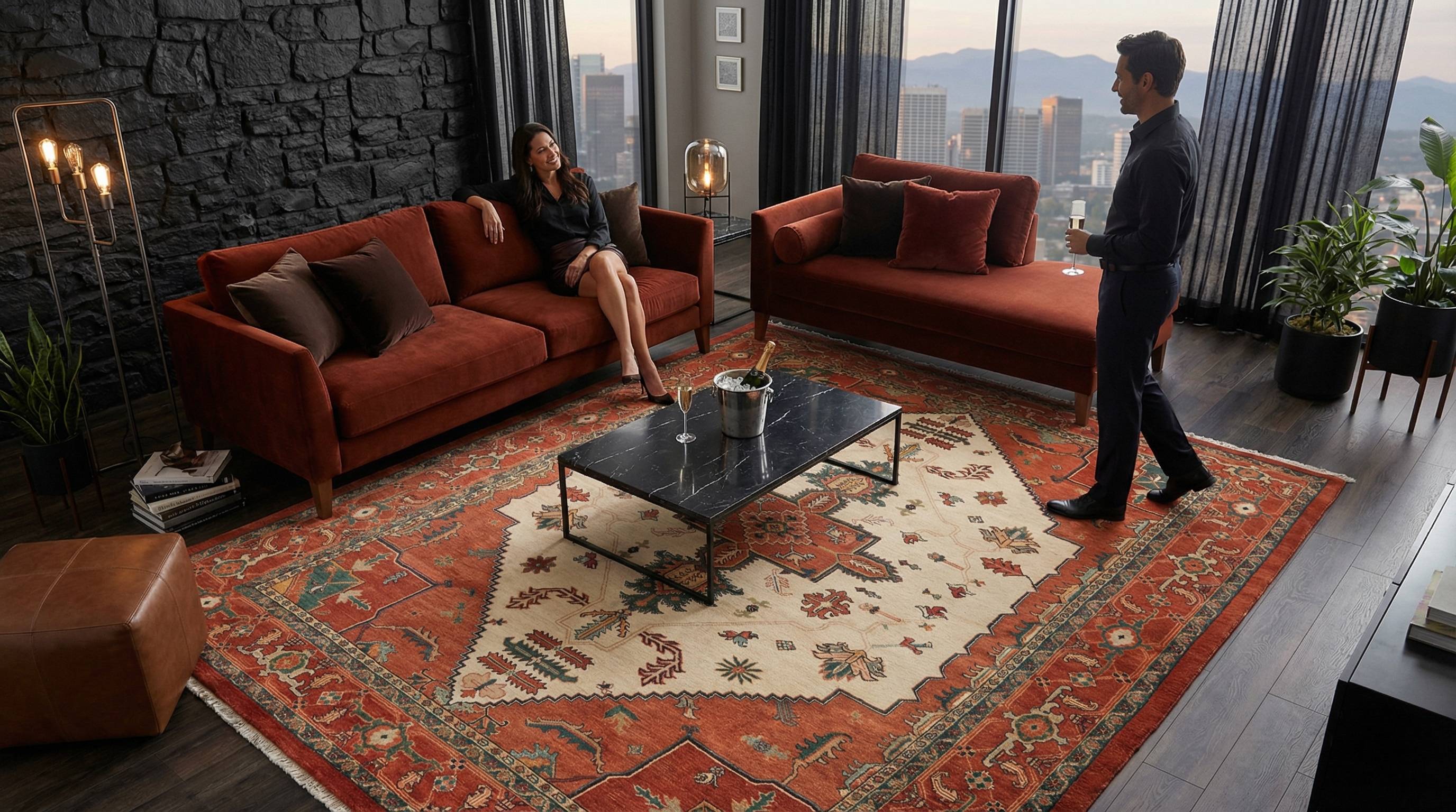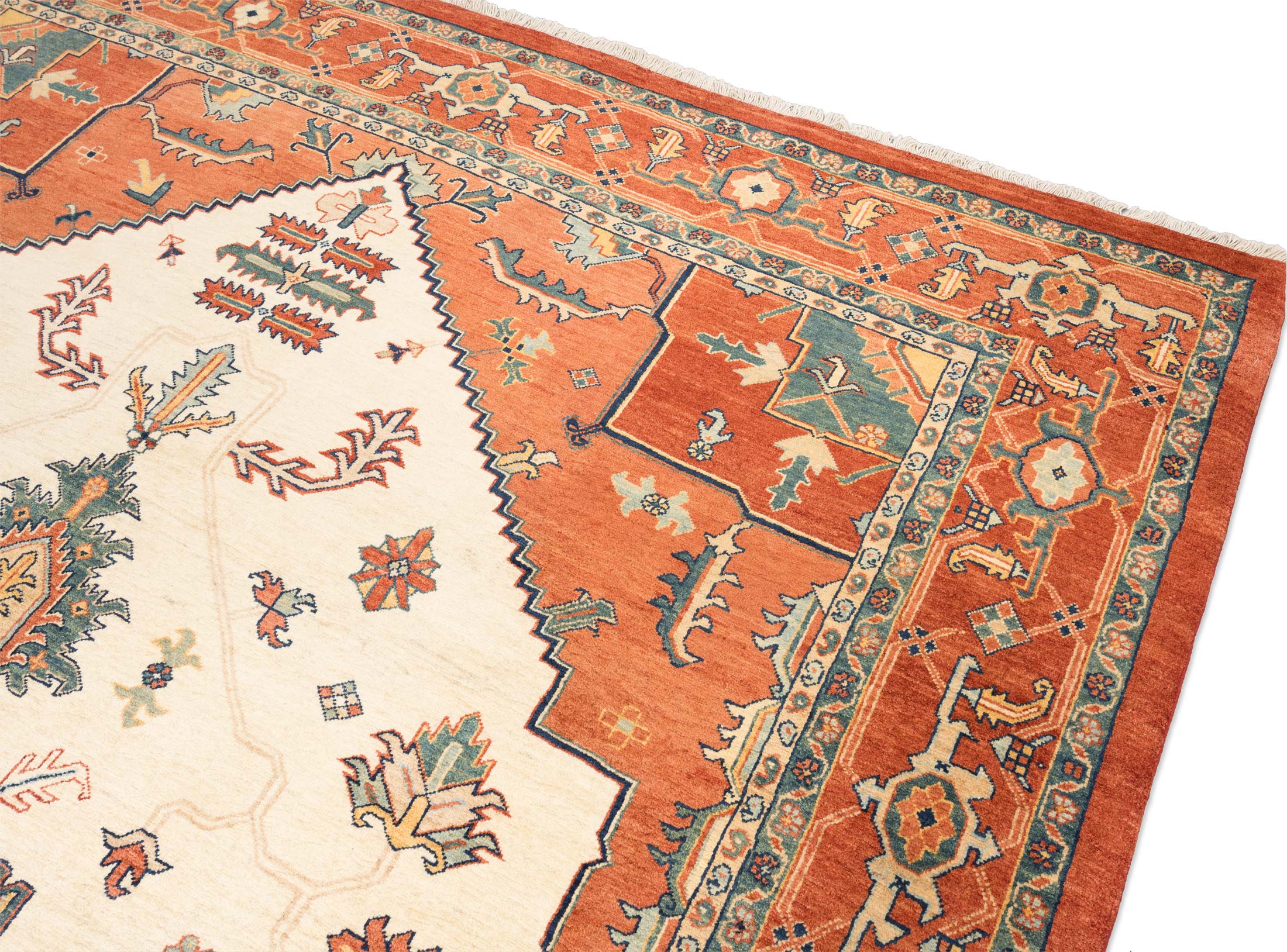 Als gekonnter Stilbruch im Industrial-Style setzt dieser Teppich einen warmen, wohnlichen Kontrapunkt zu kühlem Beton, rohem Backstein und metallischen Elementen. Die historische Anmutung der Heriz- und Serapi-Motive verleiht einem modernen Loft Seele und bricht die Strenge der Architektur auf faszinierende und einladende Weise. Seine kräftigen Farben und die haptische Tiefe der dicken Schafwolle (ca. 9 kg/m² Materialeinsatz) sorgen dafür, dass weitläufige Räume sofort strukturiert und akustisch angenehmer wirken. Hier beweist das signierte Meisterstück von Mesgarzadeh, dass echte Handwerkskunst und rauer Industrie-Charme eine spannungsgeladene und zugleich harmonische Symbiose eingehen können.