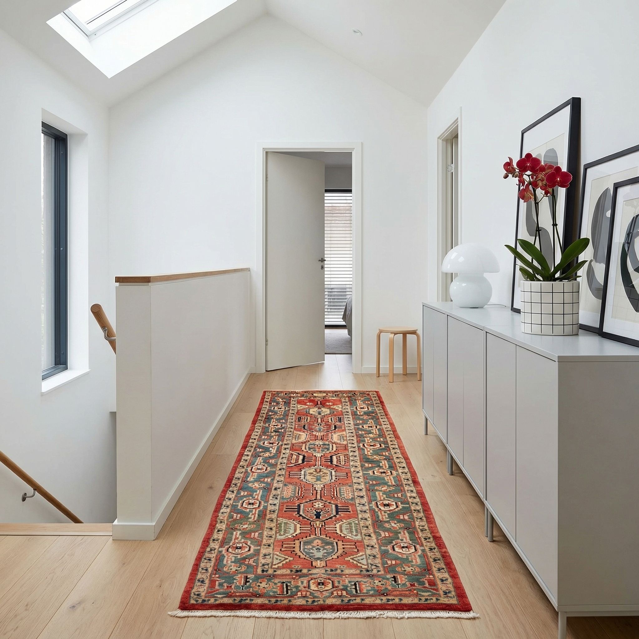 Hier präsentieren wir den beeindruckenden handgeknüpften Teppich Ghadimi, ein Original aus dem Hause Mesgarzadeh. Die Hauptfarbe dieses Meisterwerks ist ein lebhaftes Rot, das in harmonischem Kontrast zu einem satten Blaugrün steht. Ergänzt wird das Farbenspiel durch warme Beige-Töne, die dem Teppich eine einladende Wärme verleihen. Diese drei Farben dominieren das Design, während weitere fröhliche und bunte Akzente die Musterung lebendig erscheinen lassen.Die Muster sind inspiriert ...