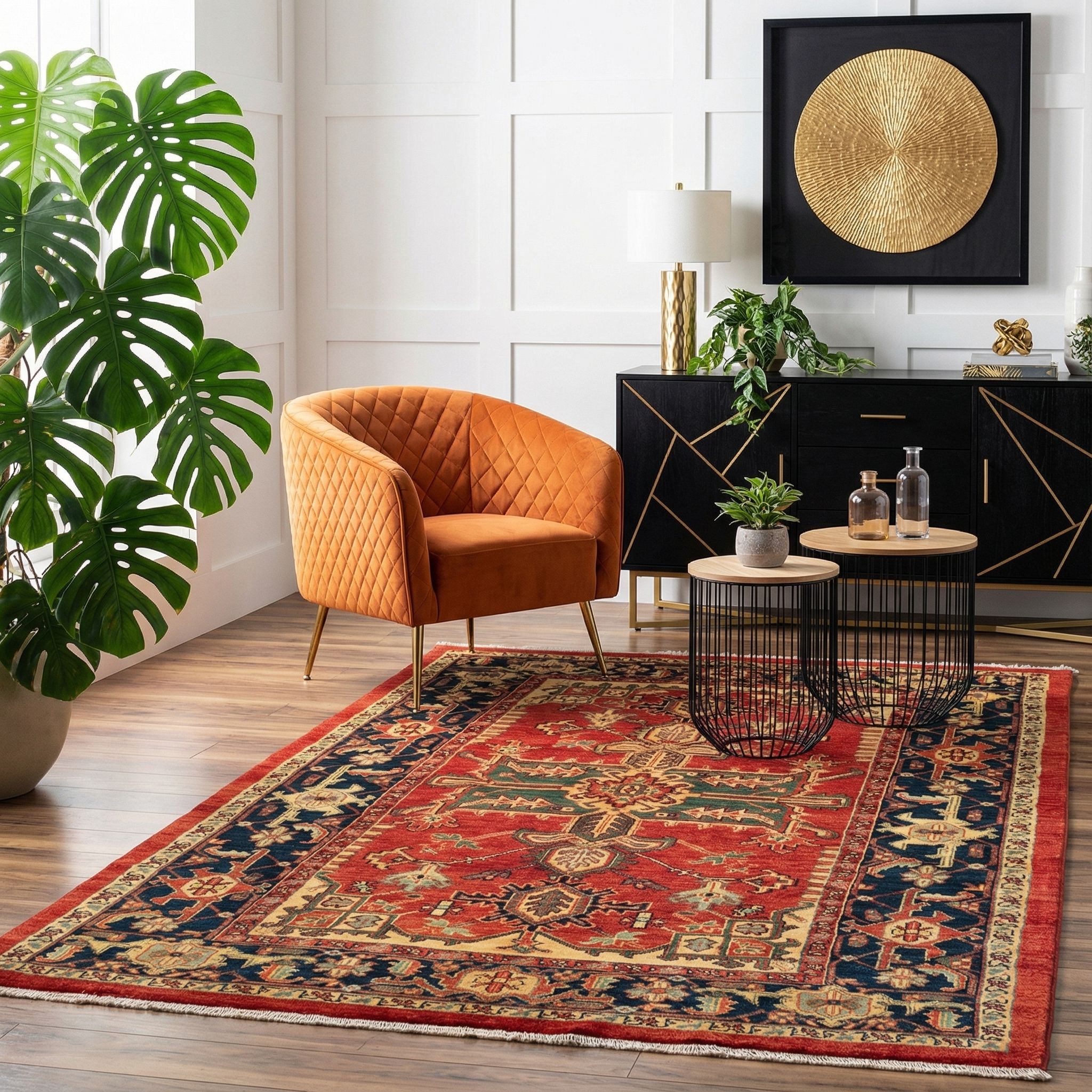 Hier präsentieren wir einen exquisiten handgeknüpften Ghadimi-Teppich aus dem renommierten Hause Mesgarzadeh. Die Hauptfarbe dieses Meisterwerks ist ein reiches Ziegelrot, das durch elegante Akzente in Dunkelblau und Creme ergänzt wird. Die Kombination dieser Farben verleiht dem Teppich eine warme und einladende Ausstrahlung.Das Muster des Teppichs ist inspiriert von traditionellen Heriz- und Serapi-Designs, kunstvoll modernisiert und in lebendigen, freundlichen Farben neu ...