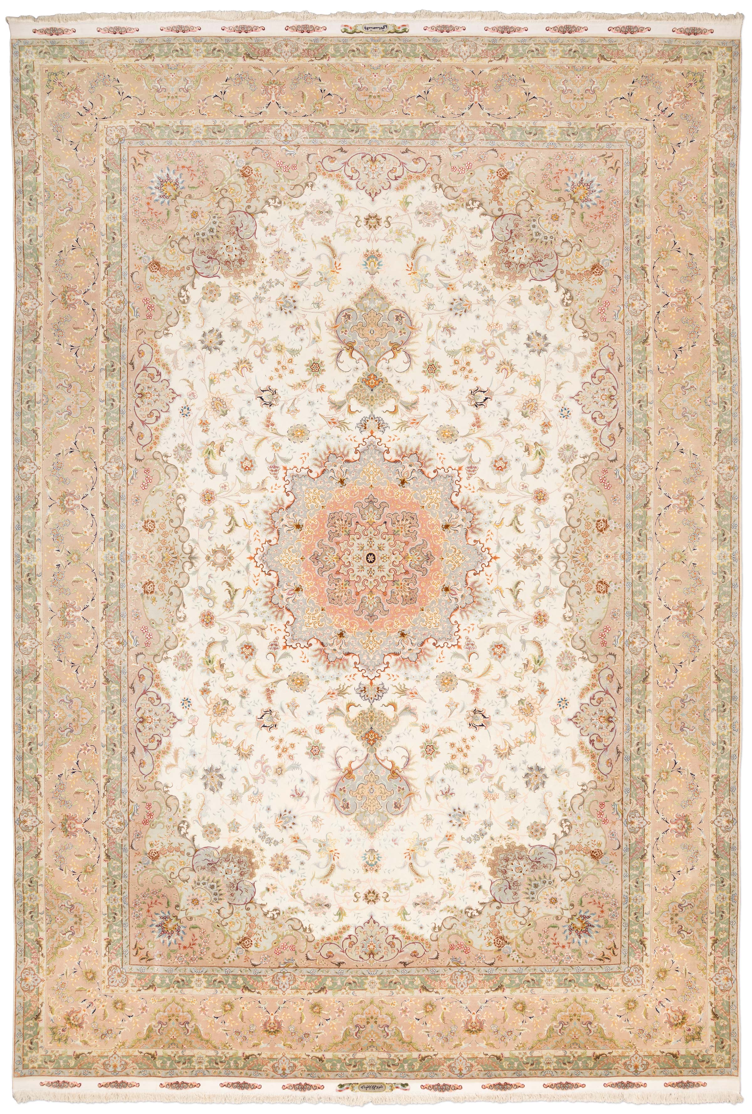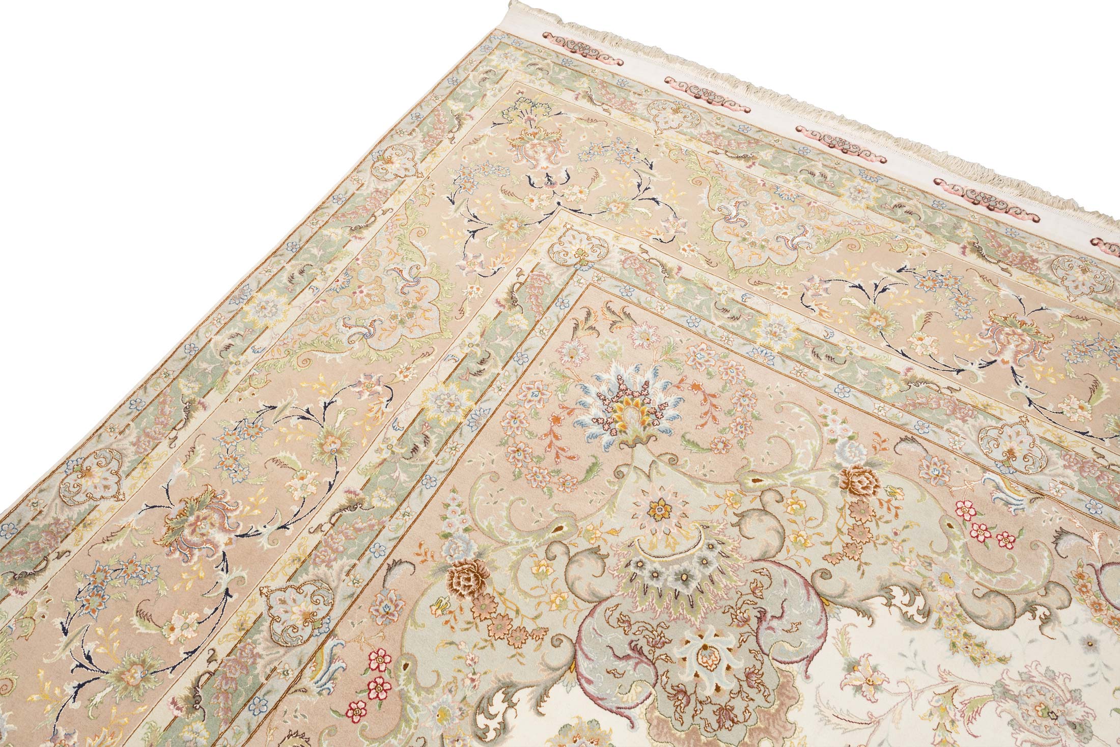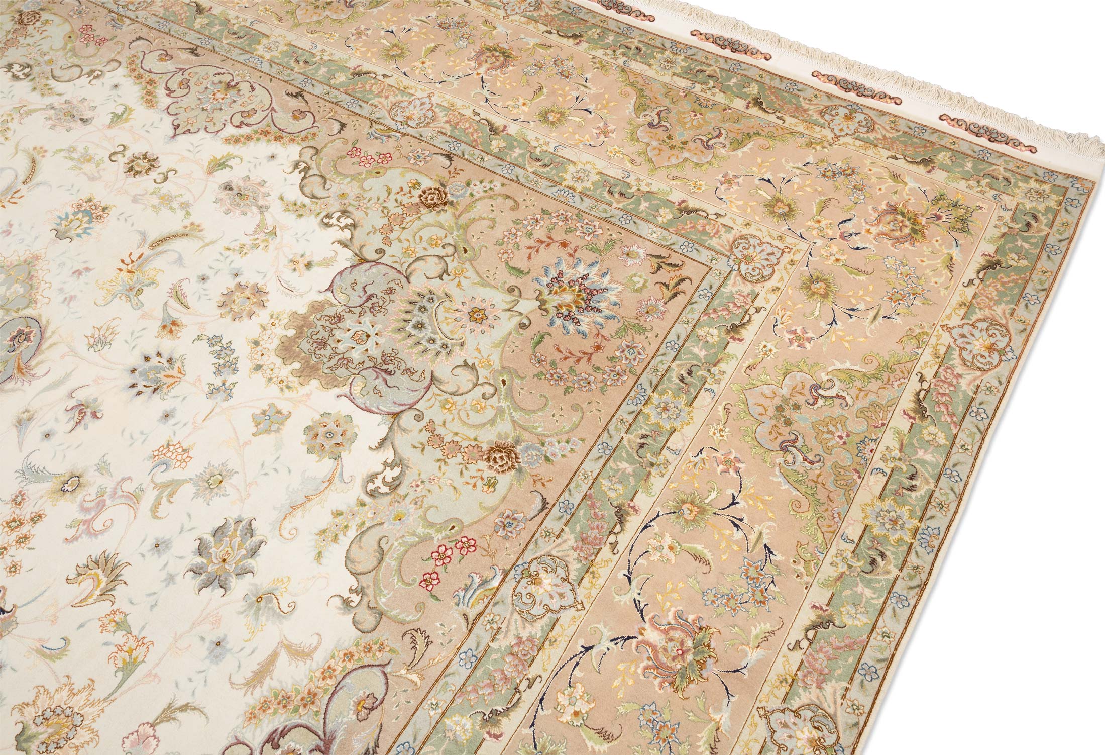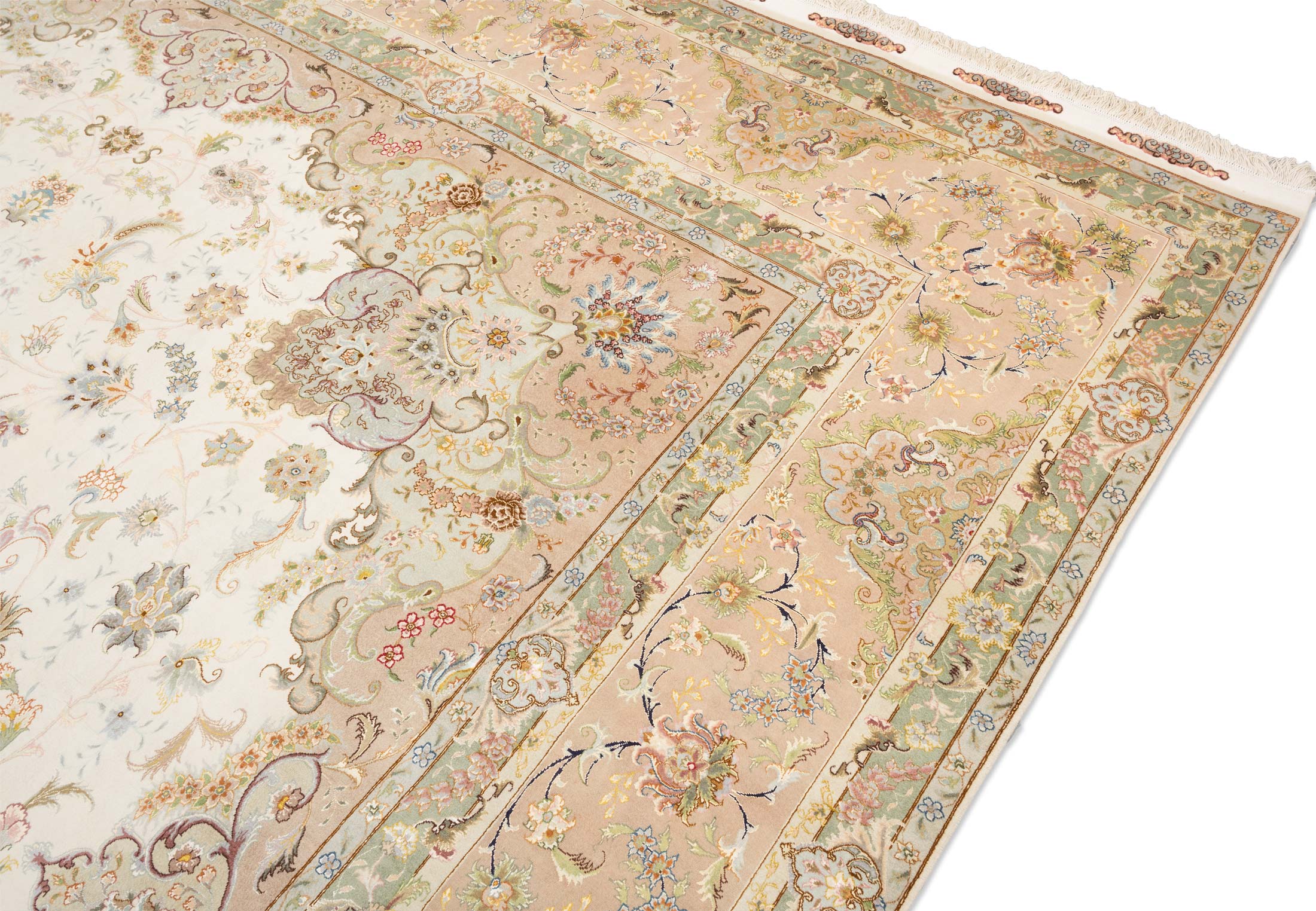 Dieser prachtvolle Täbriz-Teppich erstrahlt in einem harmonischen Zusammenspiel aus ruhigen, erdigen Tönen. Die Hauptfarbe ist ein sanftes Creme, das von zarten Pastellrosé- und Olivtönen ergänzt wird. Die kunstvolle Musterung besticht durch dichte florale Motive und große Palmetten, die dem Teppich eine elegante und lebendige Ausstrahlung verleihen. Handgeknüpft aus hochwertiger Korkwolle auf einer Basis aus natürlicher Seide, zeichnet sich dieser Teppich durch seine außergewöhnliche ...mehr Beschreibung