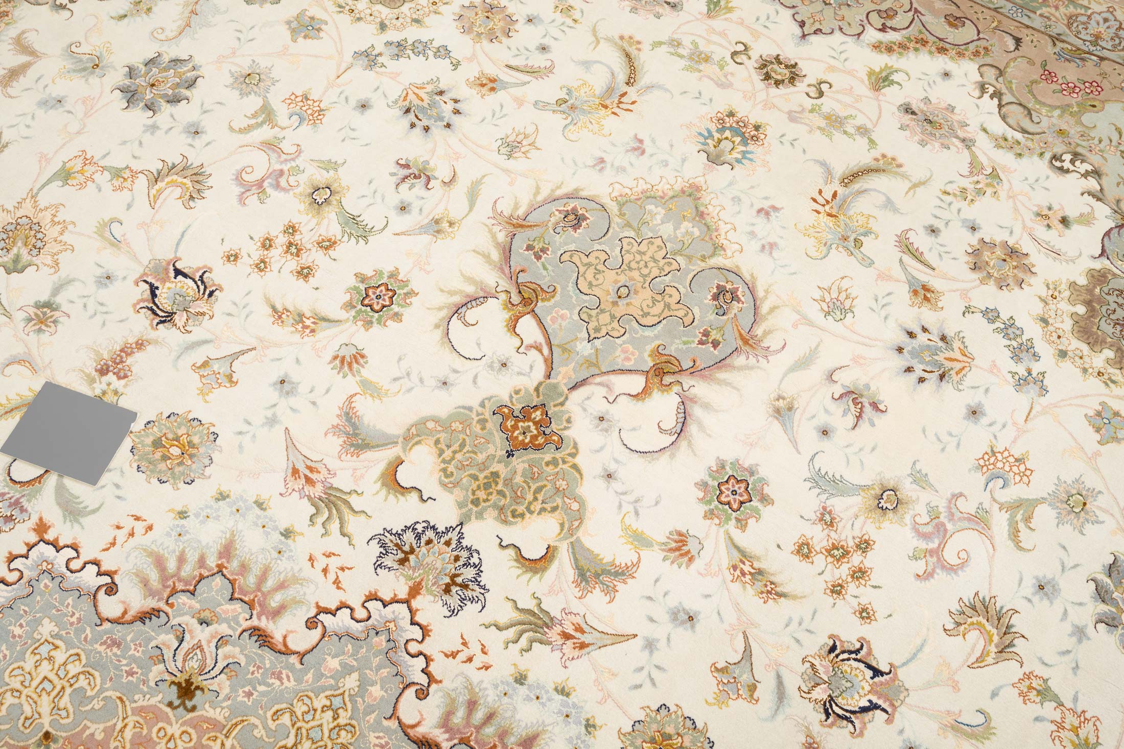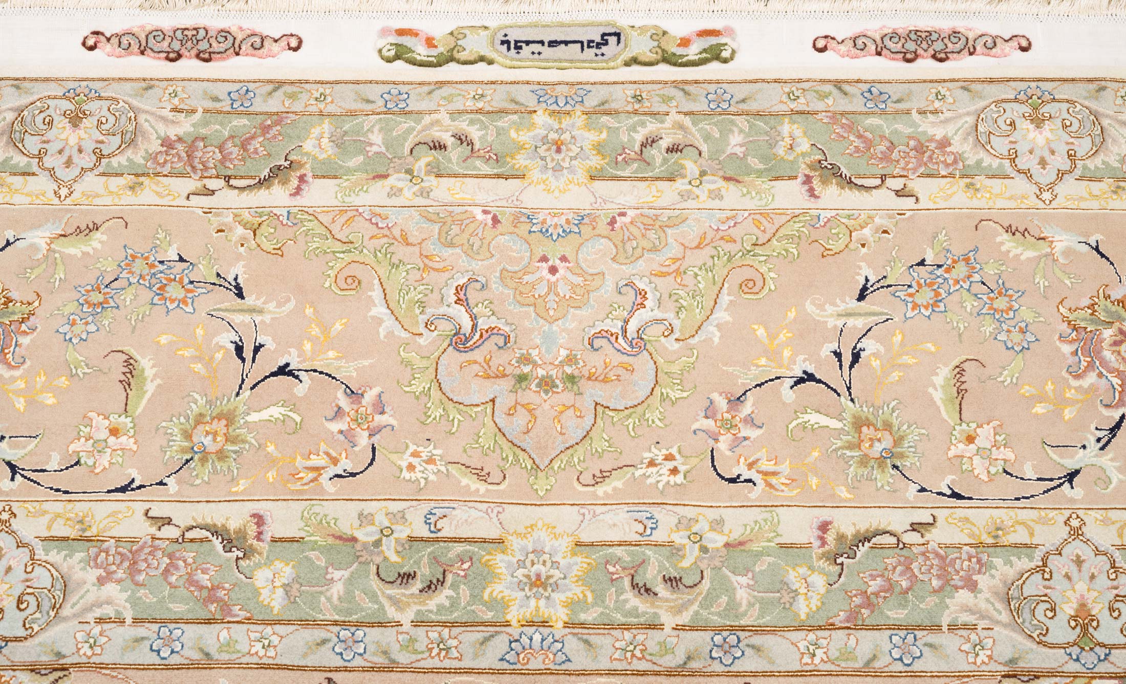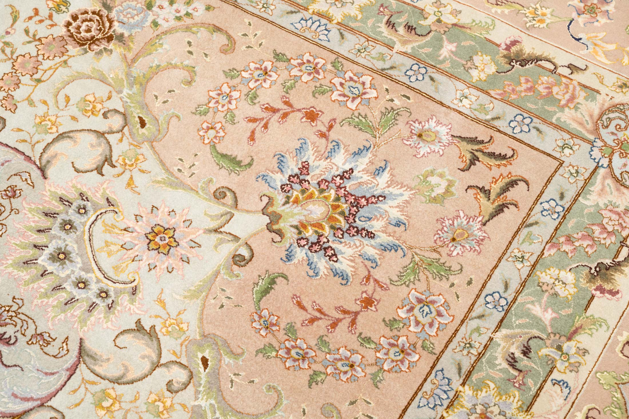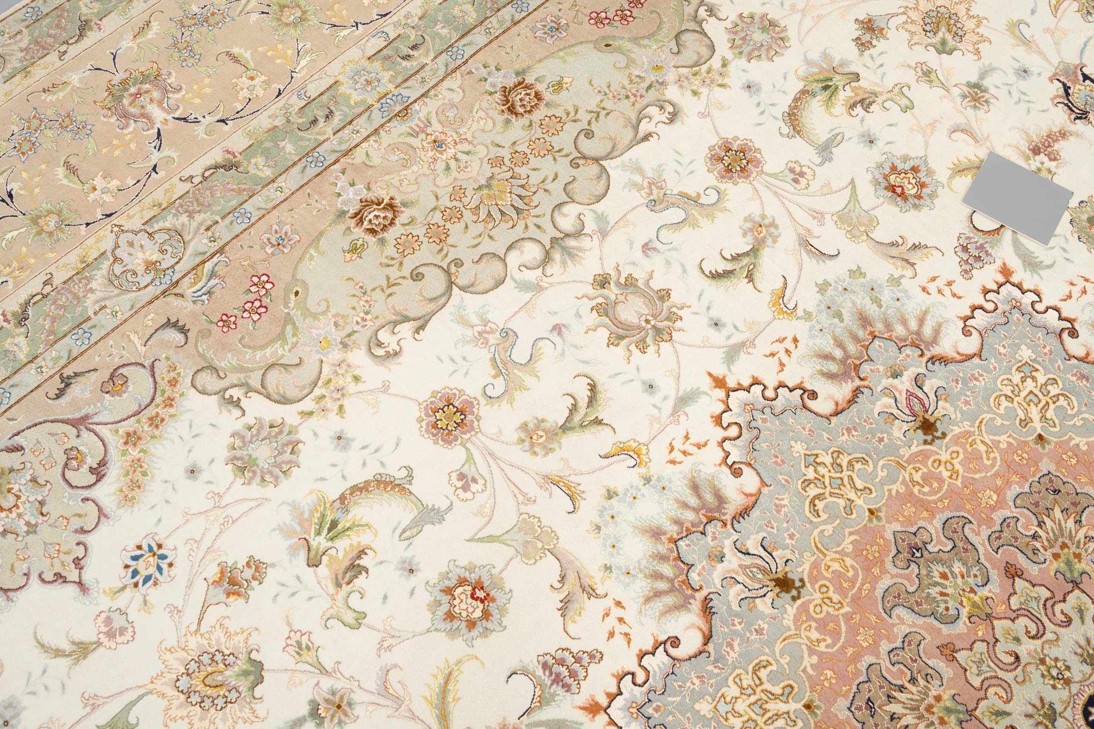 Dieser prachtvolle Täbriz-Teppich erstrahlt in einem harmonischen Zusammenspiel aus ruhigen, erdigen Tönen. Die Hauptfarbe ist ein sanftes Creme, das von zarten Pastellrosé- und Olivtönen ergänzt wird. Die kunstvolle Musterung besticht durch dichte florale Motive und große Palmetten, die dem Teppich eine elegante und lebendige Ausstrahlung verleihen. Handgeknüpft aus hochwertiger Korkwolle auf einer Basis aus natürlicher Seide, zeichnet sich dieser Teppich durch seine außergewöhnliche ...mehr Beschreibung