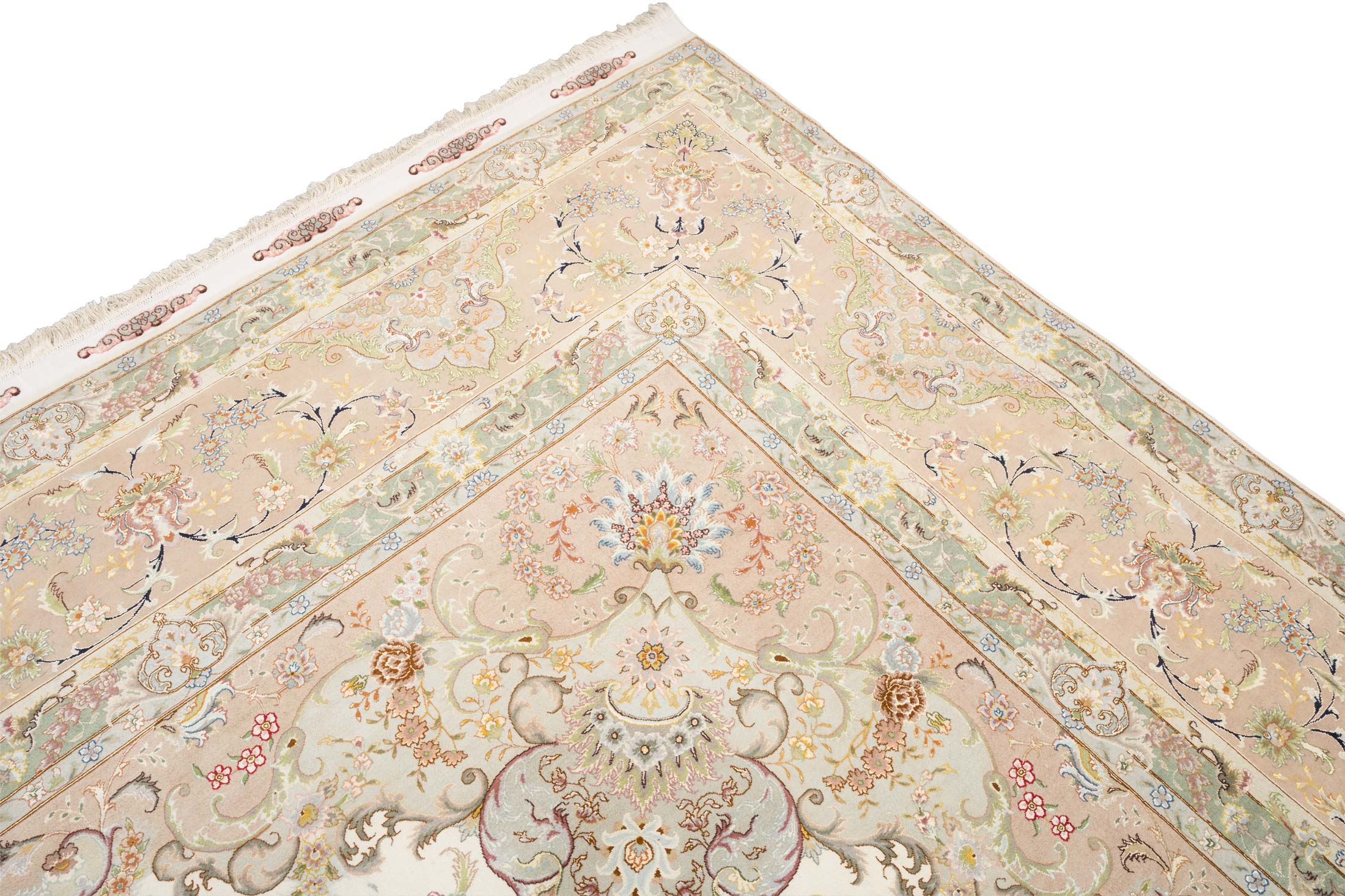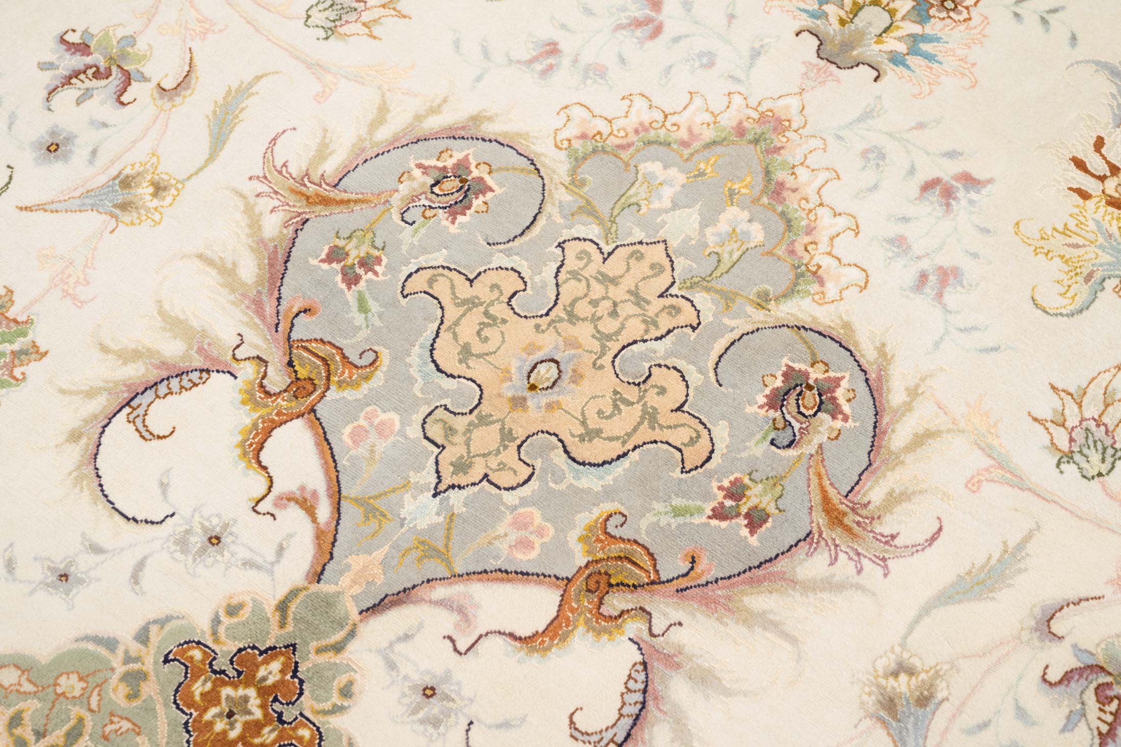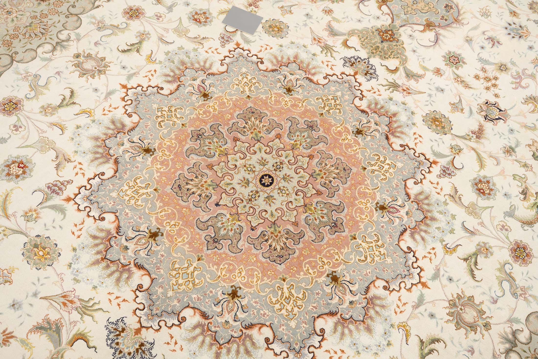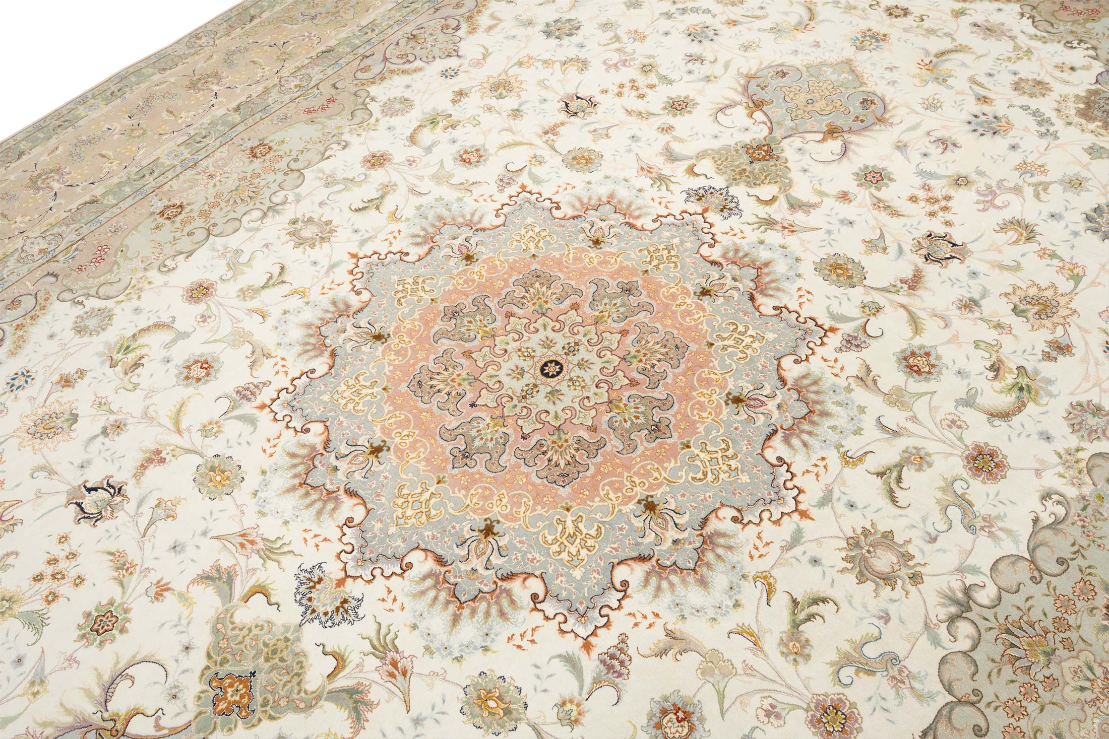 Dieser prachtvolle Täbriz-Teppich erstrahlt in einem harmonischen Zusammenspiel aus ruhigen, erdigen Tönen. Die Hauptfarbe ist ein sanftes Creme, das von zarten Pastellrosé- und Olivtönen ergänzt wird. Die kunstvolle Musterung besticht durch dichte florale Motive und große Palmetten, die dem Teppich eine elegante und lebendige Ausstrahlung verleihen. Handgeknüpft aus hochwertiger Korkwolle auf einer Basis aus natürlicher Seide, zeichnet sich dieser Teppich durch seine außergewöhnliche ...mehr Beschreibung