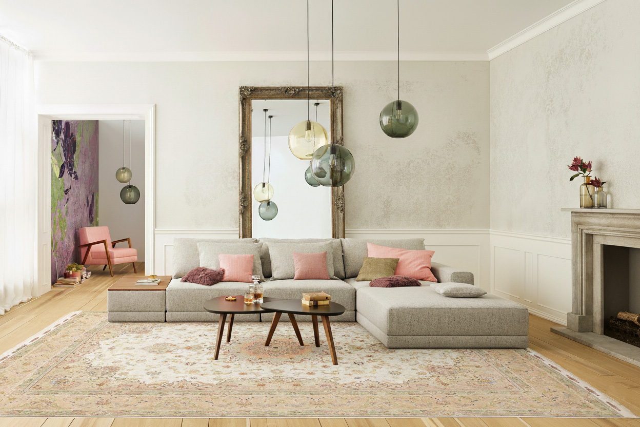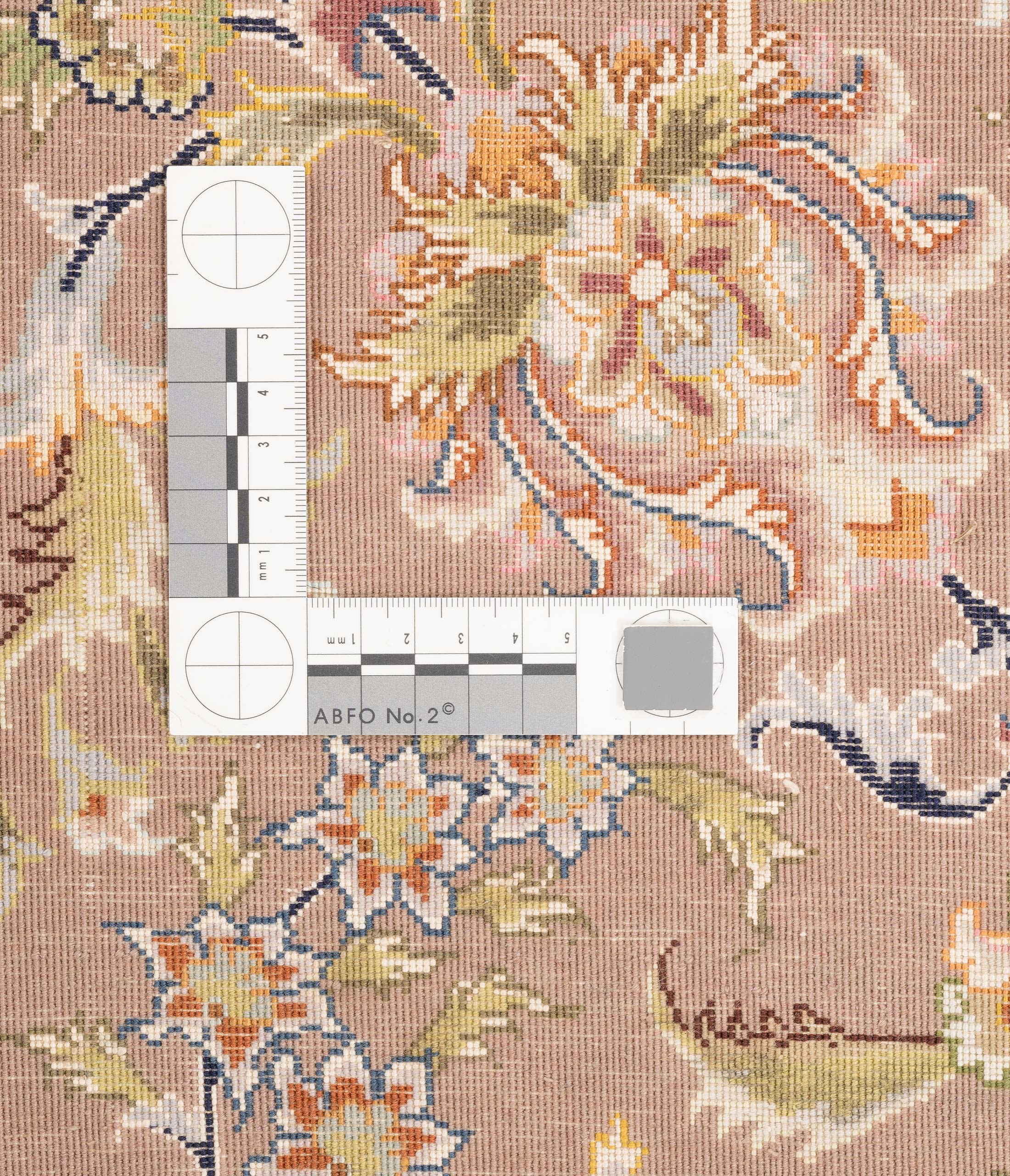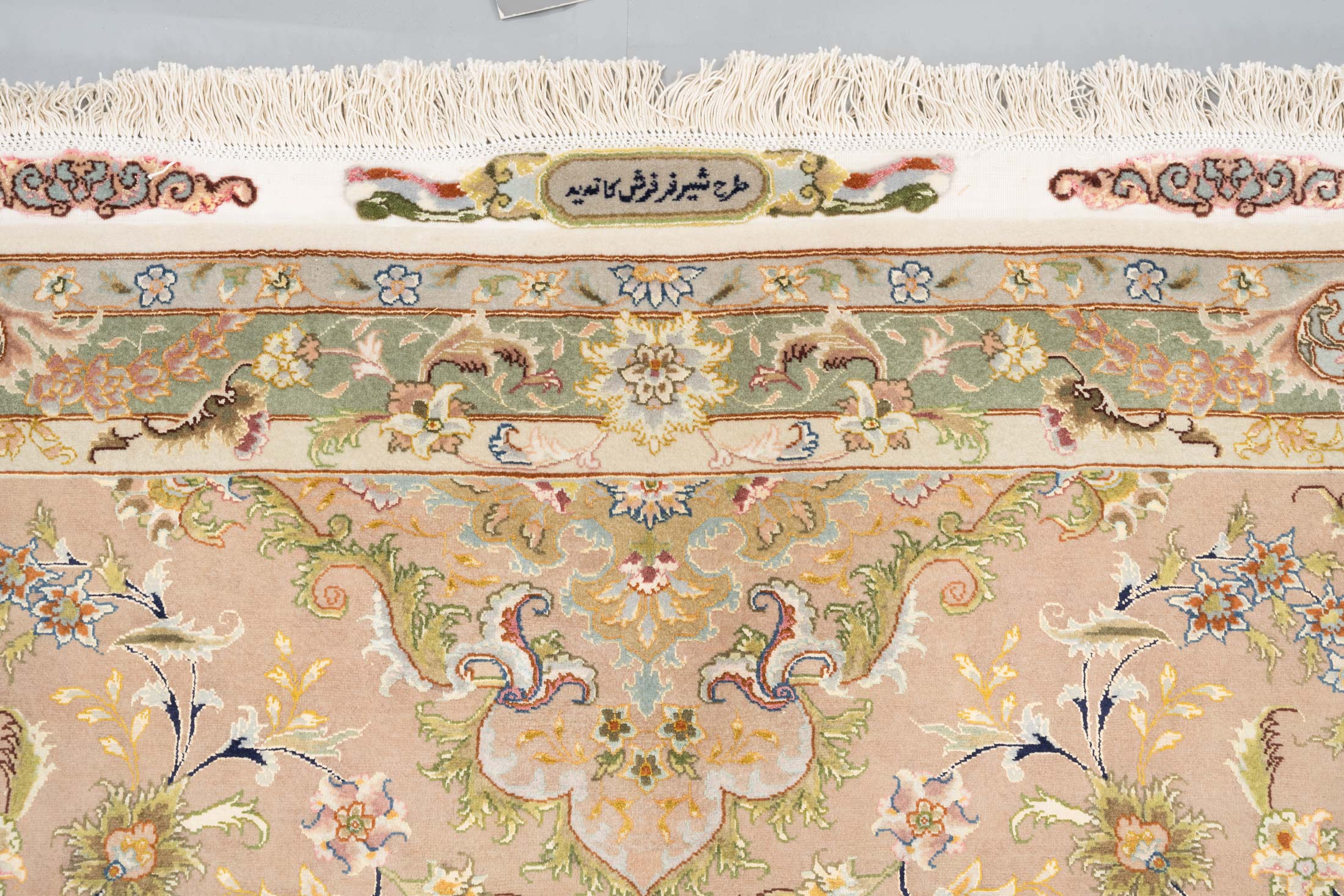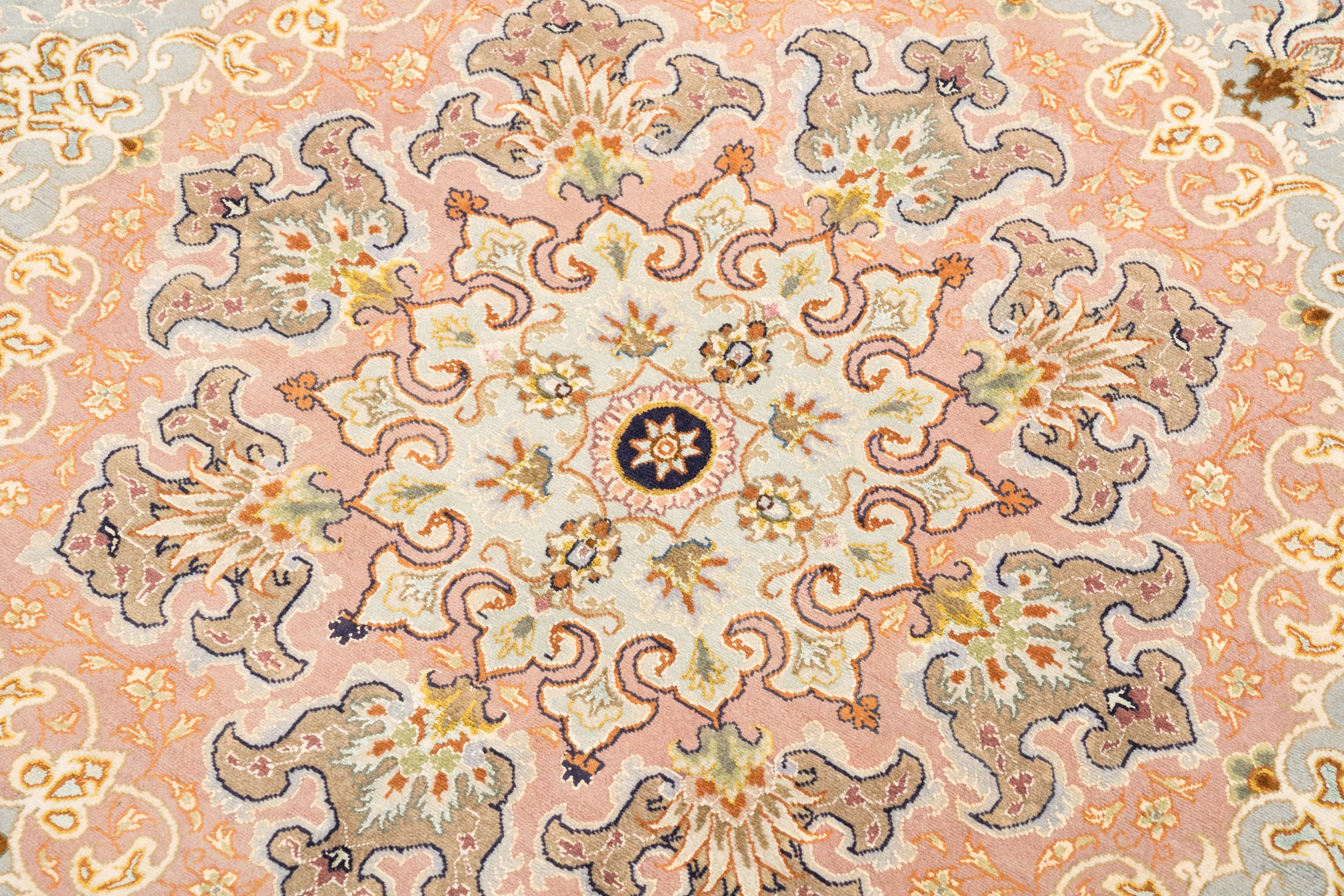 Dieser prachtvolle Täbriz-Teppich erstrahlt in einem harmonischen Zusammenspiel aus ruhigen, erdigen Tönen. Die Hauptfarbe ist ein sanftes Creme, das von zarten Pastellrosé- und Olivtönen ergänzt wird. Die kunstvolle Musterung besticht durch dichte florale Motive und große Palmetten, die dem Teppich eine elegante und lebendige Ausstrahlung verleihen. Handgeknüpft aus hochwertiger Korkwolle auf einer Basis aus natürlicher Seide, zeichnet sich dieser Teppich durch seine außergewöhnliche ...mehr Beschreibung