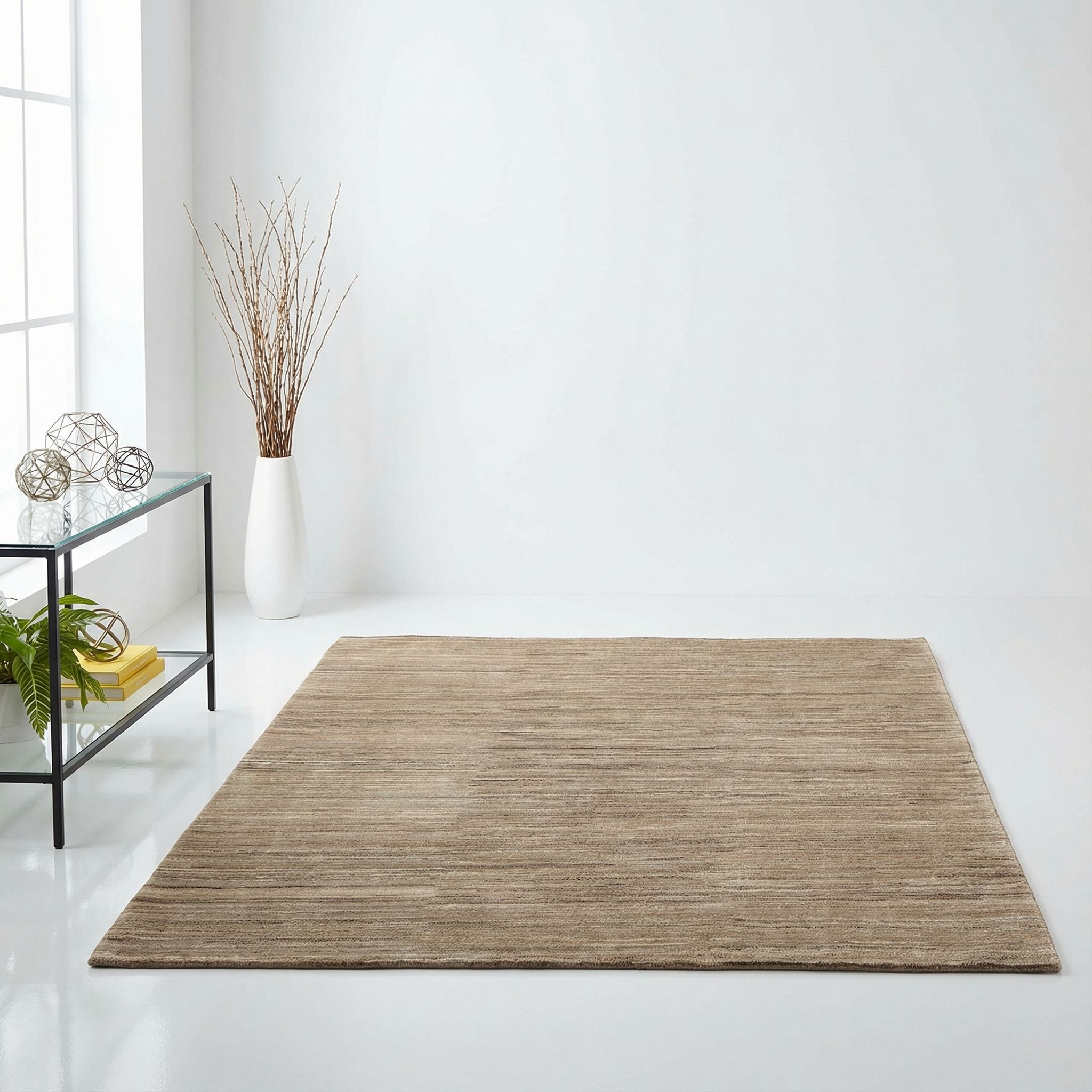Das Muster des Teppichs ist minimalistisch gehalten, mit sanften, horizontalen Streifen, die eine ruhige und moderne Wirkung erzeugen. Diese dezente Musterung lässt den Teppich vielseitig einsetzbar sein, ob in einem modernen oder traditionellen Interieur.