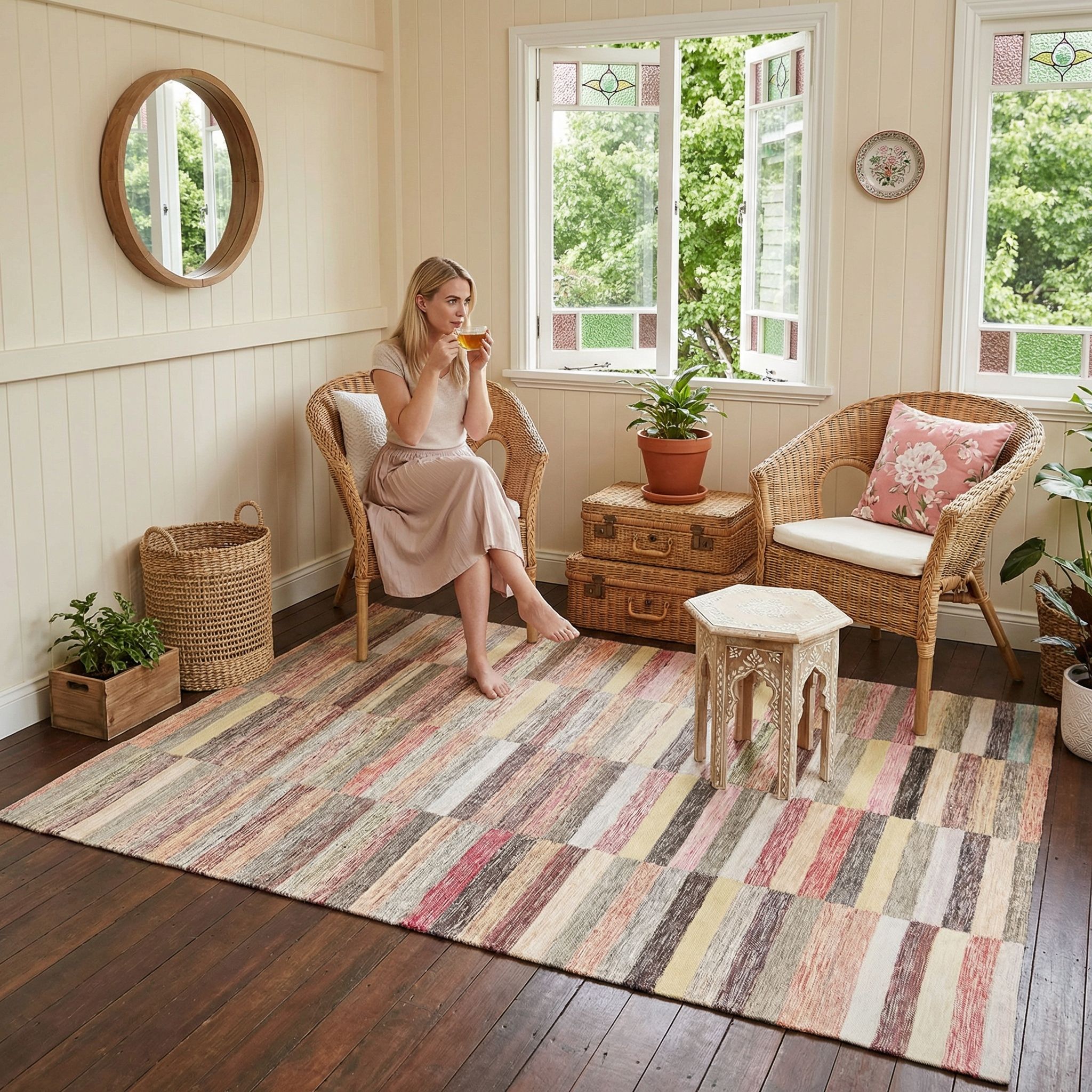 Die sanften, nicht zu grellen Farbtöne dieses Kelims harmonieren wunderbar mit der hellen und freundlichen Atmosphäre des New-Country-Styles. Durch die Verarbeitung von handversponnener Baumwolle bringt der Teppich eine natürliche Haptik mit, die perfekt zu Leinenstoffen und rustikalen Holzmöbeln passt. Das zeitlose Streifendesign lockert das Ambiente auf moderne Weise auf, ohne den ländlichen Charme zu verlieren. Er wirkt wie ein sanfter Farbtupfer, der Ihrem Landhaus-Look eine frische und zugleich behagliche Note verleiht.