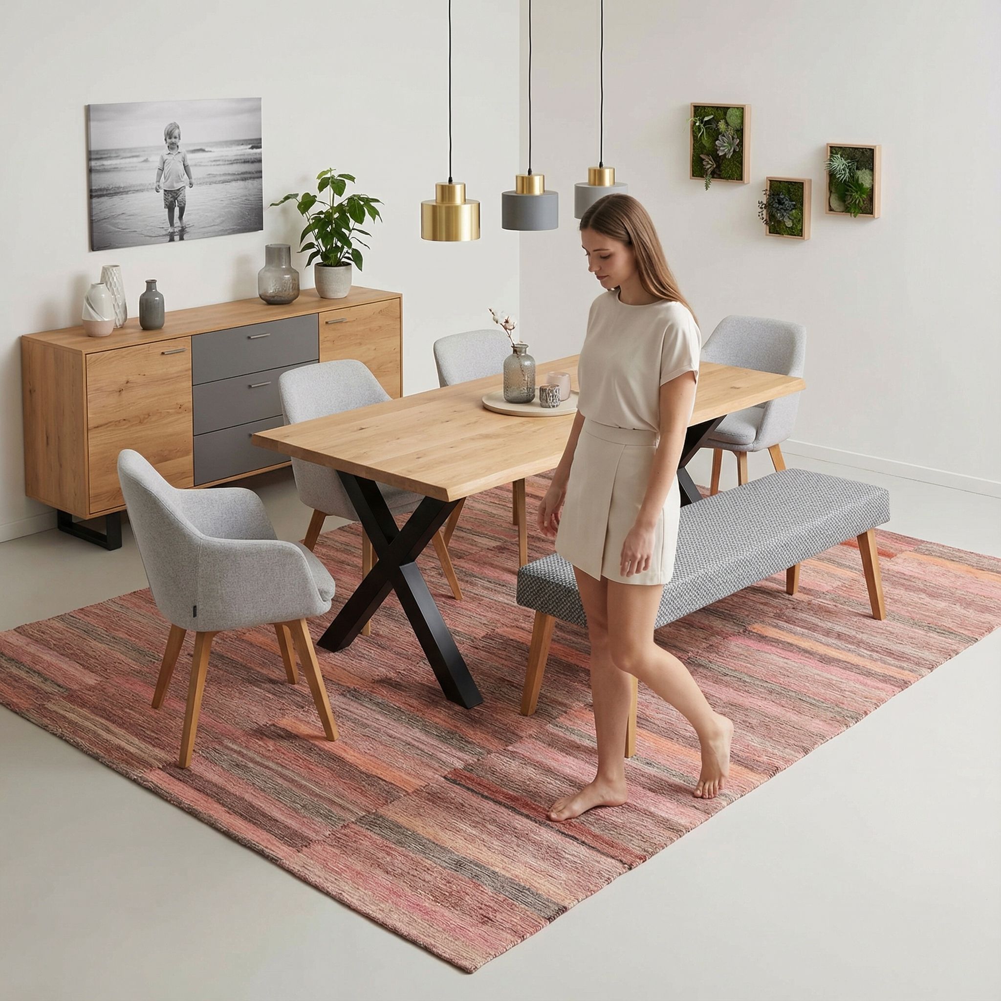 Hier fungiert der Teppich als gekonnter Stilbruch: Seine weiche Haptik und die warmen Naturtöne bilden einen spannenden Kontrast zu den kühlen, rauen Materialien wie Beton, Stahl und Leder des Industrial-Looks. Er nimmt dem Loft-Charakter die Strenge und sorgt für eine notwendige Portion Wohnlichkeit, ohne dabei kitschig zu wirken. Das lineare Streifenmuster greift die grafische Ordnung des Industriestils auf, während die handversponnene Wolle die Akustik in weitläufigen Räumen angenehm dämpft. Dieser Webkelim verwandelt eine kühle Fabrik-Atmosphäre in ein Zuhause mit Charakter und beweist dabei absolutes Stilbewusstsein.