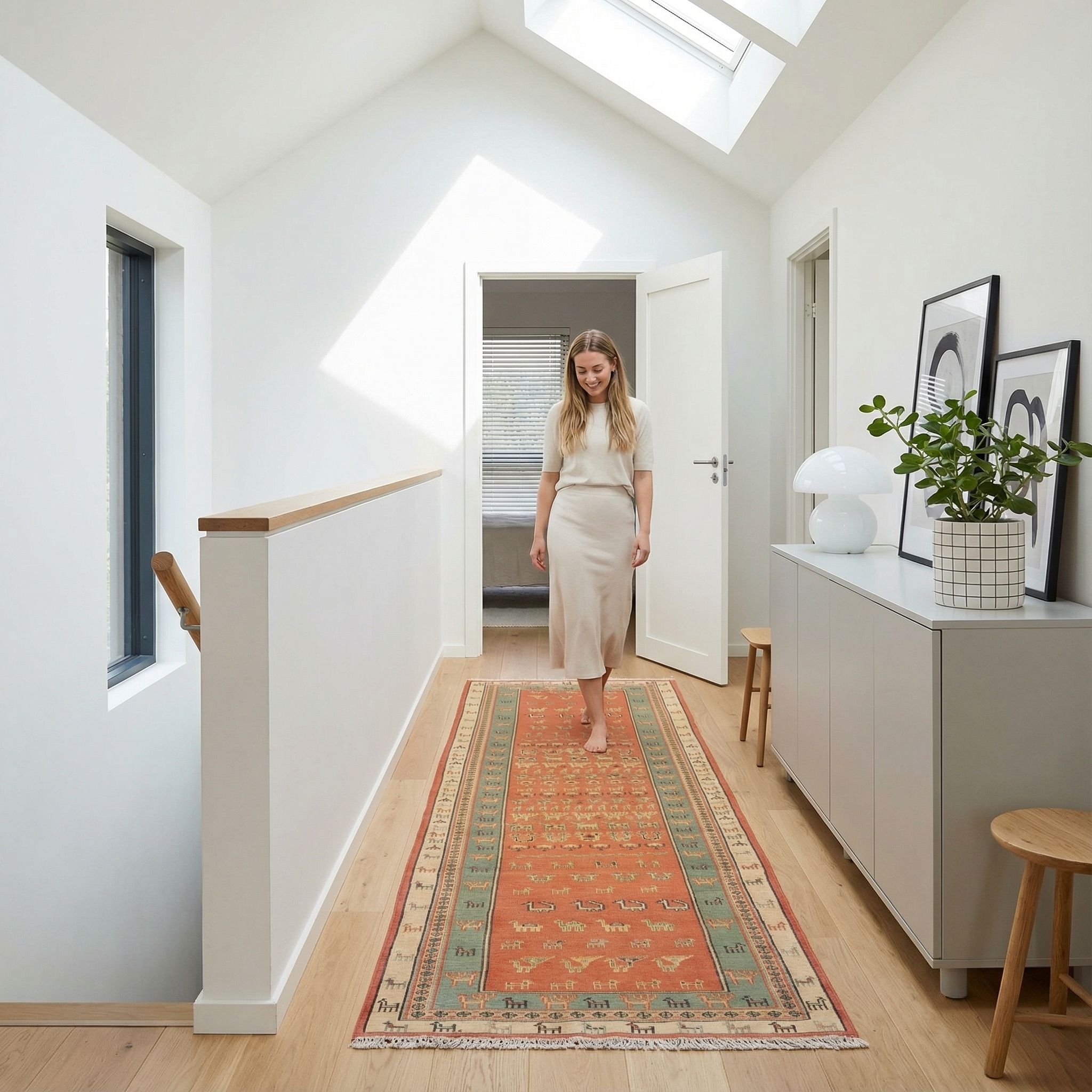 Dieser hochwertige Sumack-Kelim bricht die kühle Zurückhaltung des skandinavischen Stils auf elegante Weise und bringt als hochwertiger Akzent die notwendige Portion „Hygge“ in Ihre Räume. Die natürlichen Materialien und die sanften, erdigen Farbtöne passen perfekt zur nordischen Vorliebe für Nachhaltigkeit und organische Texturen, ohne die visuelle Ruhe des Raumes zu stören. Als farblicher Fokuspunkt auf hellen Böden belebt der Läufer das schlichte Design und verleiht dem oft minimalistischen Interieur eine einladende Wärme und Tiefe. Die feine Handarbeit und die spürbare Qualität der Wolle unterstreichen zudem den skandinavischen Anspruch an langlebiges und funktionales Design.