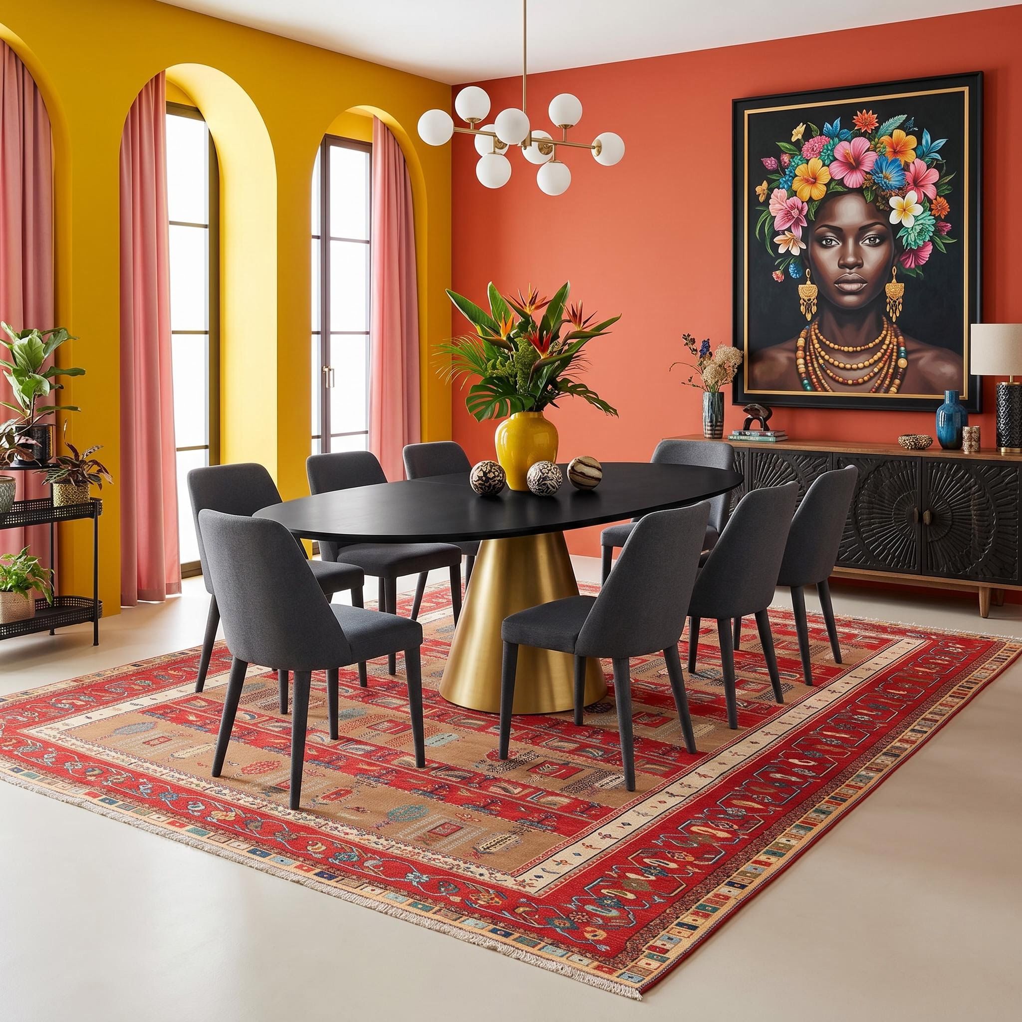 In einem Loft mit Sichtbeton, Metall und offenem Mauerwerk wirkt dieser Afschar-Tabii als kraftvoller, weicher Gegenpol, der dem rauen Industrie-Charme wohnliche Wärme verleiht. Die kräftigen Rot- und Terrakottatöne der Pflanzenfarben leuchten besonders intensiv vor grauen Hintergründen und nehmen dem Raum die industrielle Kälte, ohne ihm die Coolness zu nehmen. Dank seiner außergewöhnlichen Strapazierfähigkeit und der festen Sumack-Wickeltechnik ist er „tough“ genug, um in diesem maskulinen und rohen Umfeld zu bestehen. Er ist das verbindende Element, das Geschichte und Handwerk in die urbane Moderne holt und den Raum akustisch sowie optisch beruhigt.