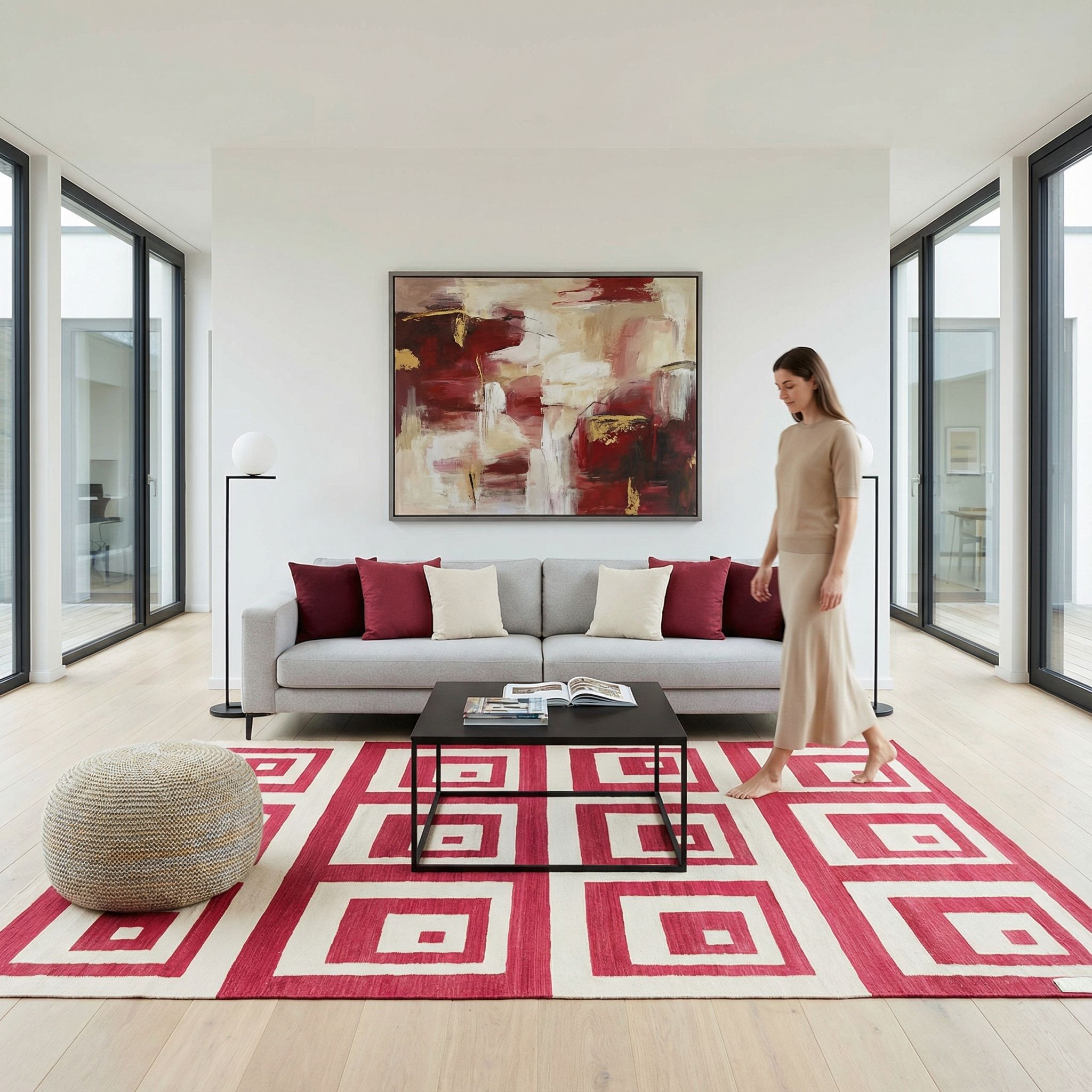 Dieser handgewebte Kelim aus Afghanistan, bekannt als Tavis, besticht durch seine lebendige Farbpalette und hochwertige Materialien. Die Hauptfarbe ist ein kräftiges Rubinrot, das die geometrischen Muster in Form von Quadraten und Rechtecken definiert. Diese Rotnuance wird durch ein sanftes Cremeweiß ergänzt, das den Kontrast betont und die Muster hervorhebt. Die Kombination dieser Farben verleiht dem Teppich eine moderne, aber zeitlose Ästhetik, die sowohl an die Werke von Künstlern wie ...mehr Beschreibung