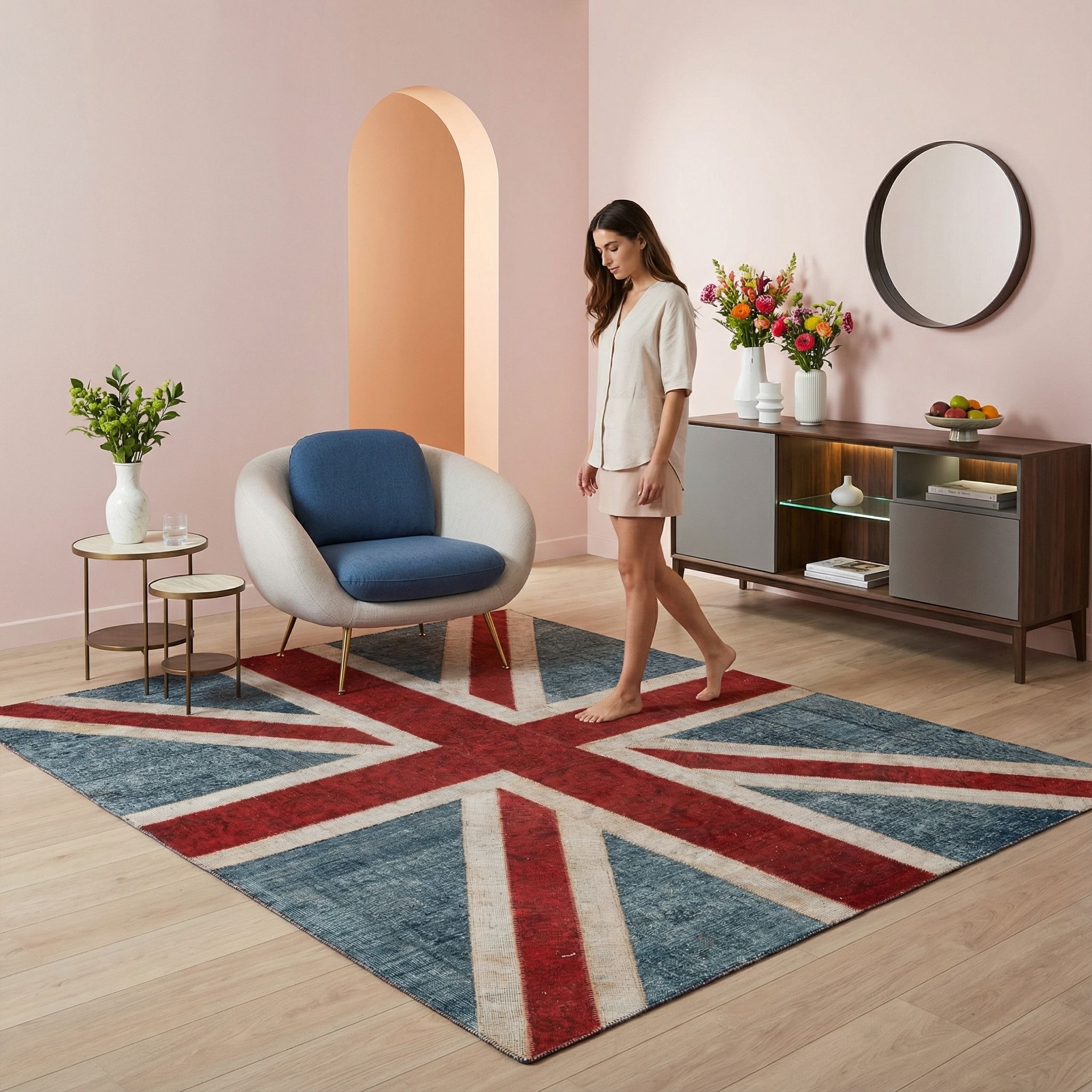 Dieser handgeknüpfte Patchwork-Teppich aus Persien besticht durch seine kunstvolle Kombination aus tiefem Rot, elegantem Blau und cremefarbenen Akzenten. Die Hauptfarbe, ein kräftiges Rot, verleiht dem Teppich eine warme und einladende Ausstrahlung, während das Blau als Kontrast für eine moderne Note sorgt. Die cremefarbenen Elemente fügen sich harmonisch ein und sorgen für ein ausgewogenes Gesamtbild. Das Muster erinnert an das ikonische Design des Union Jack, was dem Teppich eine ...mehr Beschreibung