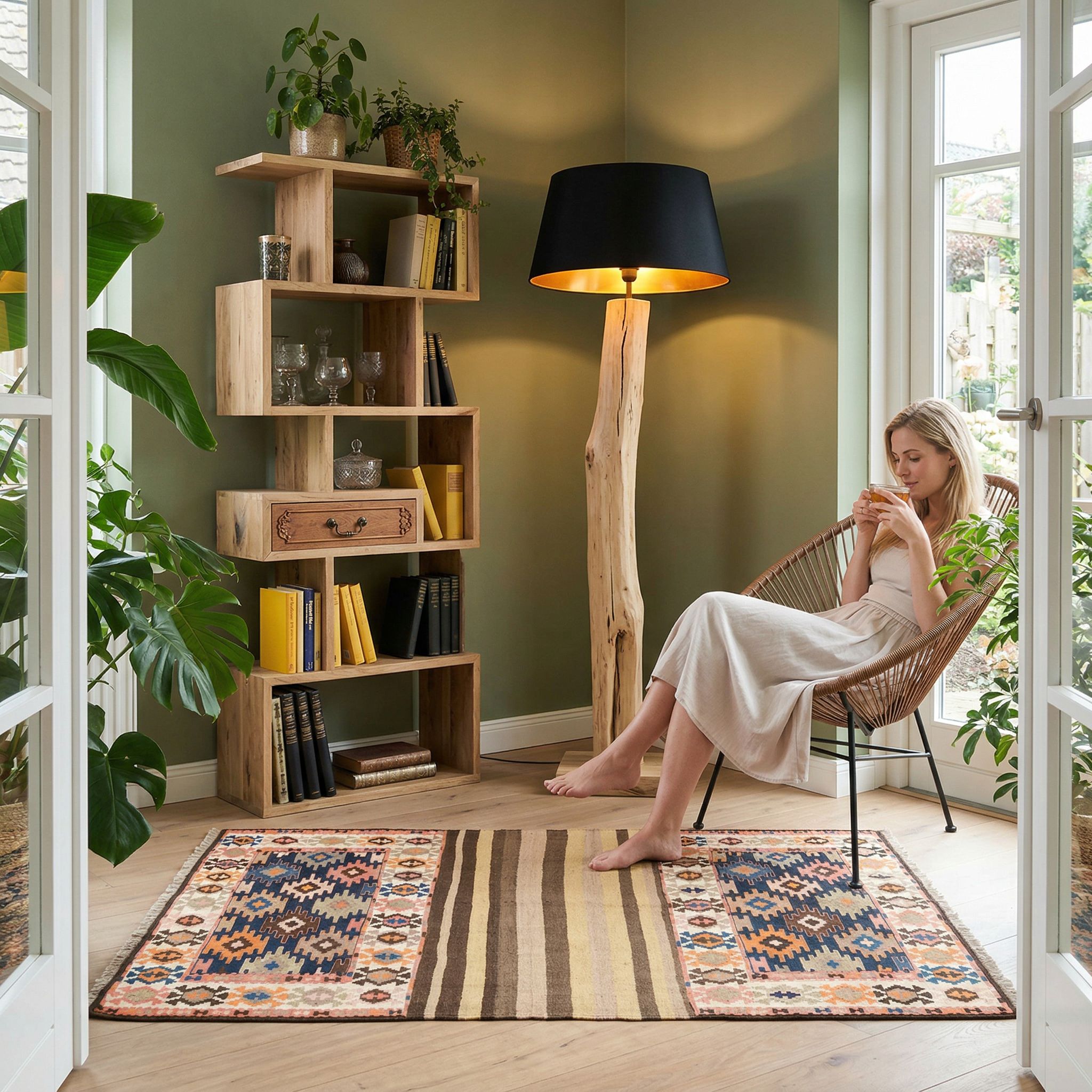 In einem nordisch reduzierten Ambiente wirkt dieser Kelim als wärmender Anker, der die kühle Zurückhaltung des Skandi-Designs mit seiner textilen Haptik und den erdigen Streifen sanft aufbricht. Die klare Geometrie der Schahsawan-Muster korrespondiert hervorragend mit der schlichten Formsprache skandinavischer Möbel, während die Naturfarben die Helligkeit des Raumes nicht schlucken, sondern erden. Die feine Webarbeit sorgt dafür, dass der Teppich nicht wuchtig wirkt, sondern sich leicht und elegant in das Konzept von „Hygge“ einfügt. Er bringt genau die richtige Dosis an Farbe und handwerklicher Struktur ein, um einem puristischen Raum Persönlichkeit und Wohnlichkeit zu verleihen.