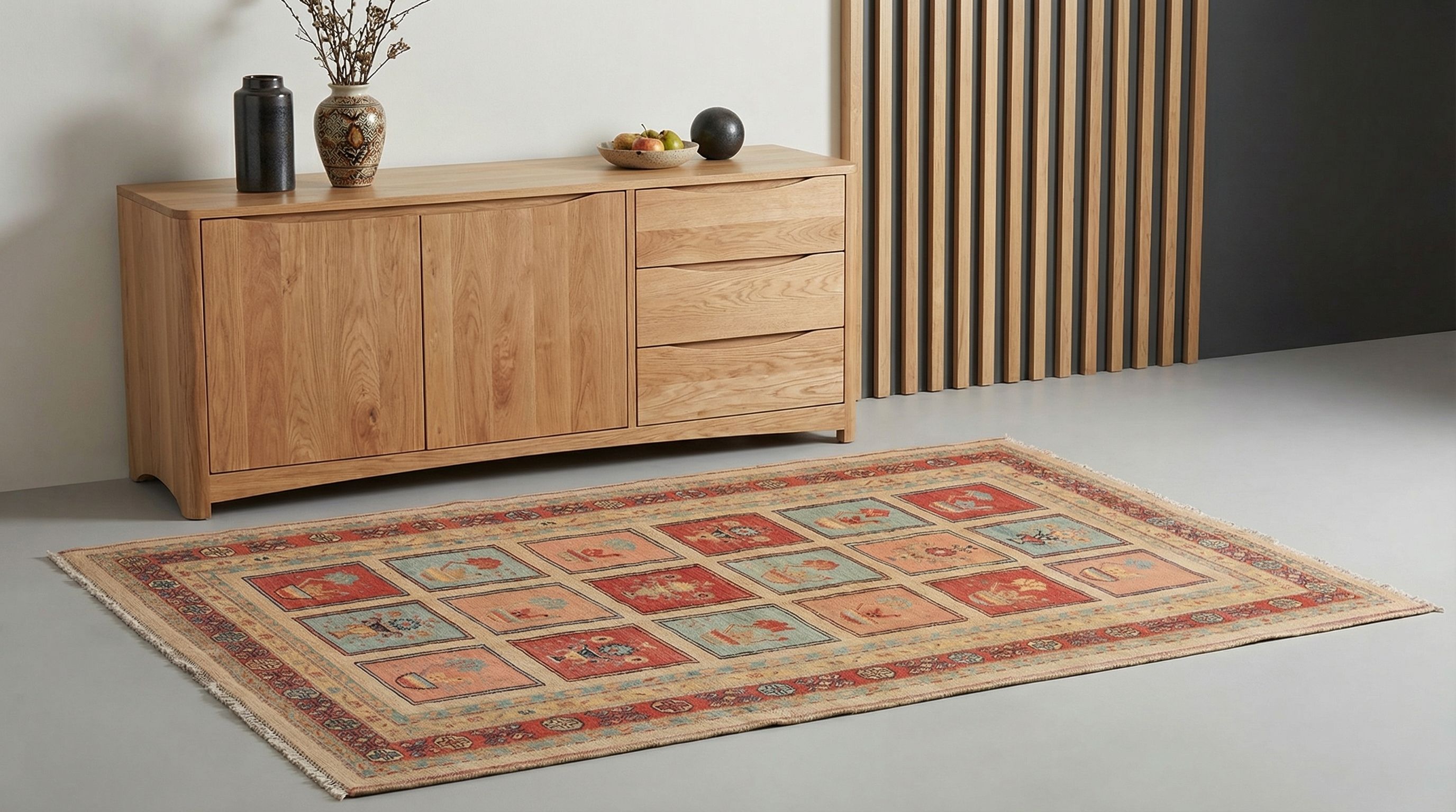 Dieser Afschar-Tabii Sumackkelim besticht durch seine Hauptfarbe, ein warmes Ziegelrot, das sich harmonisch mit Akzenten in Blaugrün, Beige und einem sanften Ockerton ergänzt. Die kunstvollen Muster sind in traditioneller persischer Volkskunst gestaltet und zeigen florale sowie geometrische Elemente, die dem Teppich einen lebendigen und zugleich klassischen Charakter verleihen.Gefertigt aus handversponnener Schafwolle und gefärbt mit natürlichen Pflanzenfarben, bietet dieser Kelim ...