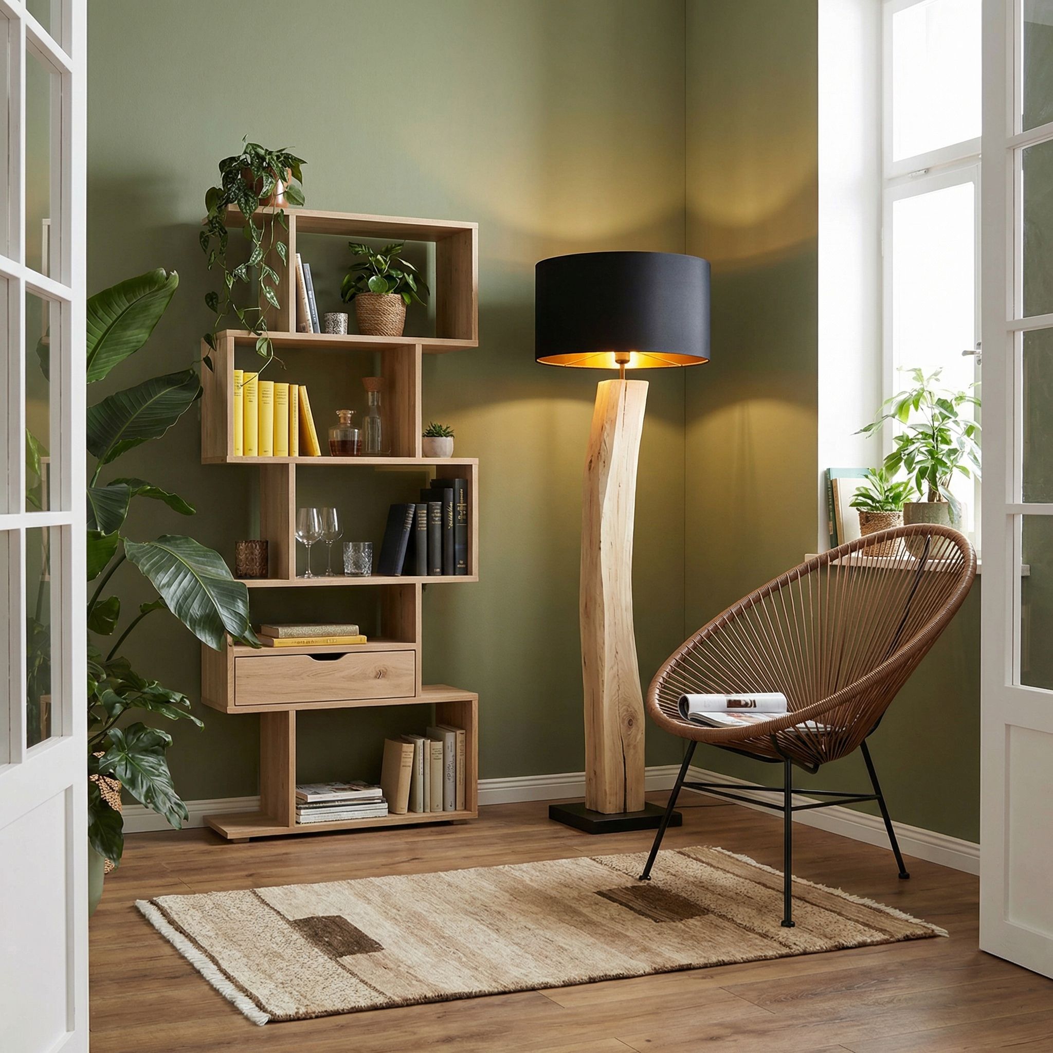 Der Boho-Style lebt von Unkonventionalität und künstlerischer Freiheit, was sich in diesem Teppich widerspiegelt, da die Knüpfer ohne starre Vorlage arbeiten und jedes Stück ein individuelles Unikat ist. Die organische Struktur der handgesponnenen Wolle und die lebendigen Farbunterschiede im Material verleihen dem Raum jene entspannte, unperfekte Perfektion, die den Bohème-Look ausmacht. Er bildet einen ruhigen, erdenden Gegenpol zu oft bunten Kissen, Makramee oder vielen Pflanzen und bringt durch seine nomadische Herkunft ein authentisches Flair mit. Die Verwendung rein natürlicher Materialien ohne industrielle Massenfertigung passt zudem perfekt zum oft nachhaltigen Bewusstsein, das mit diesem Wohnstil einhergeht.