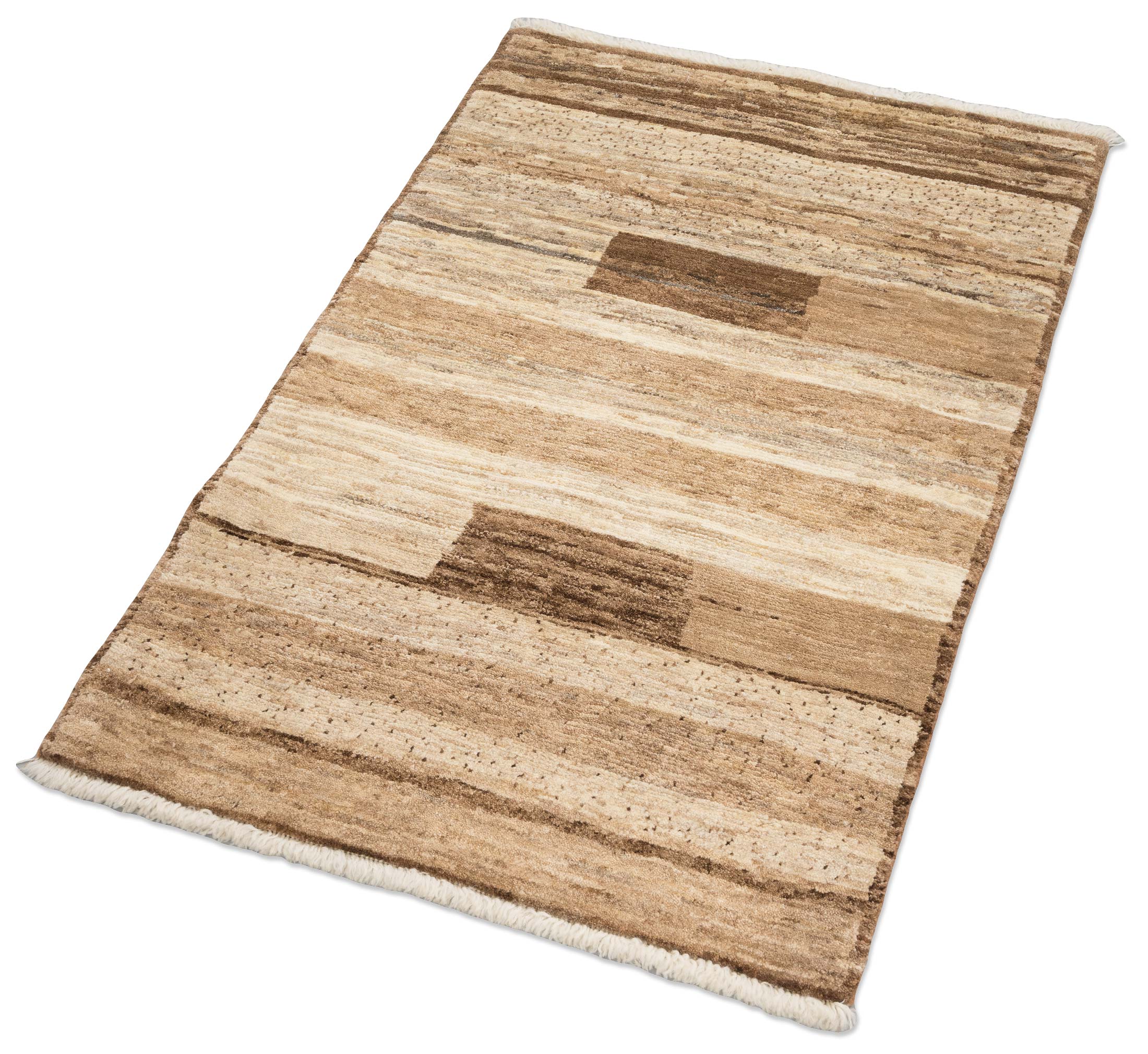 Dieser handgeknüpfte Bidjar-Novum-Teppich präsentiert sich in einem warmen Beigeton als Hauptfarbe, ergänzt durch harmonische Akzente in Hellbraun und Creme. Das Gesamtdesign besteht aus horizontalen Streifen, die in verschiedenen Breiten verlaufen und dem Teppich eine moderne und zugleich zeitlose Erscheinung verleihen. Die Musterung wirkt beruhigend und strukturiert, wobei die natürlichen Farbnuancen der handversponnenen Schafwolle aus dem persischen Kurdistan besonders zur Geltung ...mehr Beschreibung