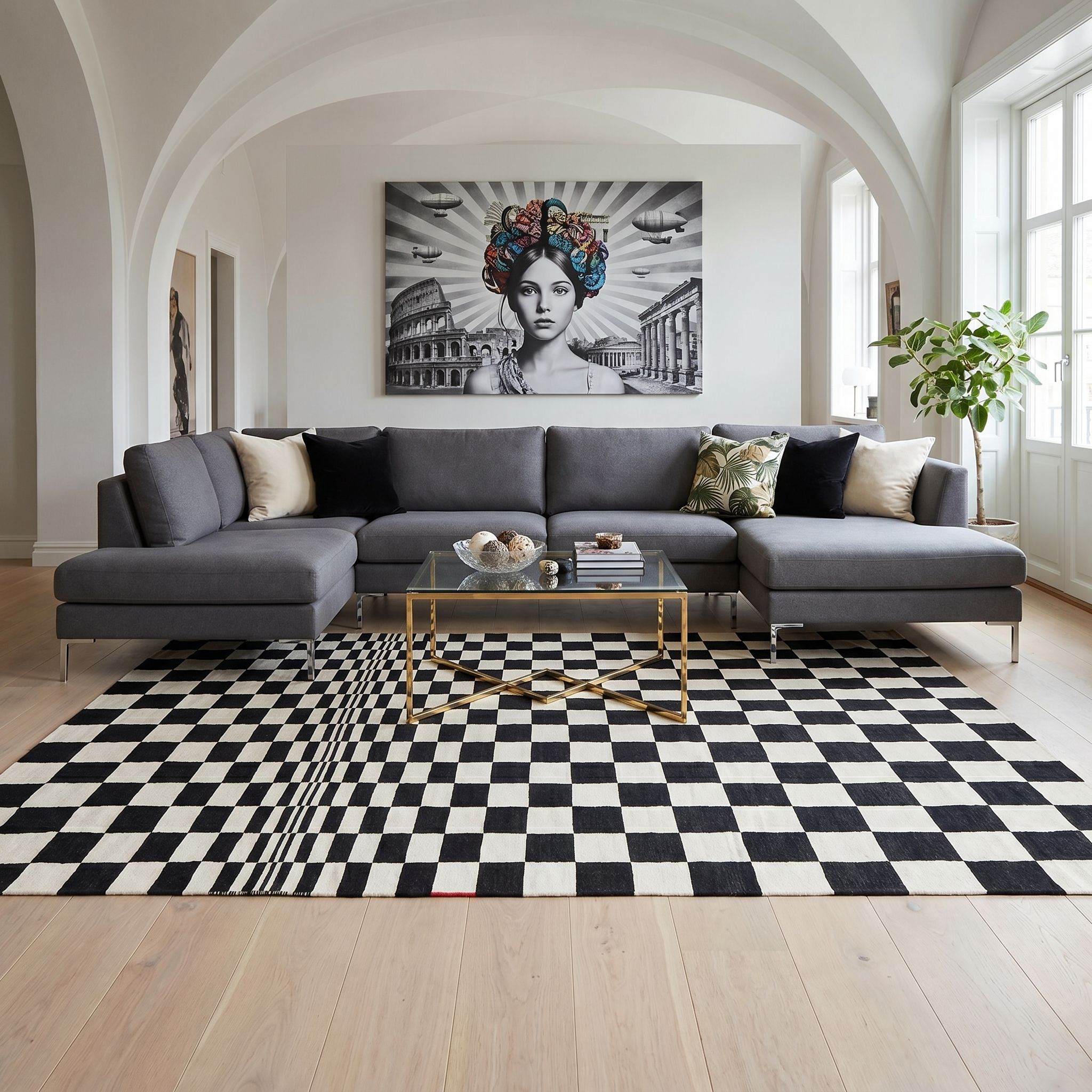 Als bewusster Stilbruch eingesetzt, verleiht dieser grafische Webkelim einem glamourösen Ambiente eine unerwartete, künstlerische Avantgarde-Note. Die klassische Schwarz-Weiß-Kombination harmoniert exzellent mit goldenen Accessoires, Samtsofas oder Marmortischen und erdet den Prunk durch seine geometrische Strenge. Anstatt im Kitsch zu versinken, erhält der Raum durch die Anlehnung an die moderne Kunst eine intellektuelle und kuratierte Eleganz. Die feine Verarbeitung der handversponnenen Wolle unterstreicht dabei den Anspruch an höchste Qualität und Luxus, den der Glam-Style fordert.