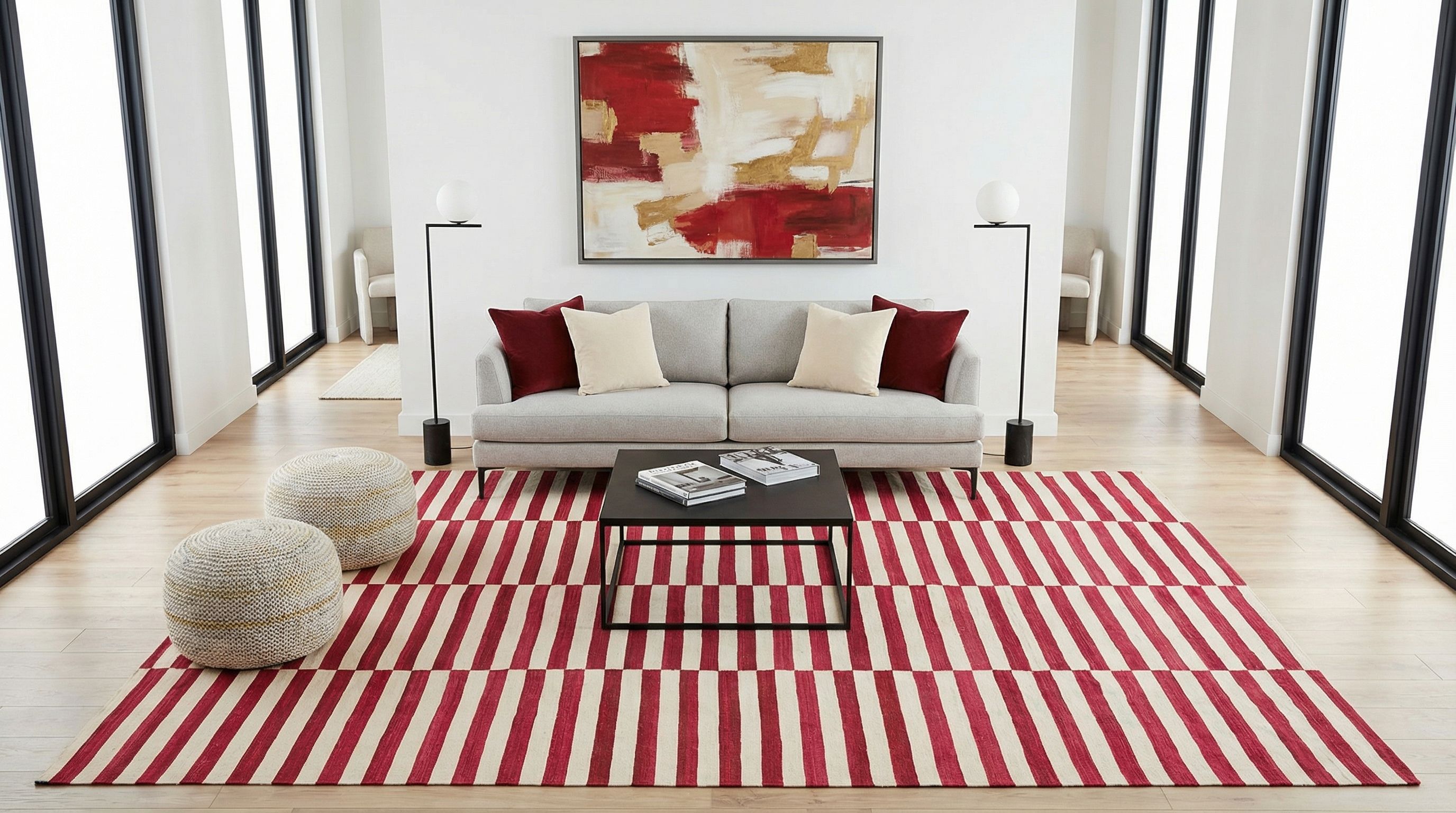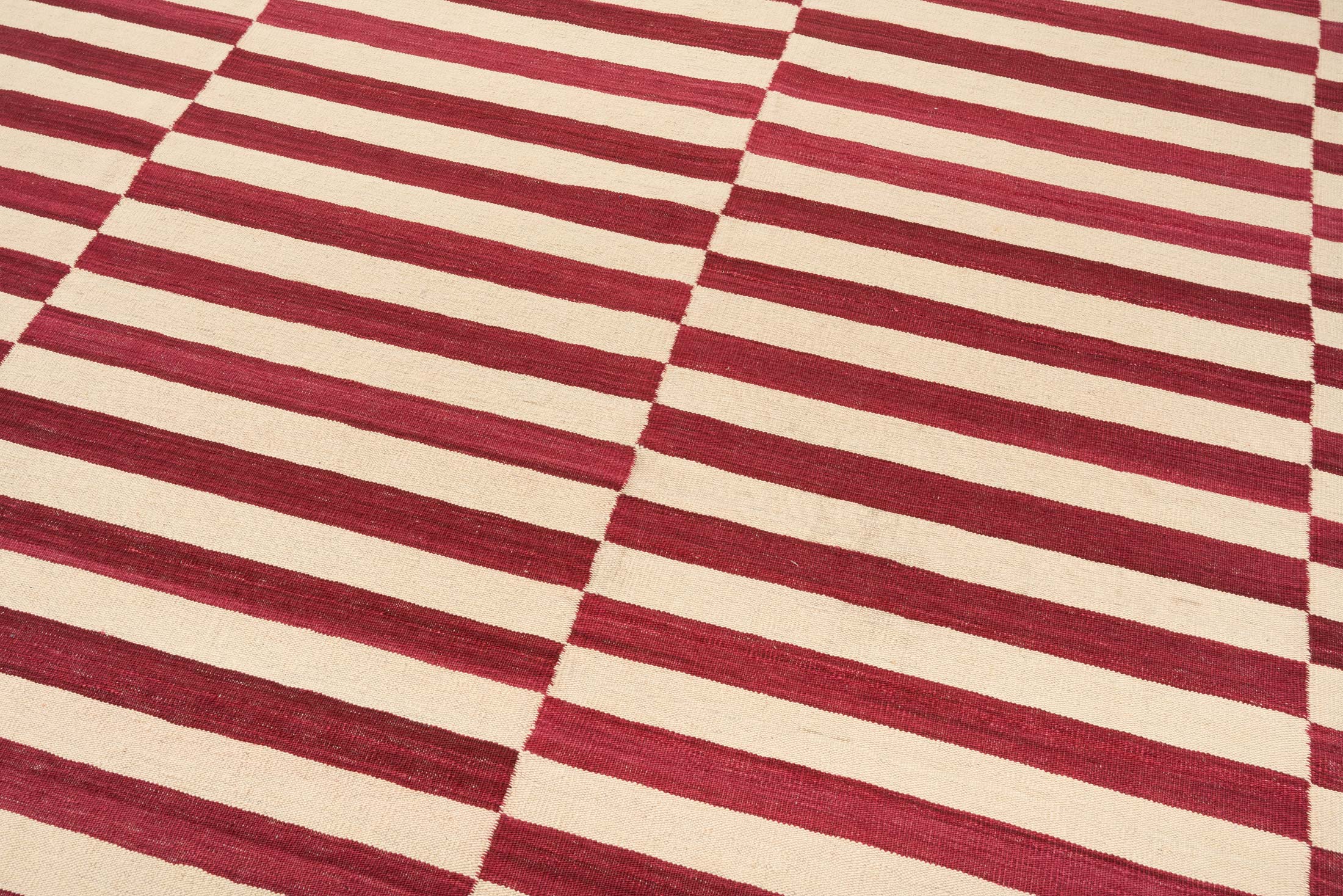 Hier präsentieren wir einen handgewebten Kelim aus Afghanistan, der durch seine moderne und dennoch traditionelle Anmutung besticht. Die Hauptfarbe dieses Teppichs ist ein kräftiges Rot, das durch seine Wärme und Tiefe beeindruckt. Ergänzt wird dieses durch ein sanftes Beige, das den Kontrast zu den dominanten Rotstreifen bildet. Diese harmonische Kombination wird durch subtile Akzente in einem etwas dunkleren Rot und einem Hauch von Creme abgerundet, die dem Gesamtbild eine zusätzliche ...mehr Beschreibung