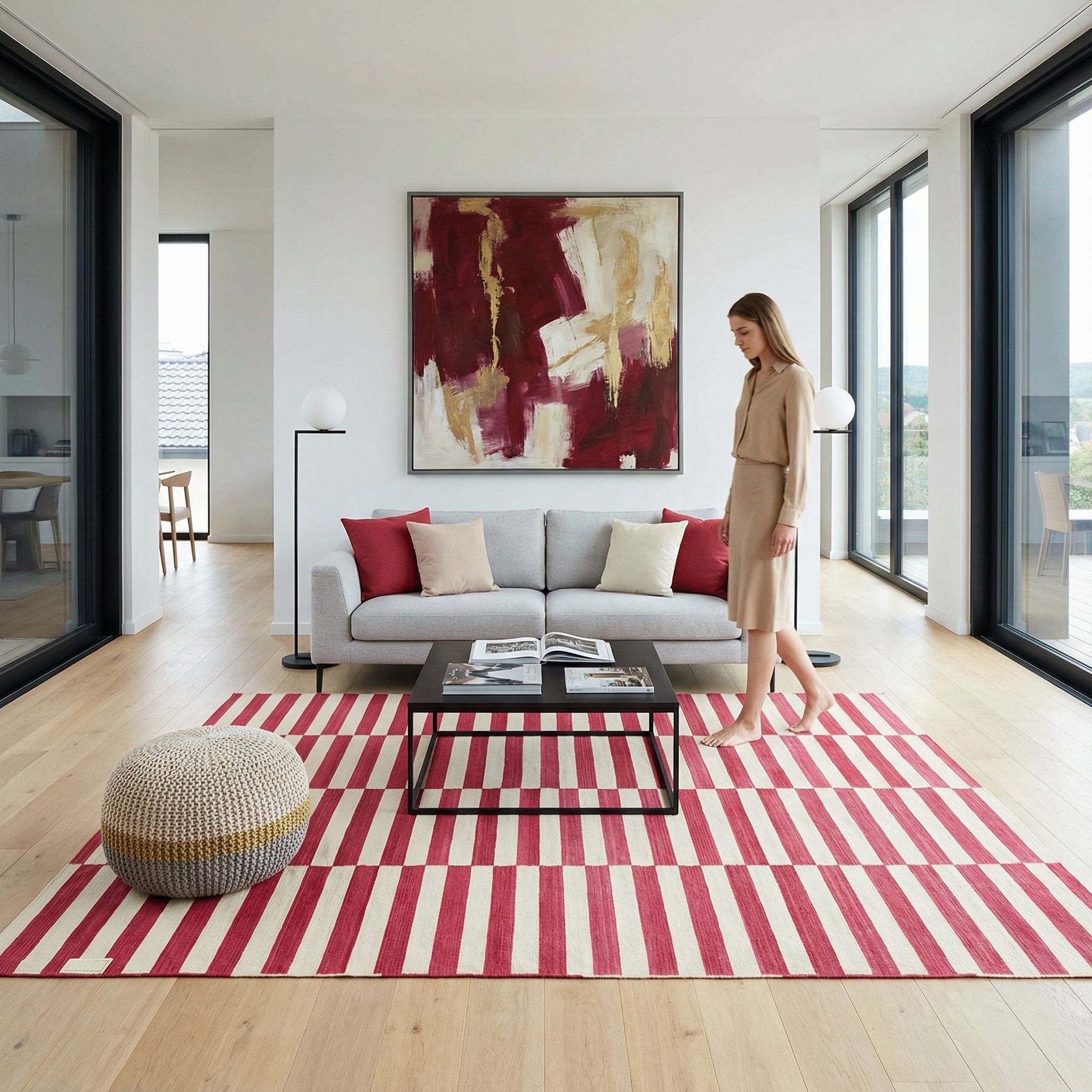 Im skandinavischen Design, das Klarheit, Licht und Natürlichkeit liebt, setzt dieser Webkelim einen kraftvollen und doch harmonischen Farbakzent, der den Raum belebt. Die grafische Strenge des Musters korrespondiert hervorragend mit der schlichten Formensprache nordischer Möbel, während das warme Rot für die im Norden so geschätzte Behaglichkeit sorgt. Durch die von Natur aus schmutzabweisenden Eigenschaften der hochwertigen Schafschurwolle ist der Teppich nicht nur ein optisches Highlight, sondern auch ein funktionaler und langlebiger Begleiter für das „Hygge“-Gefühl. Er beweist eindrucksvoll, dass minimalistisches Wohnen und ausdrucksstarke Kunstfertigkeit eine perfekte Symbiose eingehen können.