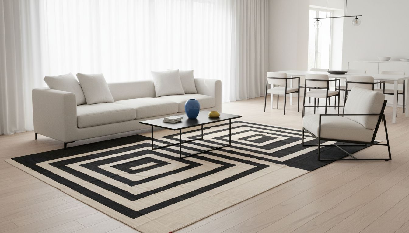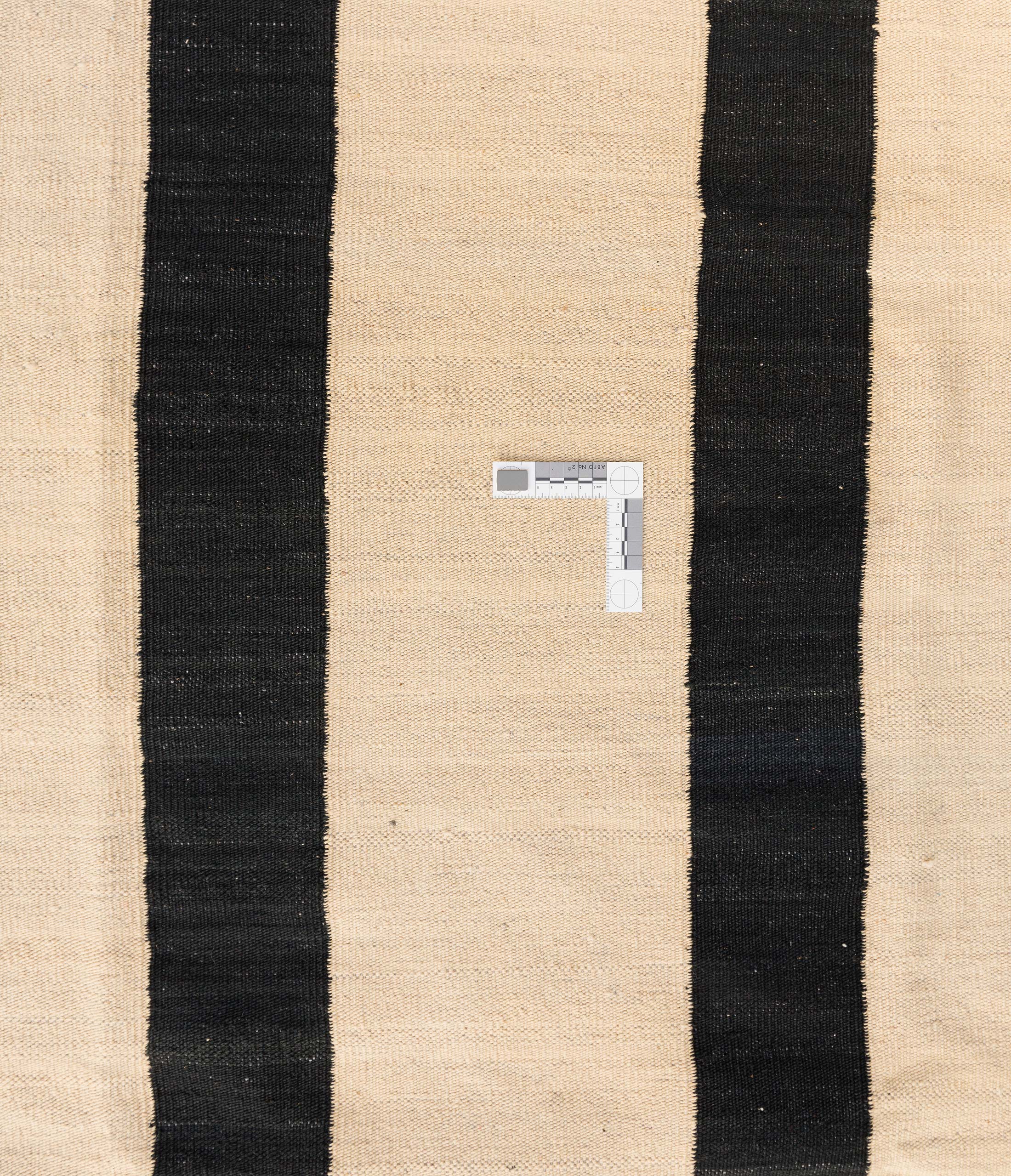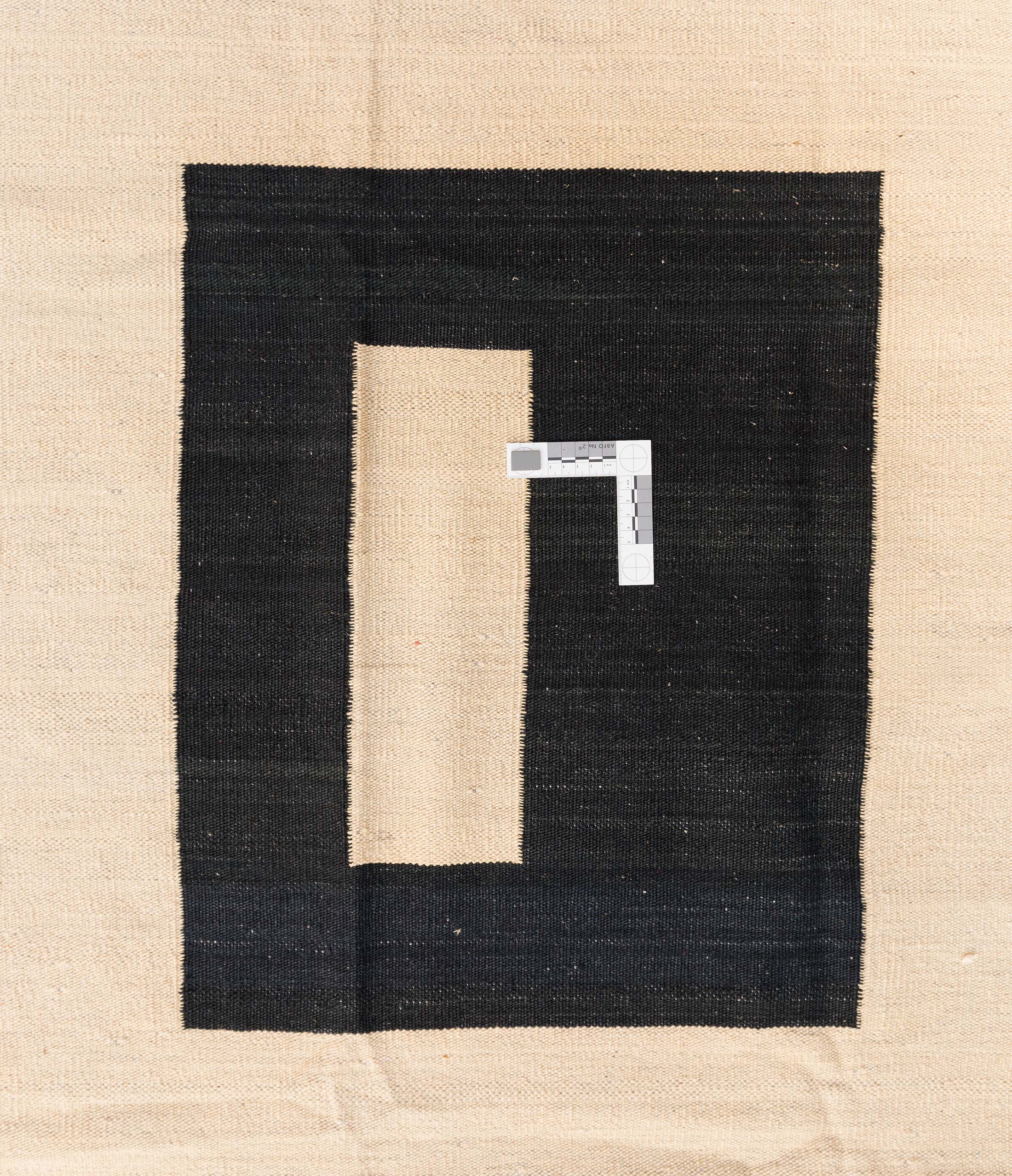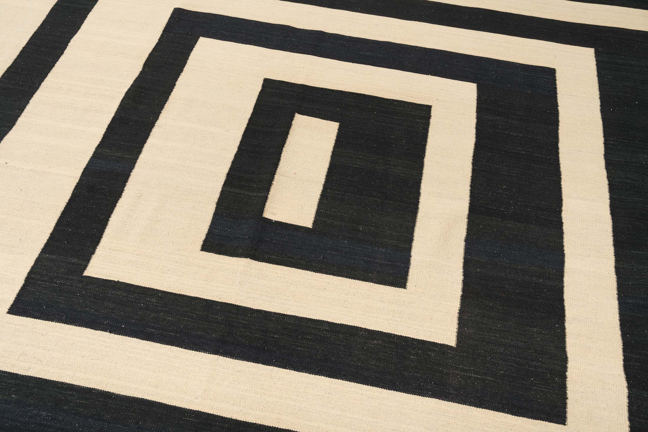 Hier präsentieren wir einen beeindruckenden handgewebten Kelim aus Afghanistan, der durch seine moderne und minimalistische Gestaltung besticht. Die Hauptfarbe dieses Teppichs ist ein elegantes Cremeweiß, das mit tiefem Anthrazit kontrastiert. Diese beiden Farben dominieren das geometrische Design, das aus ineinander verschachtelten Quadraten besteht und an die Werke von Mondrian oder das Bauhaus der 1920er Jahre erinnert. Die dezente Farbpalette verleiht dem Teppich eine zeitlose Eleganz und ...mehr Beschreibung