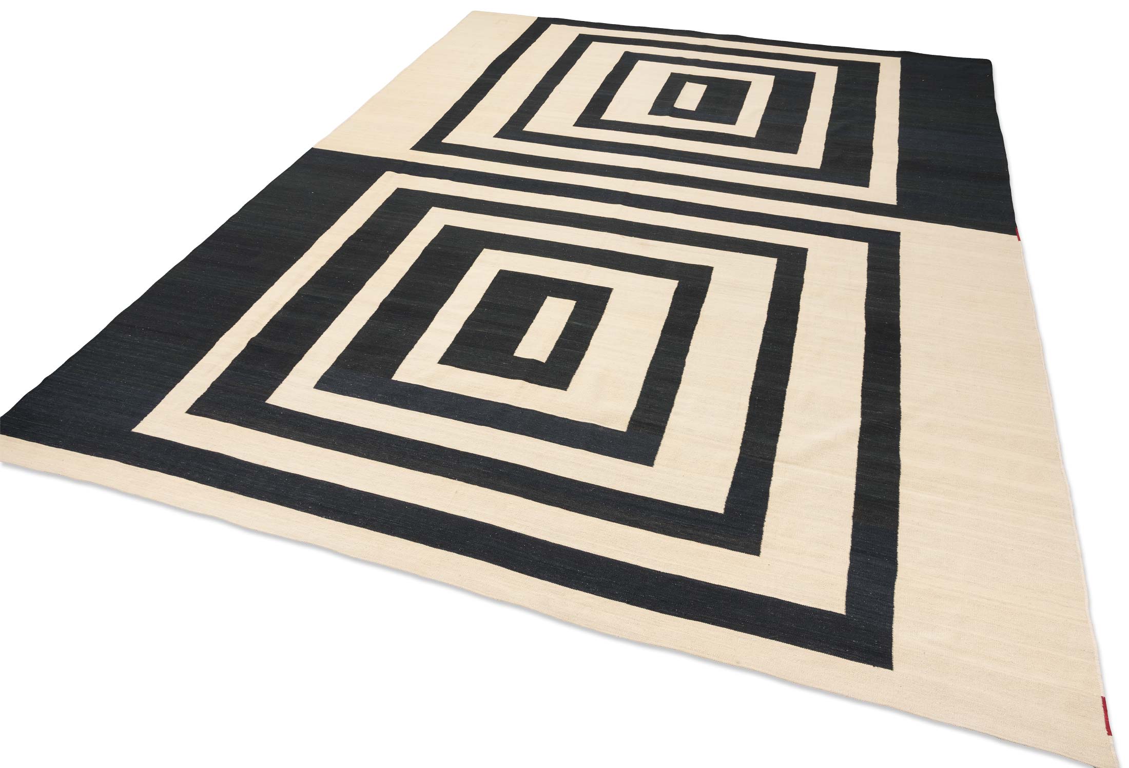Hier präsentieren wir einen beeindruckenden handgewebten Kelim aus Afghanistan, der durch seine moderne und minimalistische Gestaltung besticht. Die Hauptfarbe dieses Teppichs ist ein elegantes Cremeweiß, das mit tiefem Anthrazit kontrastiert. Diese beiden Farben dominieren das geometrische Design, das aus ineinander verschachtelten Quadraten besteht und an die Werke von Mondrian oder das Bauhaus der 1920er Jahre erinnert. Die dezente Farbpalette verleiht dem Teppich eine zeitlose Eleganz und fügt sich harmonisch in verschiedene Einrichtungsstile ein.