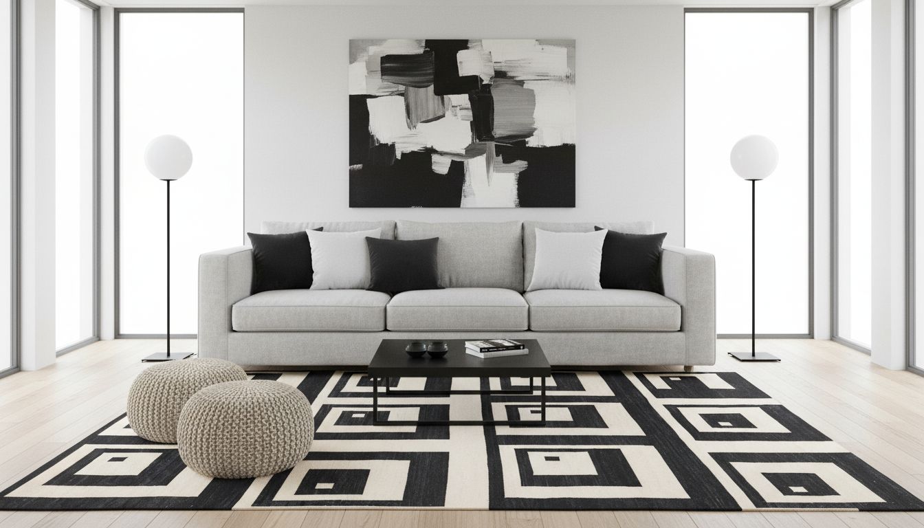 Dieser handgewebte Kelim aus Afghanistan, bekannt als Tavis, besticht durch seine klare, moderne Ästhetik. Die Hauptfarbe des Teppichs ist ein dominantes Schwarz, das in einem eleganten Kontrast zu einem sanften Beige steht. Diese beiden Farben harmonieren perfekt und verleihen dem Teppich eine zeitlose Eleganz. Das geometrische Muster, bestehend aus großen, ineinander greifenden Quadraten, erinnert an die modernen Kunstwerke von Piet Mondrian oder Victor Vasarely und spiegelt den Einfluss ...mehr Beschreibung