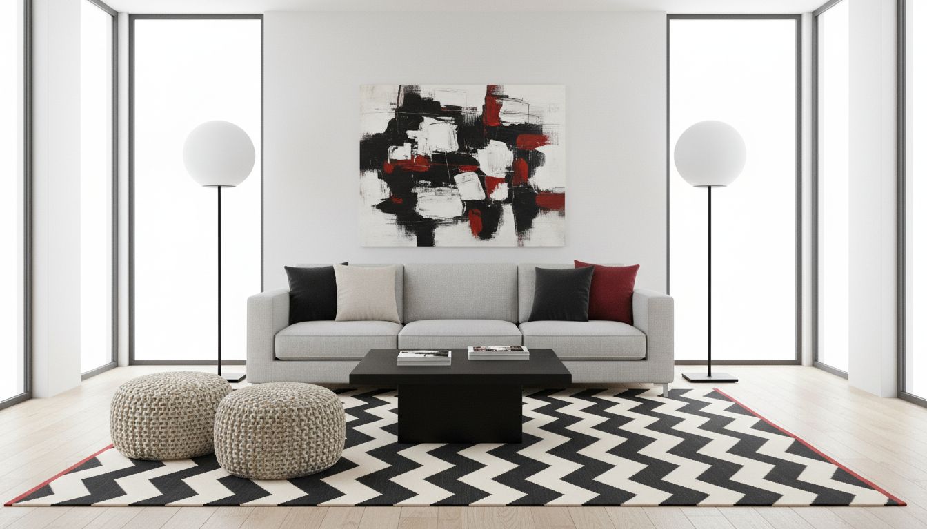 Dieser handgewebte Kelim aus Afghanistan, bekannt als Tavis, beeindruckt mit seiner kontrastreichen Farbgebung und modernen Musterung. Die Hauptfarbe ist ein tiefes Schwarz, das durch ein lebendiges Cremeweiß ergänzt wird. Ein feiner Streifen in einem satten Rotton rahmt das Design und verleiht dem Teppich eine elegante Note. Das Zickzack-Muster erinnert an die geometrische Klarheit von Bauhaus-Designs und hat zugleich eine zeitlose Anmutung, die sowohl in klassischen als auch in modernen ...mehr Beschreibung