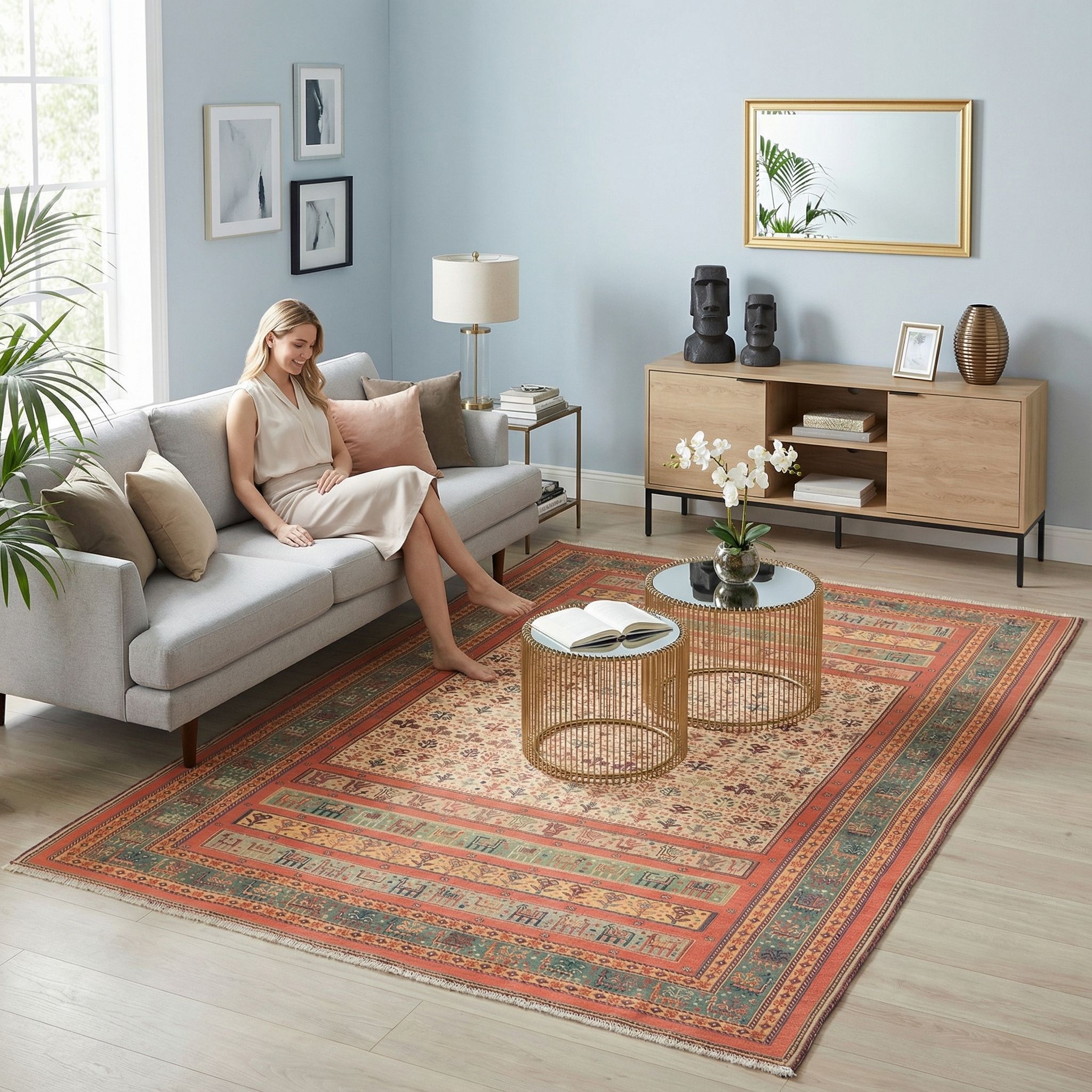 Der Afschar-Tabii Sumack-Kelim besticht durch seine warme Hauptfarbe Beige, die harmonisch mit Akzenten in Rot und Grün ergänzt wird. Das Muster des Teppichs ist reich an traditionellen Motiven, die kunstvoll und detailliert ausgearbeitet sind, und verleiht ihm eine lebendige, fröhliche Ausstrahlung. Dieser Kelim aus handgesponnener Schafwolle zeichnet sich durch eine außergewöhnliche Knotendichte von etwa 150.000 bis 200.000 Knoten pro Quadratmeter aus, was seine Robustheit und ...mehr Beschreibung