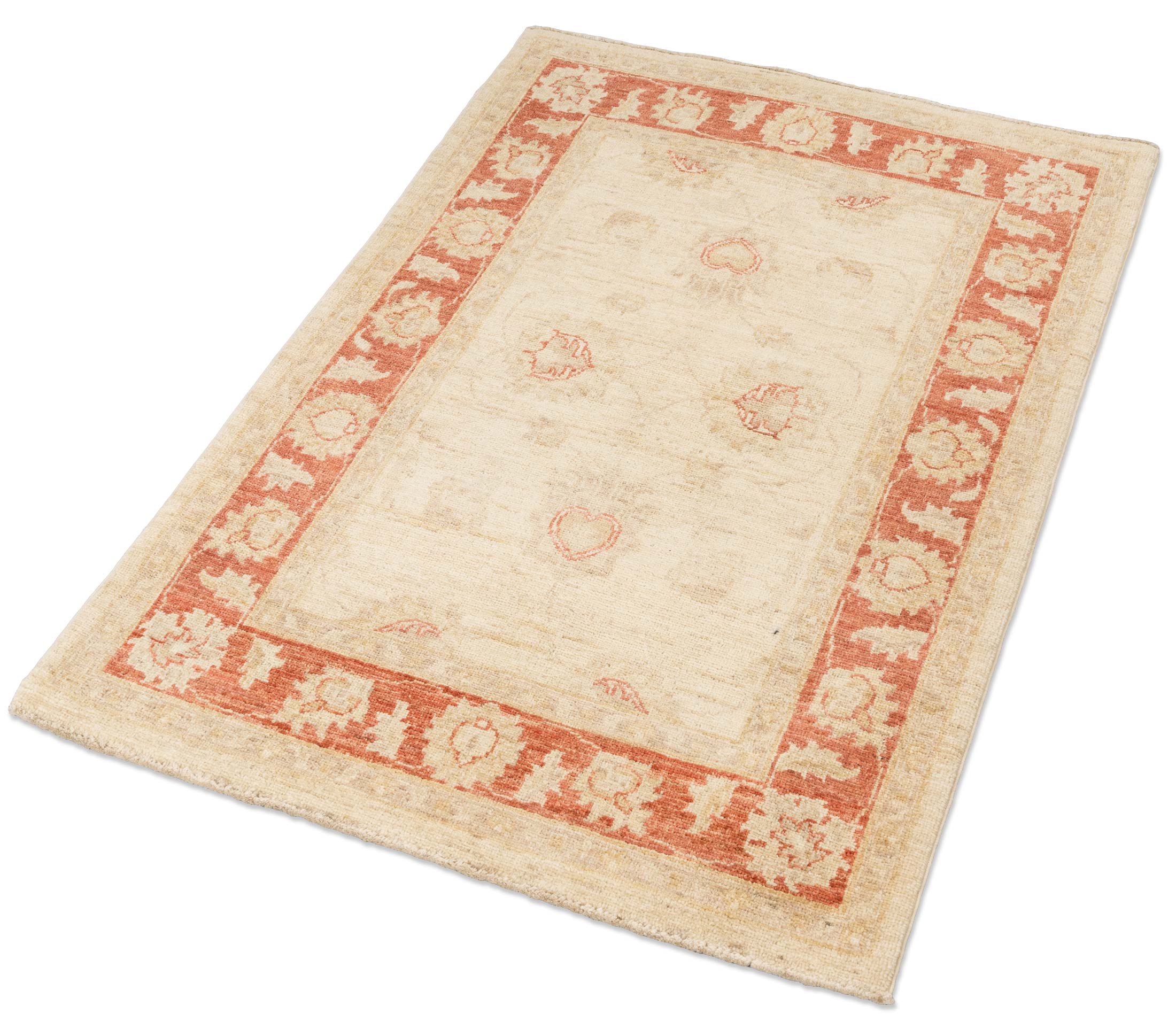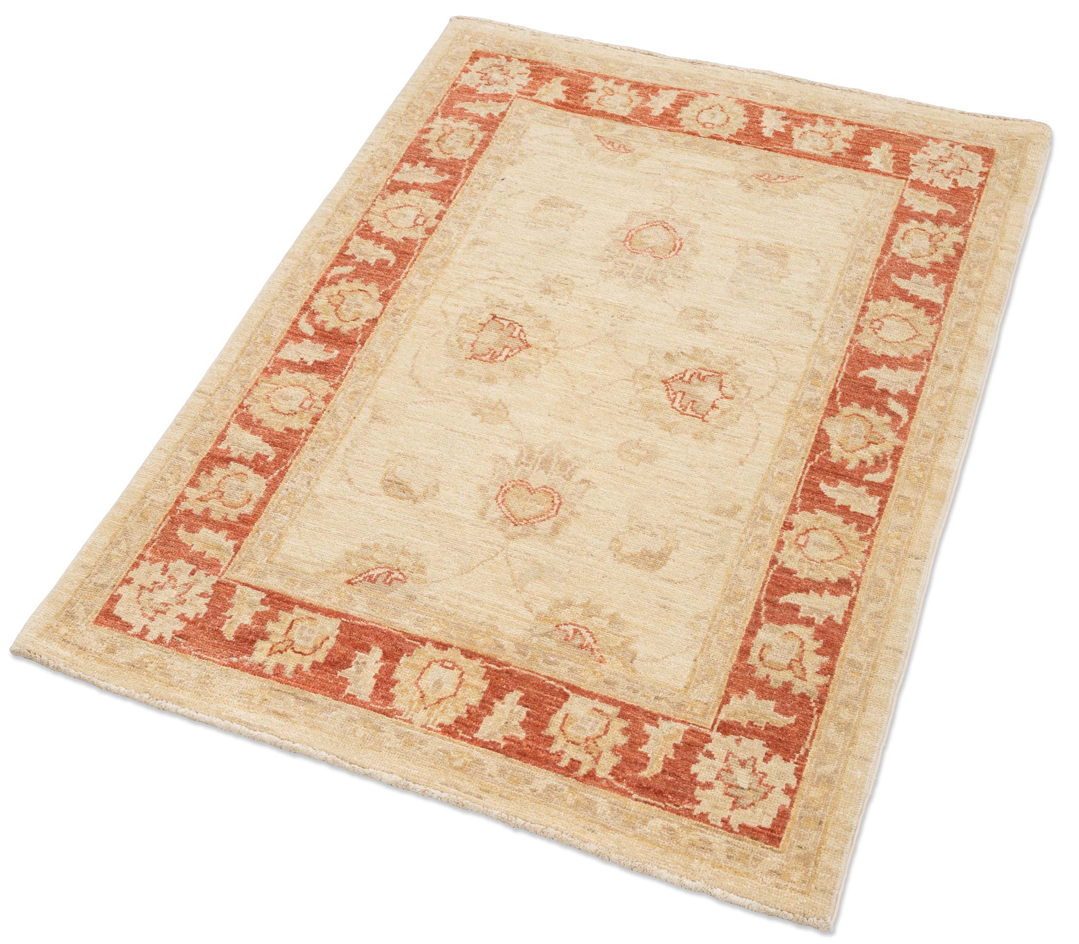 Hier präsentieren wir Ihnen einen handgeknüpften Ferahan-Teppich aus Afghanistan, der mit seiner hochwertigen Verarbeitung und dem Einsatz von natürlichen Materialien beeindruckt. Die Hauptfarbe dieses exquisiten Stücks ist ein sanftes Beige, das eine warme und einladende Atmosphäre schafft. Ergänzt wird diese durch ein kräftiges Rot, das in der Bordüre des Teppichs dominiert und dem Design eine lebendige Note verleiht. Dezente Akzente in Creme und hellem Gold runden die Farbpalette harmonisch ab und unterstreichen die Eleganz des Musters.