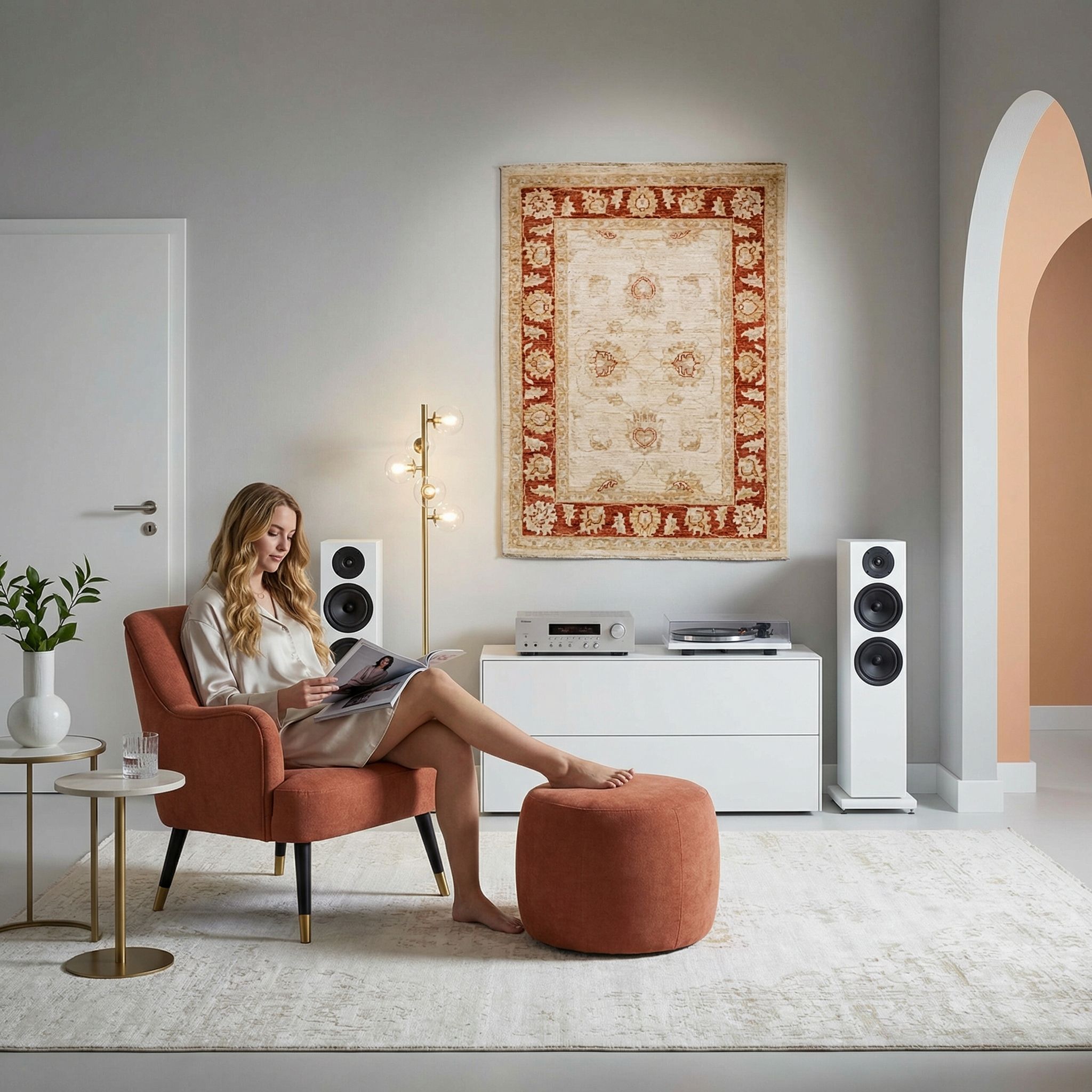 Hier fungiert der Teppich als gekonnter Stilbruch: Seine weiche Haptik und die warmen Terrakotta-Töne bilden einen faszinierenden Kontrast zu den harten Materialien wie Beton, Stahl und unverputztem Mauerwerk des Industrial-Styles. Er nimmt dem Raum die kühle Strenge und schafft eine einladende Insel der Gemütlichkeit, ohne den rauen Loft-Charakter zu verfälschen. Die außerordentliche Robustheit und die feste Qualität durch die doppelte Knotendichte sorgen dafür, dass der Teppich auch in diesem urbanen Umfeld dauerhaft besteht und wirkt. Mit diesem Stück holen Sie sich ein Element von Geschichte und handwerklicher Tradition in das moderne Loft, was den Raum wohnlich und kuratiert wirken lässt.