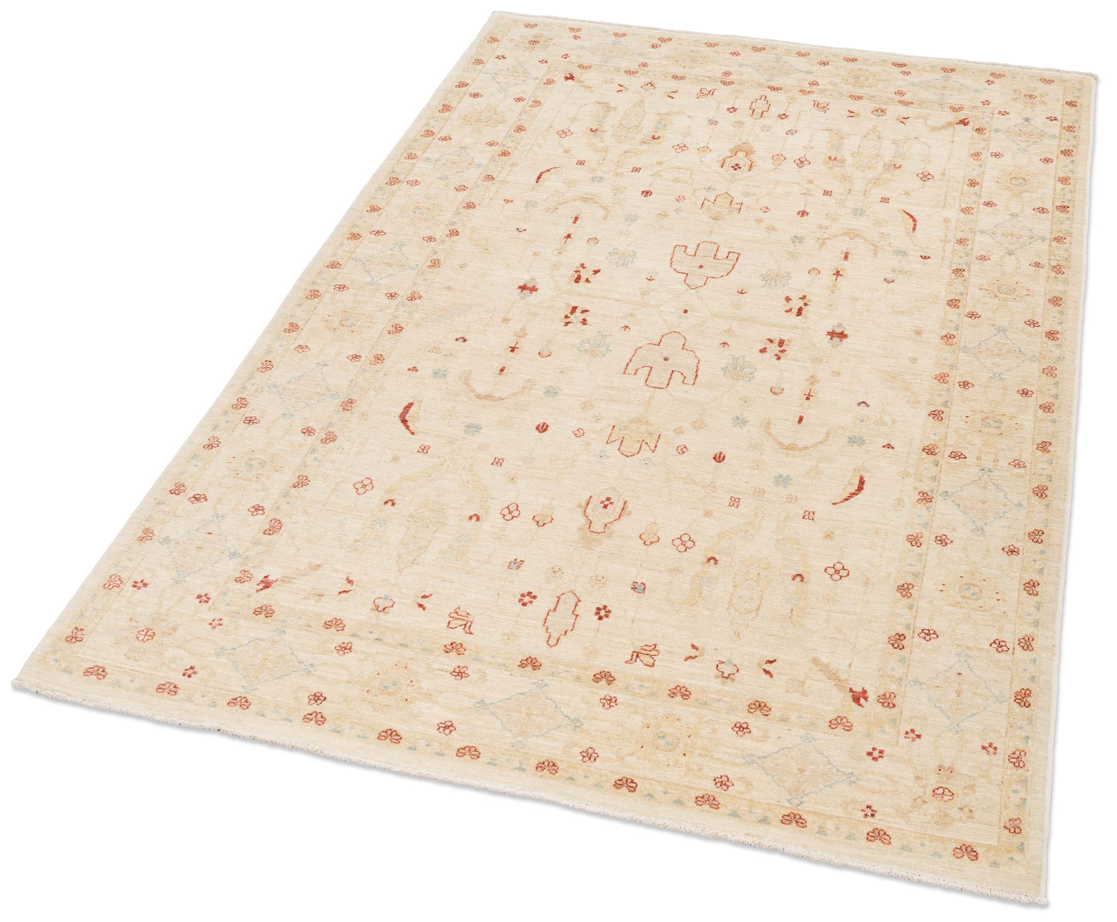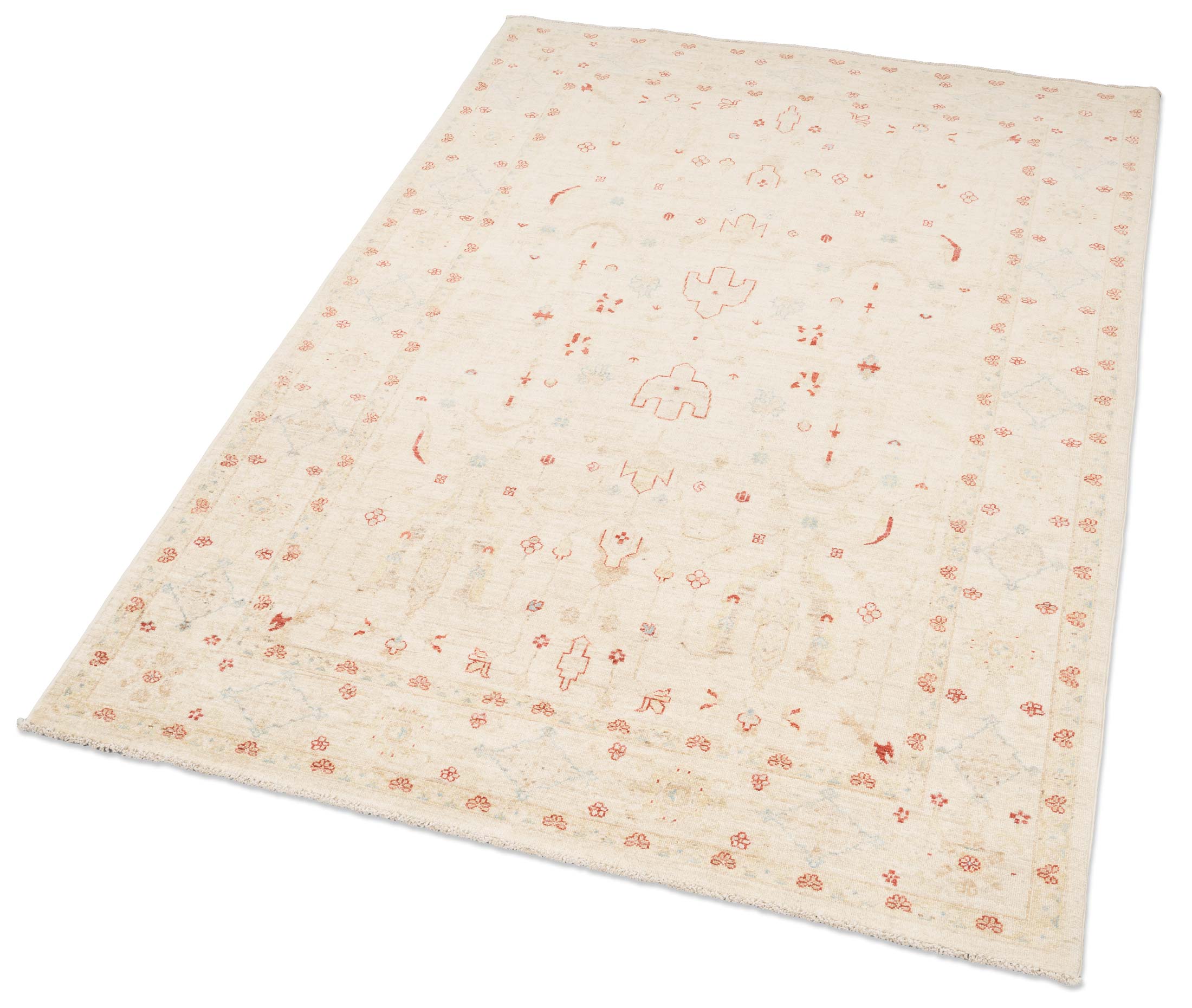 Hier präsentieren wir einen exquisiten handgeknüpften Ferahan-Teppich aus Afghanistan, dessen Hauptfarbe ein zartes Beige ist. Die warmen Akzente in einem gedeckten Rot verleihen ihm eine elegante Note. Dezente Blau- und Goldtöne ergänzen das harmonische Gesamtbild. Der Teppich zeigt ein traditionelles, florales Muster, das an klassische Ziegler-Designs erinnert.