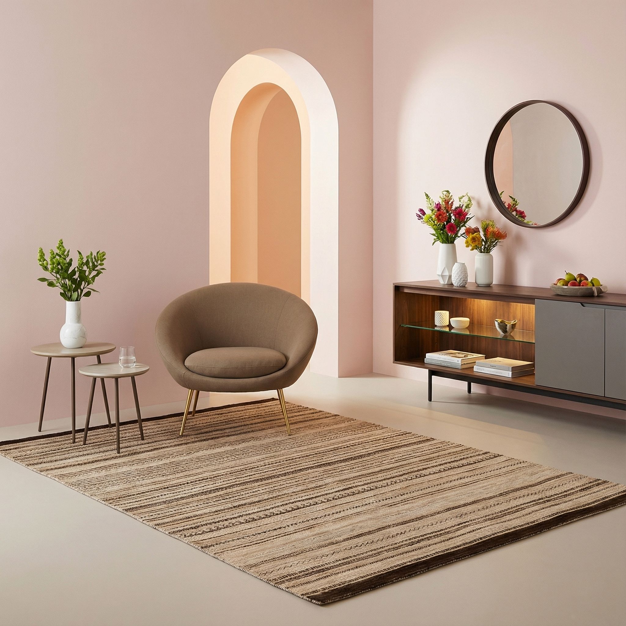Die sanften Beige- und Sandtöne dieses Designerteppichs harmonieren mühelos mit den hellen Hölzern und der klaren Formensprache des skandinavischen Stils. Durch die Verwendung feinster handversponnener Wolle fügt er den essentiellen "Hygge"-Faktor hinzu, indem er Wärme und taktile Tiefe in ein minimalistisches Umfeld bringt, ohne optisch zu überladen. Das lineare, zurückhaltende Design unterstützt die ruhige Ästhetik des Nordens, bietet aber gleichzeitig einen hochwertigen, natürlichen Kontrast zu glatten Oberflächen. Dieses langlebige Stück verspricht dauerhafte Behaglichkeit und fügt sich nahtlos in einen nachhaltigen, designorientierten Lebensstil ein.