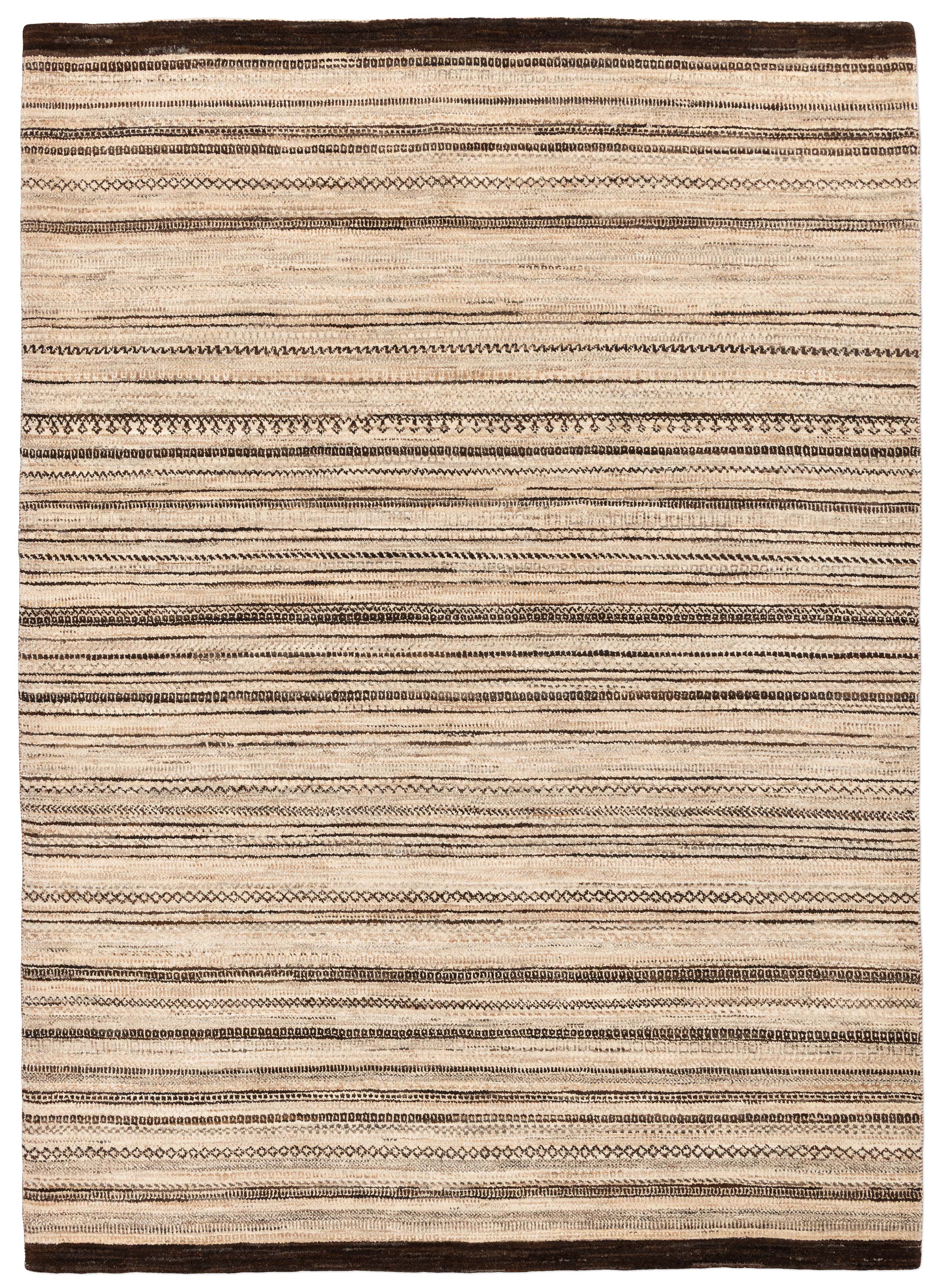 Dieser handgeknüpfte Zarubi-Teppich aus Afghanistan besticht durch seine Hauptfarbe Beige, die eine warme und einladende Atmosphäre schafft. Begleitet wird diese von tiefen Brauntönen und sanften Cremeschattierungen, die dem Teppich eine edle und natürliche Ausstrahlung verleihen. Die Musterung besteht aus schlichten Linien und zarten geometrischen Formen, die in harmonischer Abwechslung für ein ausgewogenes und ansprechendes Design sorgen. Gefertigt aus hochwertiger, handversponnener Schafwolle und gefärbt mit reinen Naturfarben, zeichnet sich dieser Teppich durch erstklassige Qualität und Langlebigkeit aus. Die feine Knüpfung ist ca. 2-3 mal dichter als bei herkömmlichen Gabbehteppichen, was auf die präzise Handarbeit und die Verwendung bester Materialien zurückzuführen ist. Jeder Teppich ist ein Unikat, das durch seine Herstellung in einer kleinen Manufaktur eine besondere Geschichte erzählt. Ein Zarubi-Teppich ist nicht nur ein Bodenbelag, sondern ein Kunstwerk, das Generationen überdauert.