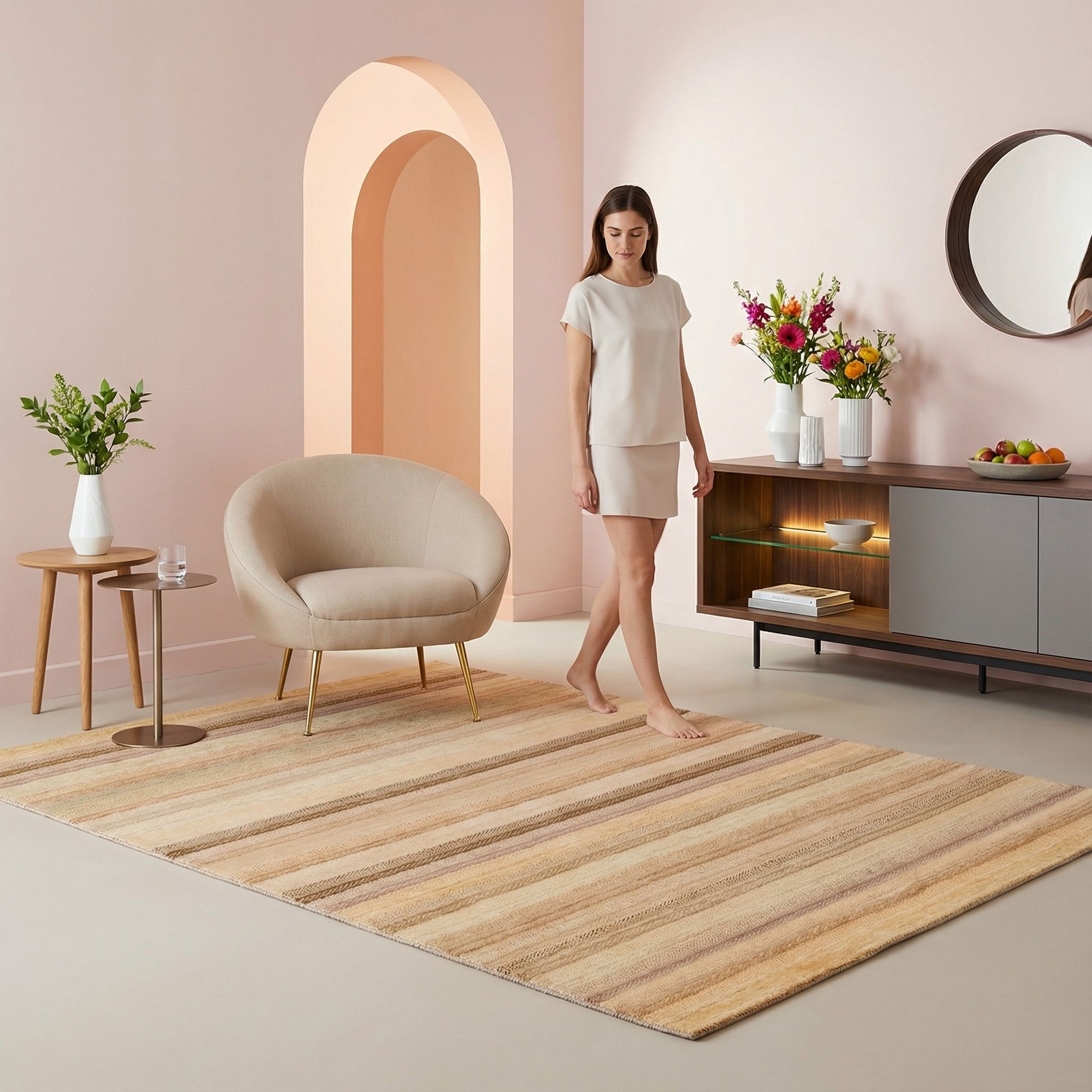 Im skandinavischen Design, das Klarheit und Gemütlichkeit – das berühmte „Hygge“ – vereint, wirkt dieser Teppich als wärmender Anker. Seine dezenten, horizontalen Streifenmuster und die ruhige Farbpalette aus Naturtönen fügen sich harmonisch in reduzierte Interieurs ein, ohne den Raum zu dominieren. Die hochwertige Textur der handversponnenen Wolle bricht die Strenge glatter Oberflächen auf und verleiht Ihrem Wohnraum eine sanfte, taktile Tiefe. Er ist das perfekte Fundament für nordisches Wohnen, da er puristisches Design mit der unverzichtbaren Wärme natürlicher Materialien kombiniert.