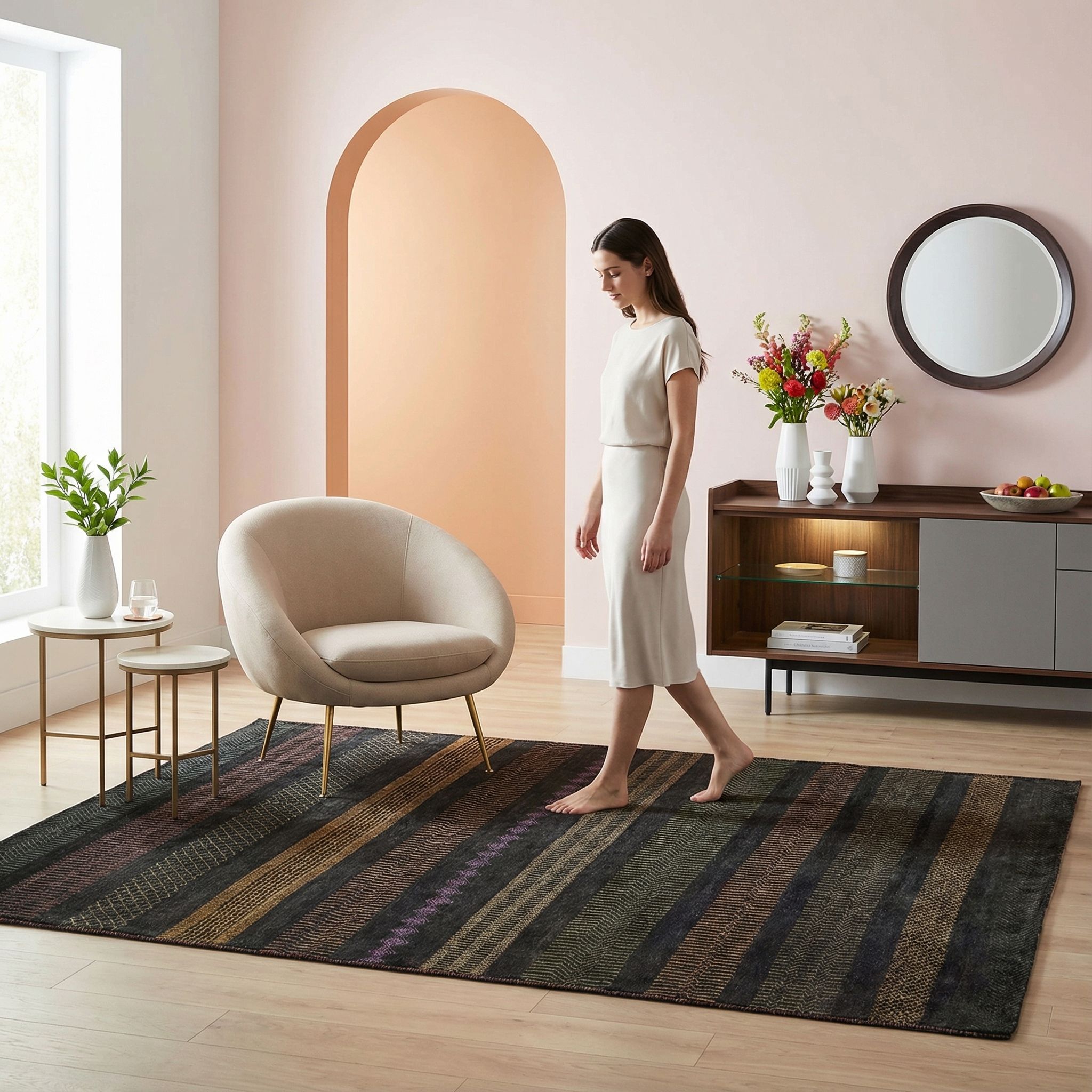 Für den Contemporary-Style ist dieser Teppich eine exzellente Wahl, da er klassische Handwerkskunst durch einen kreativen Designprozess in eine zeitgemäße, moderne Formensprache übersetzt. Die feine Knüpfung und die hochwertige Anmutung des Materials genügen höchsten ästhetischen Ansprüchen und setzen in minimalistischen Räumen ein klares Statement von Luxus und Qualitätsbewusstsein. Das innovative Streifendesign wirkt aufgeräumt und strukturiert, wodurch es moderne Möbelklassiker perfekt in Szene setzt, ohne den Raum visuell zu überladen. Es ist ein Designerstück für Kenner, die verstehen, dass wahre Modernität in der Verbindung von Tradition, Qualität und aktuellem Design liegt.