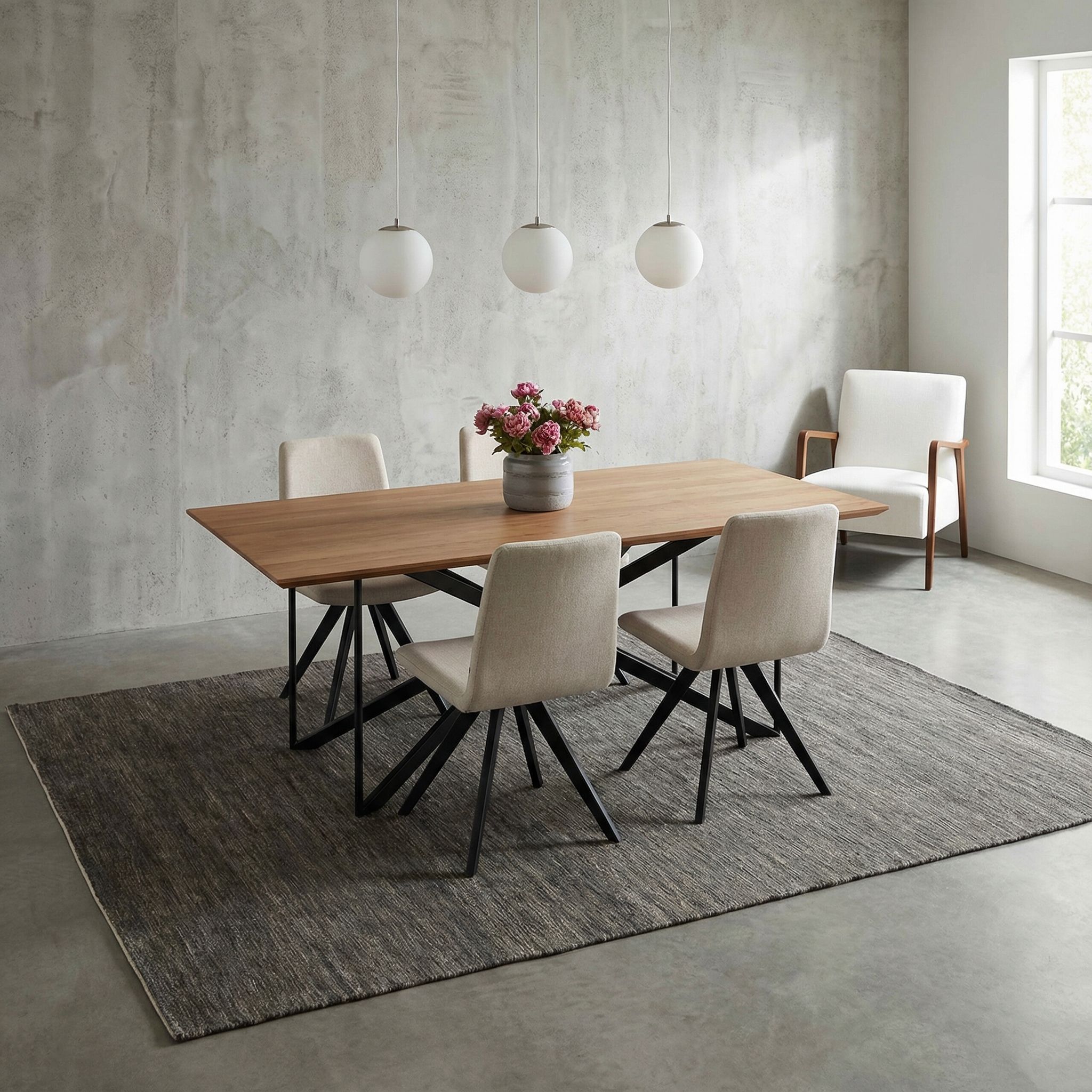 In einem Loft mit rauem Beton, unverputztem Mauerwerk und kühlem Metall wirkt dieser Teppich als wärmender Anker, der dem Industrial-Style die nötige Wohnlichkeit verleiht. Die ursprüngliche Haptik der naturbelassenen Schafwolle harmoniert exzellent mit der rauen Umgebung, indem sie Authentizität und ehrliche Handwerkskunst in den Vordergrund stellt. Durch die robusten Naturfarben und die schwere Qualität behauptet sich das Stück mühelos gegen massive Fabrikmöbel und schafft eine maskuline, geerdete Atmosphäre. Hier fungiert der Teppich nicht nur als Bodenbelag, sondern als ein Statement für langlebige Qualität und Haltbarkeit, die auch starkem Gebrauch standhält.