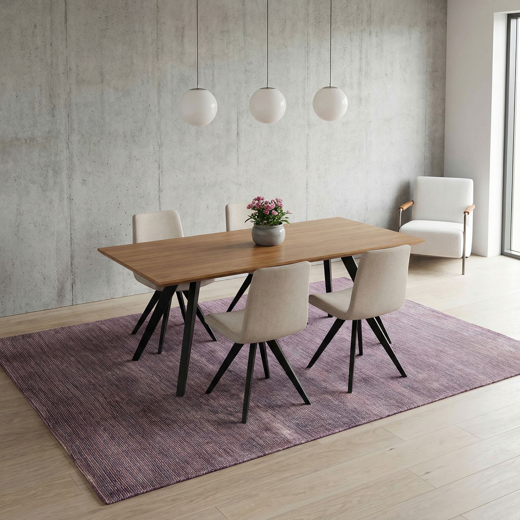 Im skandinavischen Wohnstil sorgt dieser Teppich für die notwendige Portion "Hygge", indem er die kühle, helle Ästhetik mit seiner weichen Haptik und den natürlichen Materialien wärmend ergänzt. Der sanfte, violette Farbton fungiert hier als raffinierter Farbtupfer, der die typische Neutralität des Scandi-Looks belebt, ohne die visuelle Ruhe zu stören. Da bei diesem Stil Nachhaltigkeit und Langlebigkeit im Fokus stehen, ist die robuste Ghazniwolle ohne lästigen Wollabrieb die ideale Wahl für ein bewusstes und dauerhaftes Einrichten. Die feine Struktur der handversponnenen Wolle bringt genau jene organische Textur in den Raum, die nordisches Design so wohnlich und einladend macht.