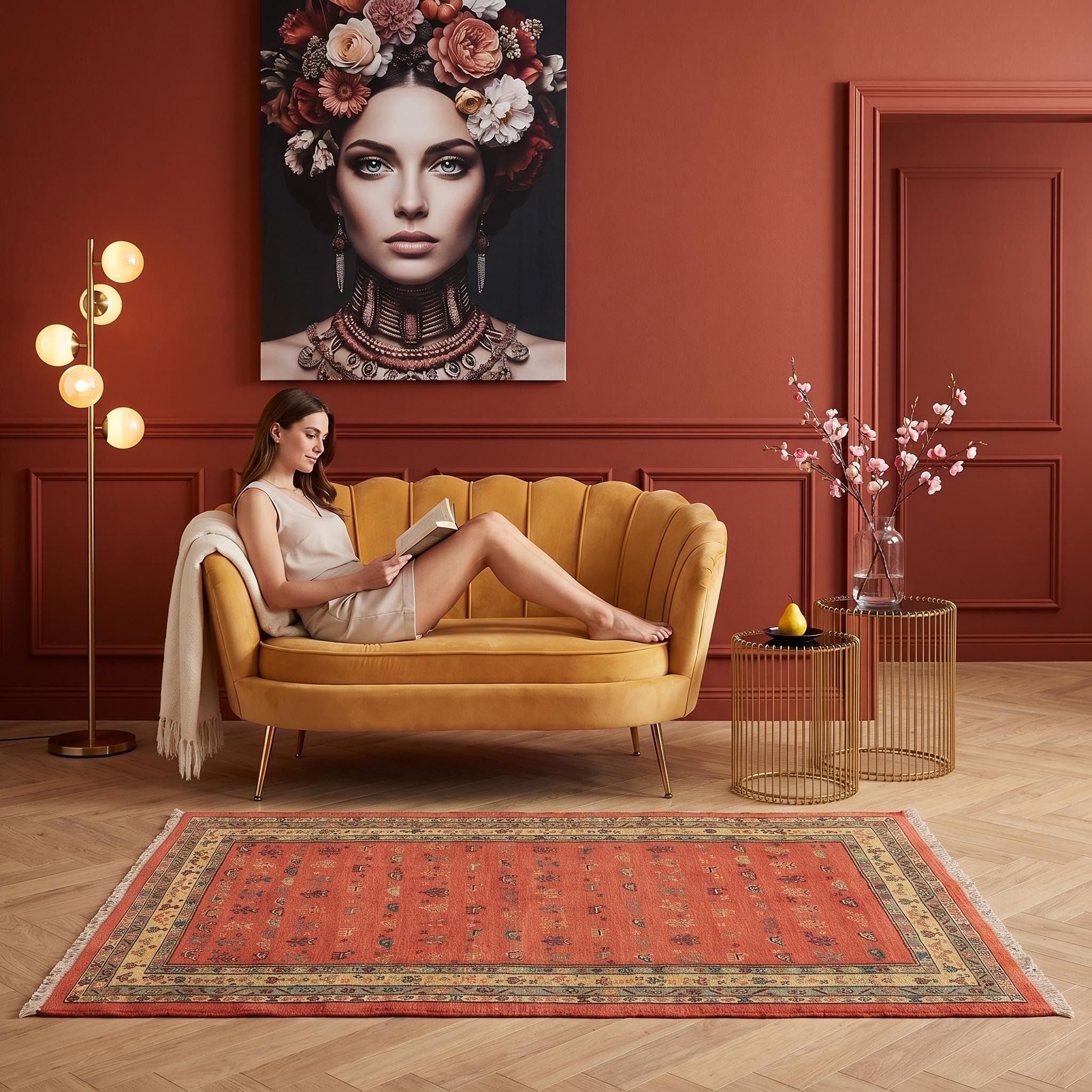 Um die nordische Kühle des Skandi-Stils mit der nötigen „Hygge“-Gemütlichkeit zu füllen, ist dieser handgefertigte Kelim die ideale Wahl. Sein warmes Terrakotta und die natürlichen Materialien brechen die Strenge von weißen Wänden und schlichtem Mobiliar auf, ohne die minimalistische Grundordnung zu stören. Da im skandinavischen Design Nachhaltigkeit und Qualität an erster Stelle stehen, überzeugt dieser Teppich durch seine langlebige Verarbeitung und die Verwendung rein natürlicher Ressourcen. Er fungiert als geschmackvoller Farbtupfer, der Ihrem reduzierten Interieur eine Seele gibt und den Raum sofort wohnlicher und einladender wirken lässt.