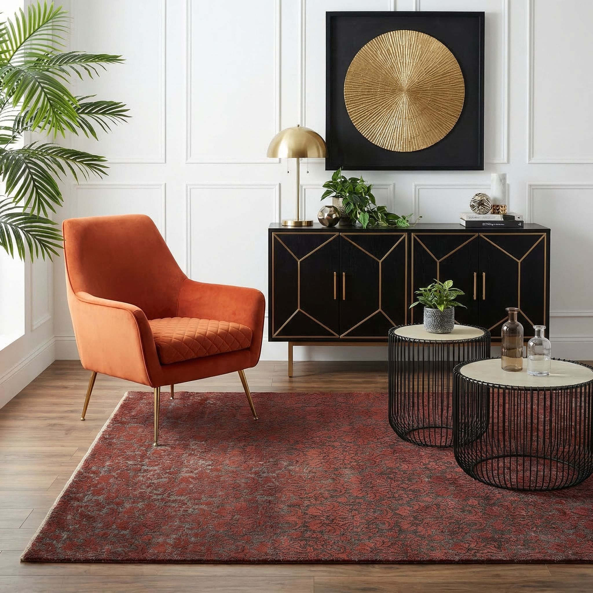 In einem gehobenen Boho-Interieur sorgt dieser Teppich mit seiner erdigen, rost-roten Farbnuance für das perfekte, warme Fundament und verankert den Raum optisch. Die sichtbare Handwerkskunst und die lebendige Struktur des Materials unterstreichen den Wunsch nach Individualität und authentischem Design, der diesen freien Wohnstil prägt. Kombiniert mit Rattanmöbeln, Makramee und vielen Pflanzen, bringt der edle Schimmer der Bambusseide einen Hauch von "Boho-Luxe" in das entspannte Ambiente. Da jedes Stück ein handgeknüpftes Unikat ist, besitzen Sie ein Kunstwerk mit echtem Charakter, das Ihre persönliche Freiheit im Einrichten widerspiegelt.