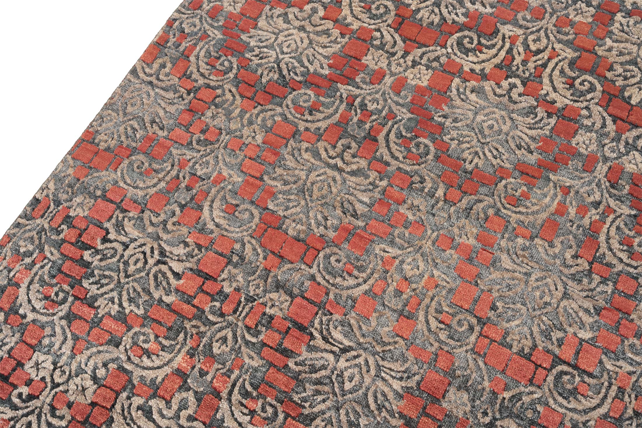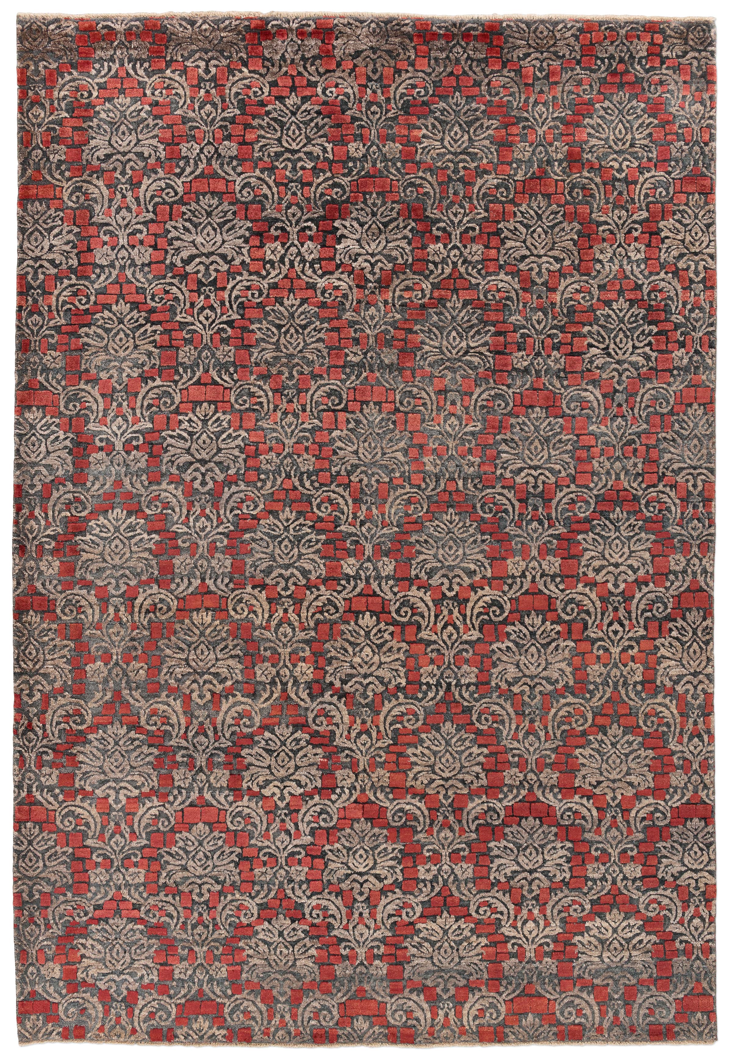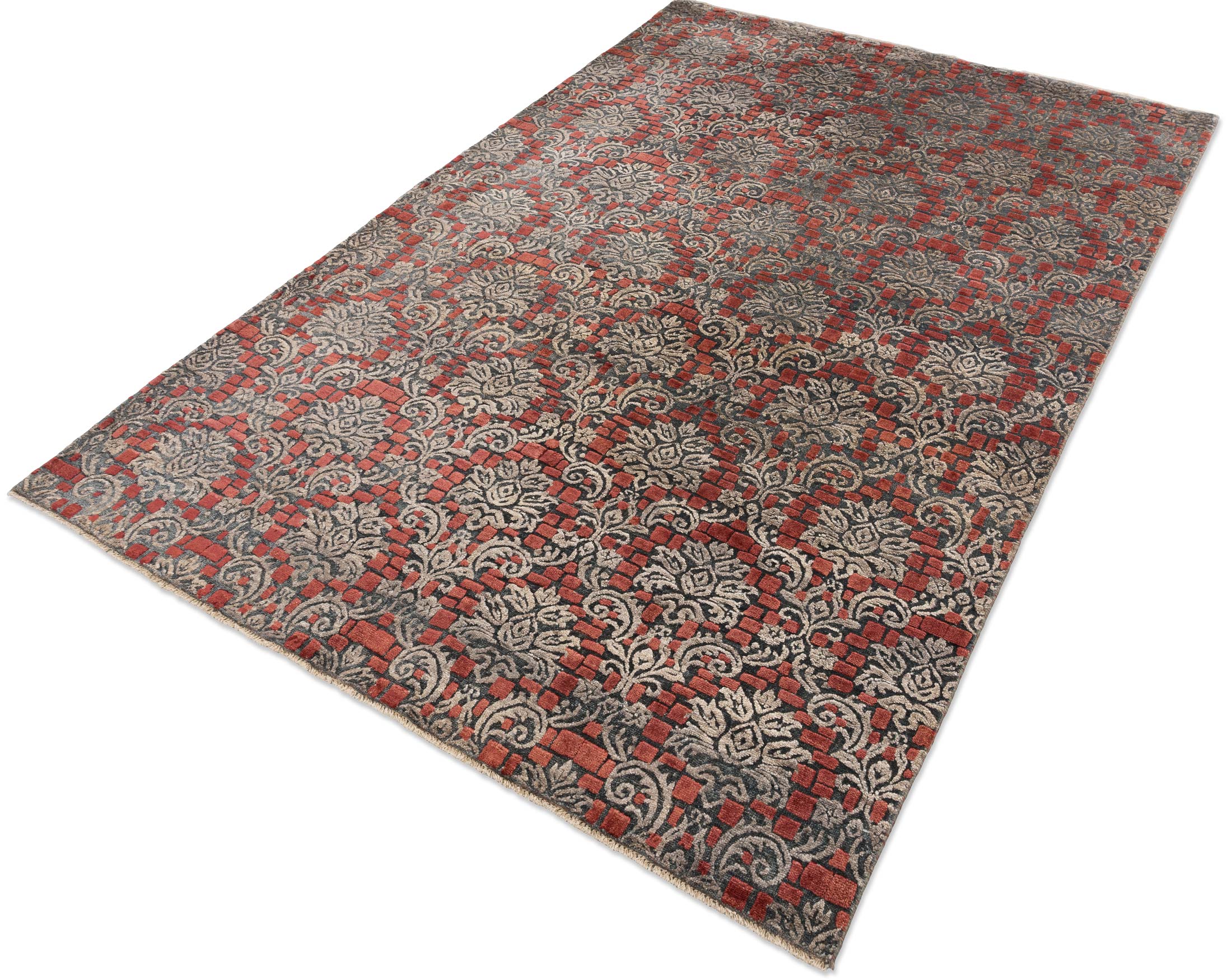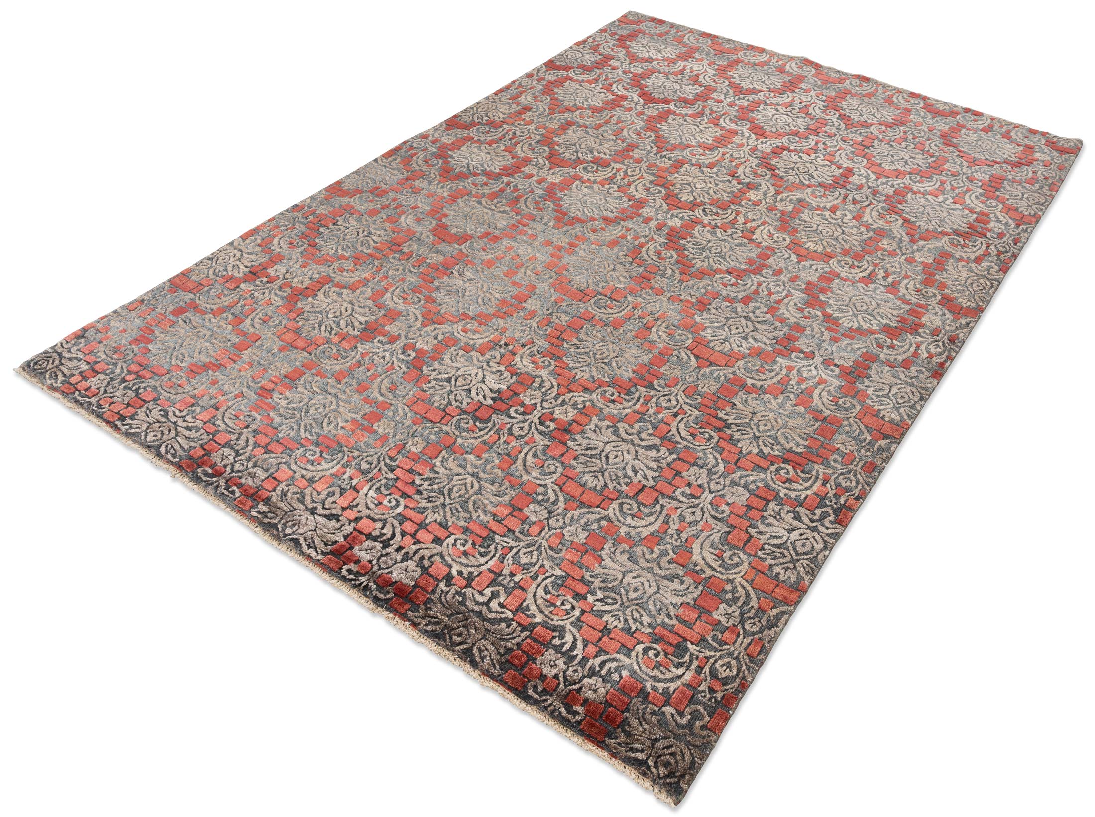 Dieser wunderschöne Teppich besticht durch seine Hauptfarbe Graublau, die durch kräftige Rot- und zarte Beigetöne ergänzt wird. Die Musterung zeigt ein elegantes florales Design, das durch geometrische Elemente aufgelockert wird, was dem Teppich einen einzigartigen Charakter verleiht. Die Verwendung von erstklassiger Bambusseide sorgt für eine besondere, glänzende Textur und spiegelt höchste Handwerkskunst wider. Der Teppich Eterno ist nicht nur ein dekoratives Highlight, sondern auch ...mehr Beschreibung