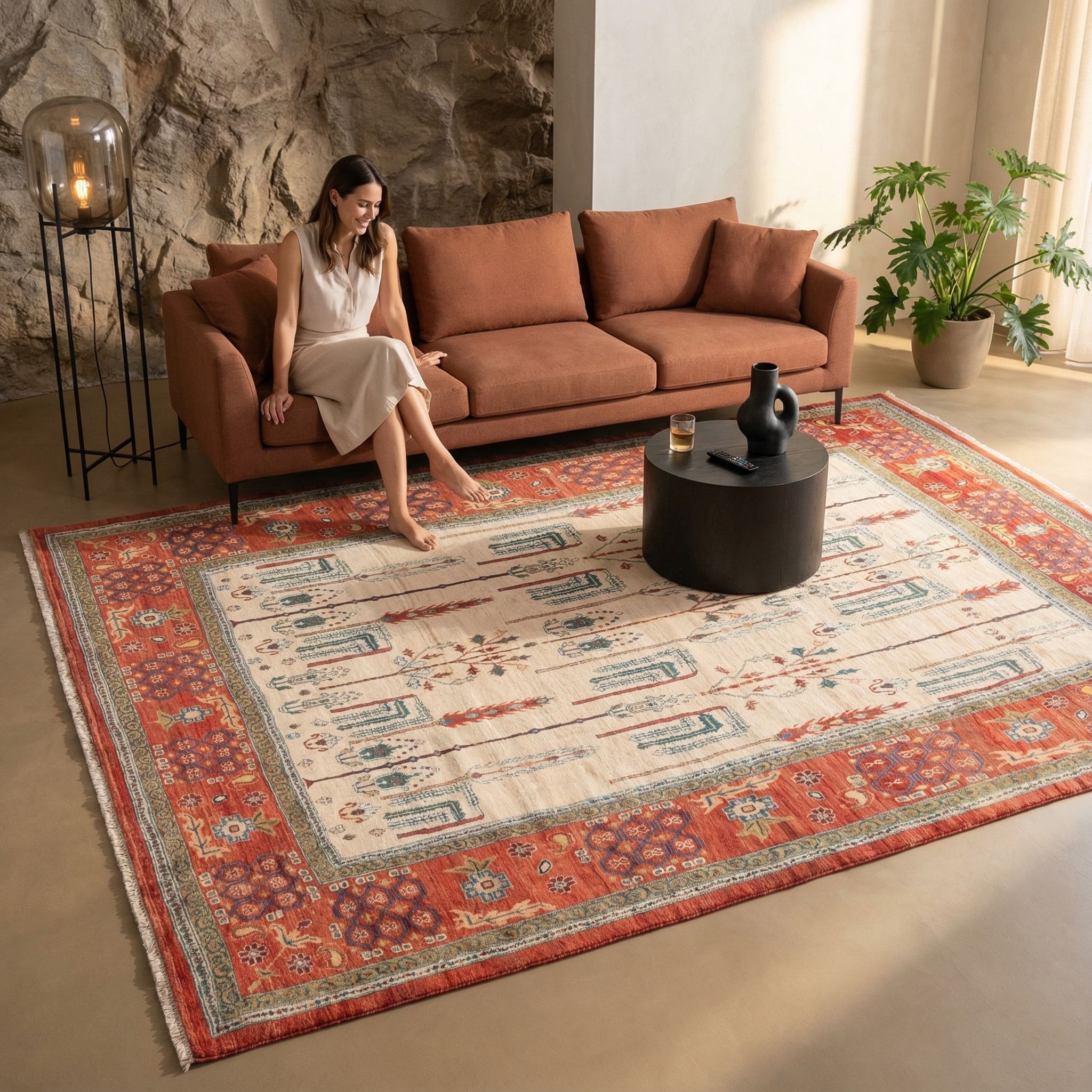 Der Boho-Style lebt von Ungezwungenheit und künstlerischem Ausdruck, weshalb die verspielten, aber strukturierten Variationen des Lebensbaummotivs hier wunderbar zur Geltung kommen. Die sichtbaren Unterschiede in der Farb- und Materialstruktur (Abrash) durch die handversponnene Wolle verleihen dem Raum genau jenen unperfekten, gemütlichen Charme, den der Bohemian-Look anstrebt. Das helle Mittelfeld sorgt dafür, dass der Raum trotz der bunten Muster luftig bleibt, während die roten Akzente Wärme spenden. Zusammen mit vielen Grünpflanzen, Rattanmöbeln und weichen Textilien schafft dieser Teppich eine inspirierende Wohlfühloase.