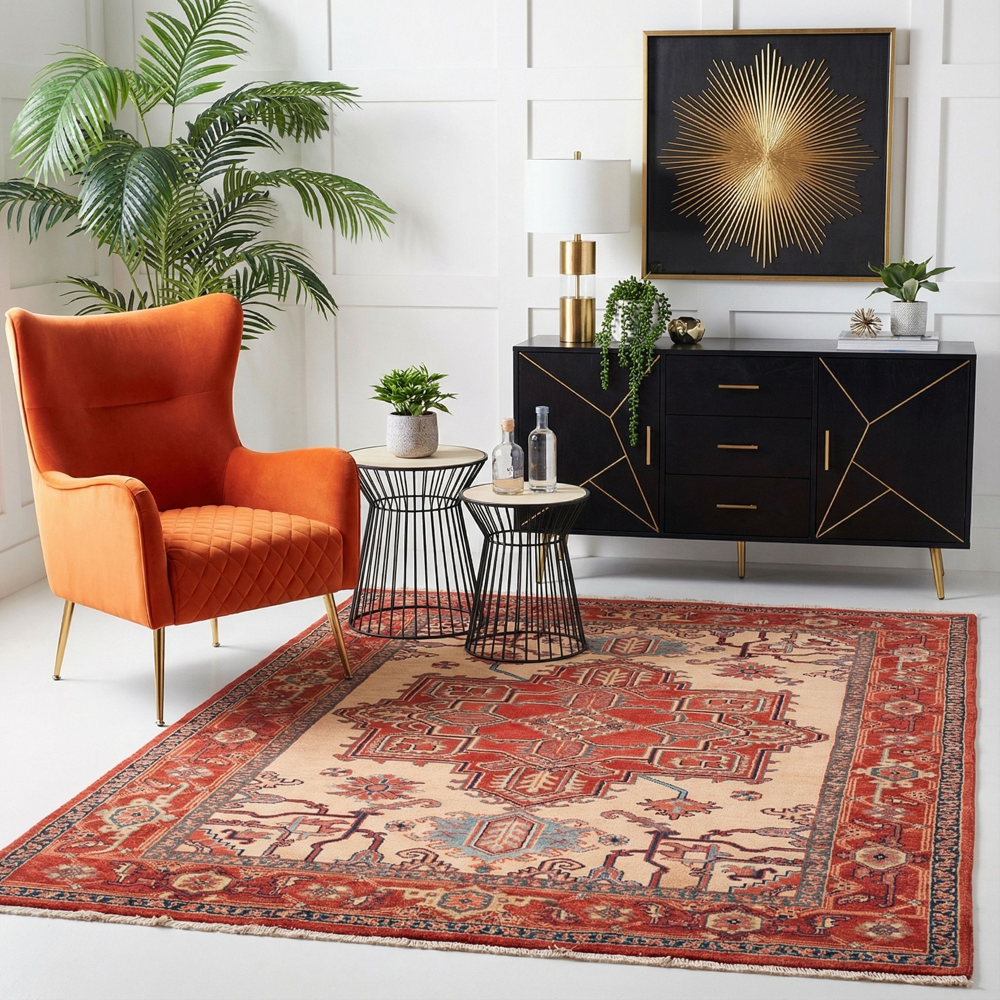 Hier präsentieren wir einen handgeknüpften Ghadimi-Teppich aus dem Hause Mesgarzadeh, der durch seine meisterhafte Knüpfkunst und zeitlose Eleganz besticht. Die Hauptfarbe ist ein intensives Rot, das die zentrale Medaillonmusterung und den Rand des Teppichs dominiert. Ergänzt wird diese durch sanfte Beigetöne, die dem Design eine harmonische Balance verleihen. Ein tiefes Blau setzt Akzente und verleiht dem Teppich Tiefe und Kontrast. Der Ghadimi-Teppich vereint traditionelle Heriz- und ...mehr Beschreibung
