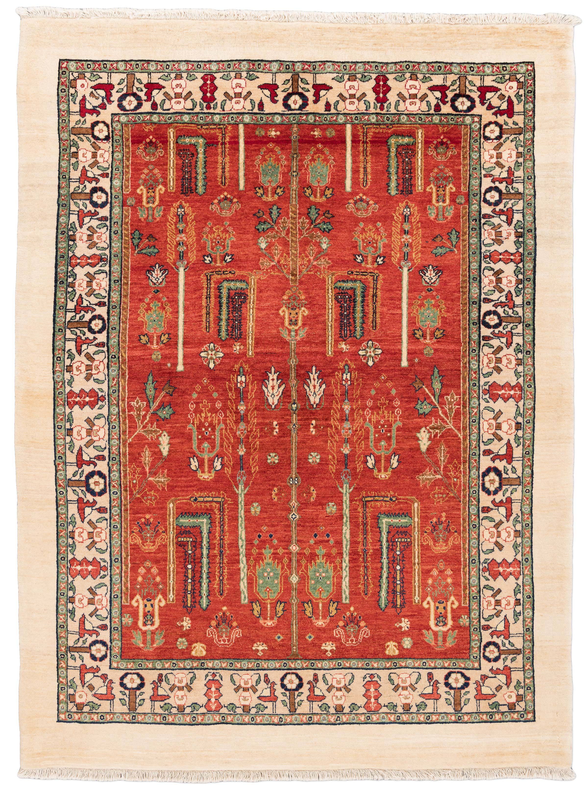 Dieser handgeknüpfte Bidjar-Gerus-Teppich präsentiert sich in einem warmen, kräftigen Rot als Hauptfarbe, das die Basis für die gesamte Gestaltung bildet. Ergänzt wird dieses durch ein tiefes Dunkelblau, das den Mustern Tiefe verleiht. Ein sattes Grün bringt frische Akzente und harmoniert mit den floralen Motiven. Außerdem sorgt ein sanftes Beige in der Bordüre für einen eleganten Kontrast zum lebendigen Mittelfeld.Das zentrale Motiv des Teppichs zeigt Variationen des ...