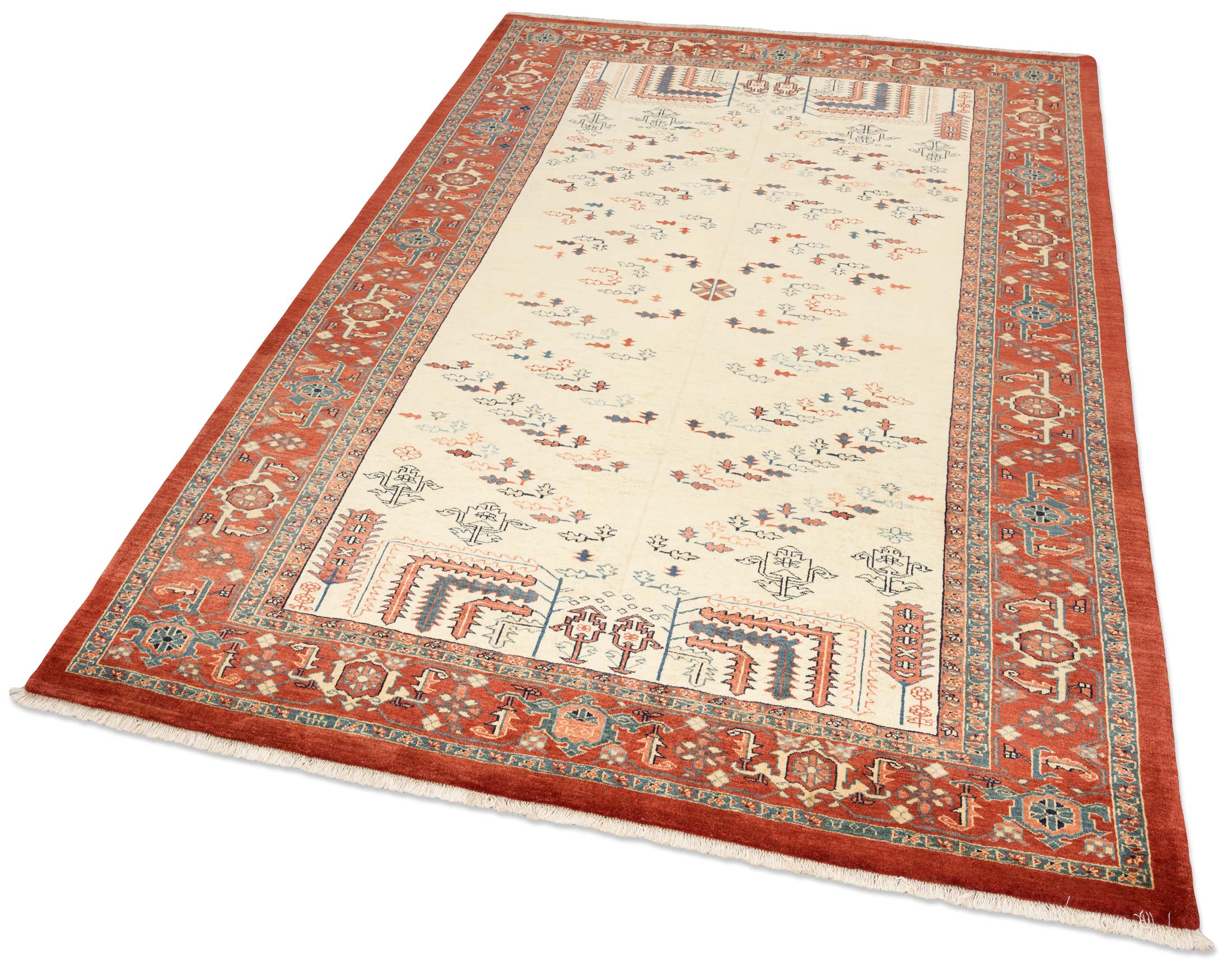 Hier präsentieren wir einen exquisiten handgeknüpften Teppich aus dem Hause Mesgarzadeh, der durch seine harmonische Farbgebung und feine Musterung besticht. Die Hauptfarbe dieses Ghadimi-Teppichs ist ein warmes Rot, das durch die Verwendung von Naturfarben eine besondere Tiefe erhält. Ergänzt wird diese Hauptfarbe durch ein weiches Creme und ein lebhaftes Blau, die den Teppich in einem lebendigen Licht erscheinen lassen. Diese Farbkombination verleiht dem Stück einen fröhlichen, einladenden Charakter.
