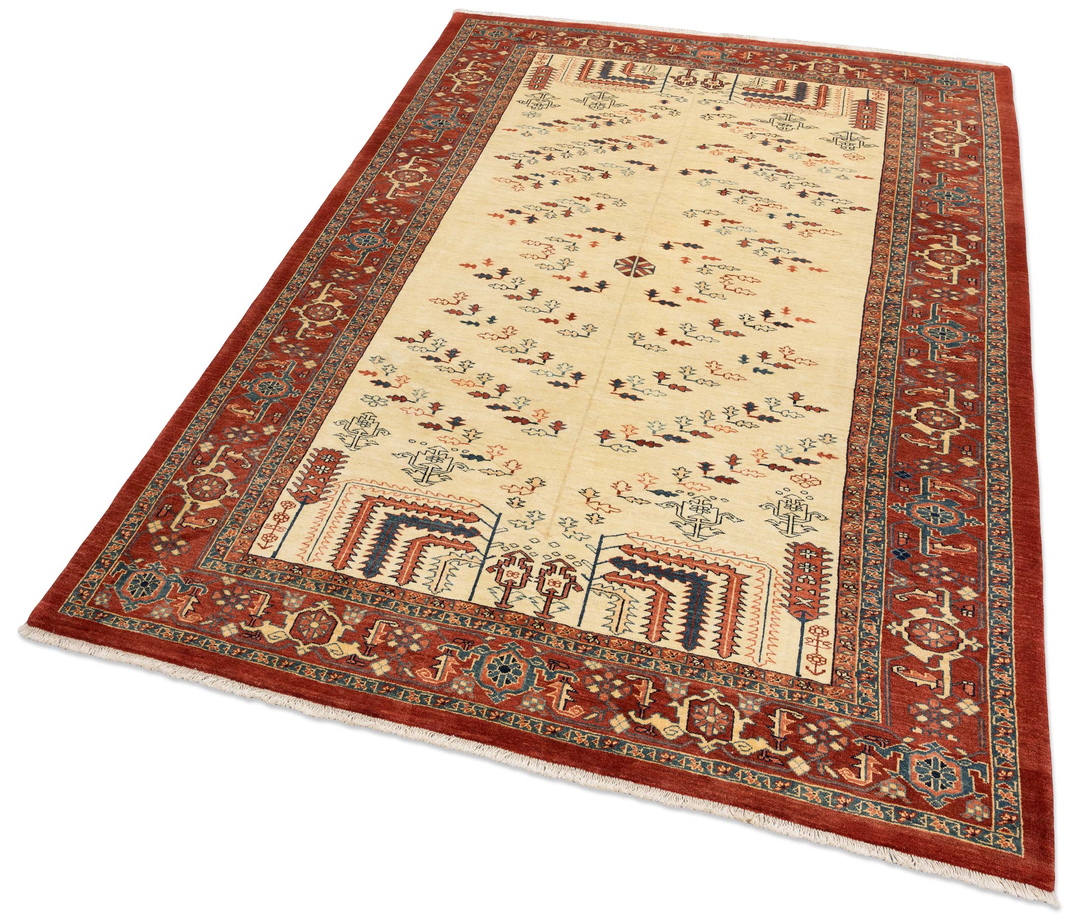 Der Teppich zeigt zwei stilisierte Lebensbäume, die zueinander wachsen, ein traditionelles Motiv, das mit modernen Elementen kombiniert wurde. Die Musterung ist detailreich und zeugt von meisterhafter Handwerkskunst, die in der feinen Knüpfung mit handversponnener Schafwolle zum Ausdruck kommt. Unterschiede in Farbe und Struktur unterstreichen die Einzigartigkeit jedes Stücks und sind das Ergebnis der Verwendung hochwertigster, natürlicher Materialien.