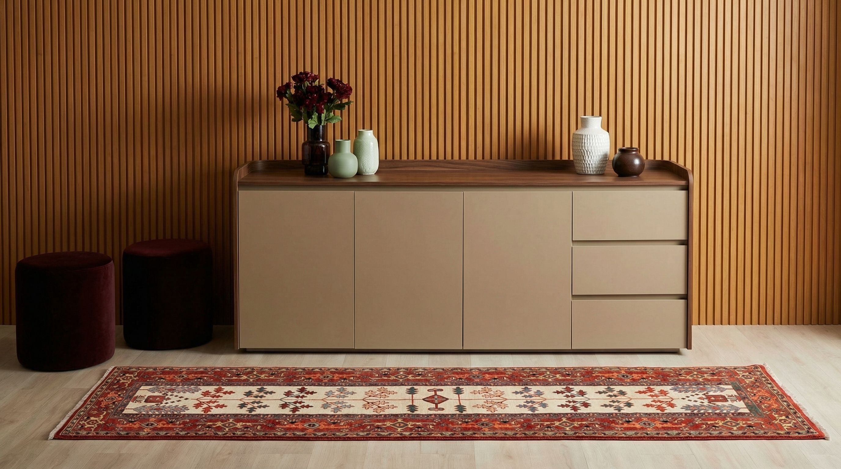 Dieser handgeknüpfte Ghadimi-Teppich aus dem Hause Mesgarzadeh beeindruckt mit seiner Hauptfarbe, einem warmen Rostrot, das den gesamten Teppich durchzieht. Ergänzt wird diese Farbe durch ein sanftes Cremeweiß, das den Hintergrund der zentralen Musterung bildet. Ein tiefes Petrolblau setzt Akzente und verleiht dem Design Tiefe und Charakter. Die Musterung zeigt zwei stilisierte Lebensbäume, die zueinander wachsen, ein Symbol für Wachstum und Harmonie.Die Verwendung von ...