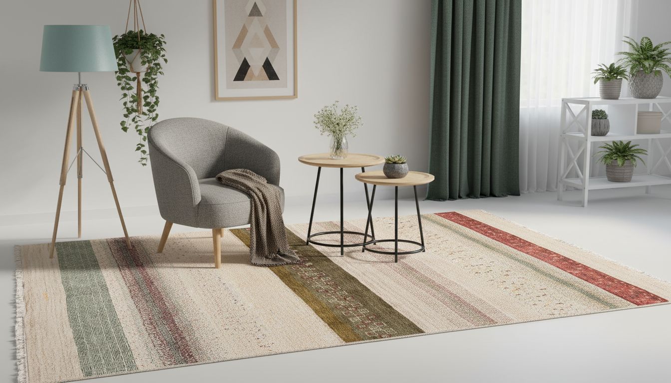 Der Bidjar-Novum-Teppich präsentiert sich in einer harmonischen Farbpalette, die von einem warmen Beige dominiert wird. Diese Hauptfarbe verleiht dem Teppich eine freundliche und einladende Atmosphäre. Ergänzt wird das Beige durch ein tiefes Rot, das an herzhaftes Ziegelrot erinnert, sowie ein erdiges Olivgrün, die dem Stück Tiefe und Lebendigkeit verleihen. Das Muster des Teppichs ist eine moderne Interpretation traditioneller Nomadenmuster, die in horizontalen Streifen arrangiert sind ...mehr Beschreibung