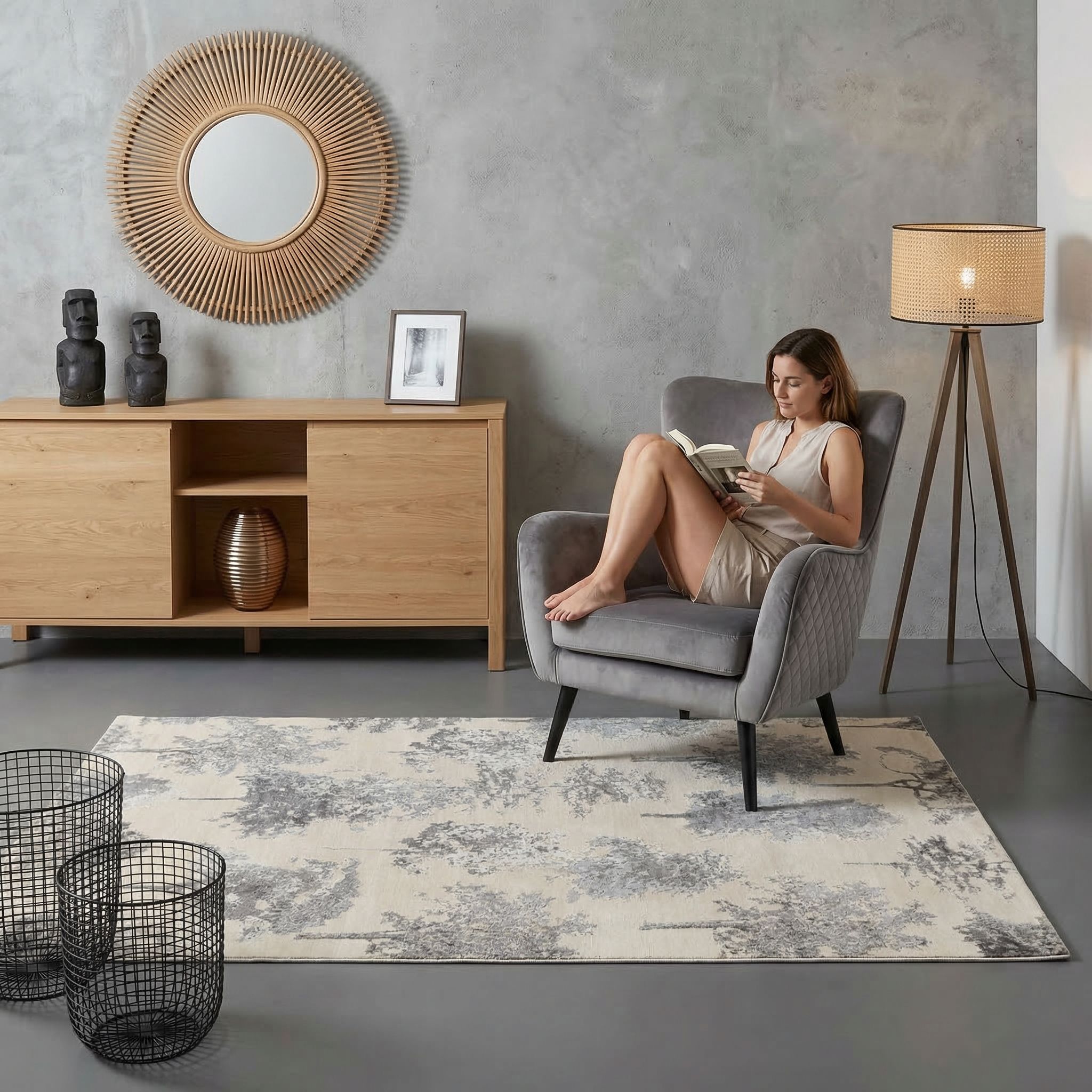 Als gekonnter Stilbruch setzt dieser Teppich einen weichen, organischen Kontrapunkt zu den rauen, kühlen Oberflächen wie Beton, Stahl und unverputztem Mauerwerk des Industrial-Chics. Die kühlen Grautöne des Baummotivs greifen die industrielle Farbwelt auf, während das Naturmotiv und die weiche Haptik die Strenge des Lofts sanft abmildern und wohnlicher gestalten. Handgekardete Schafwolle bringt notwendige Wärme in weite, offene Räume und verbessert zudem die Akustik in halligen Fabriketagen erheblich. Das moderne Design der "Eterno"-Kollektion verbindet sich spannend mit Vintage-Ledermöbeln und Fabriklampen zu einem urbanen Gesamtbild voller Charakter.