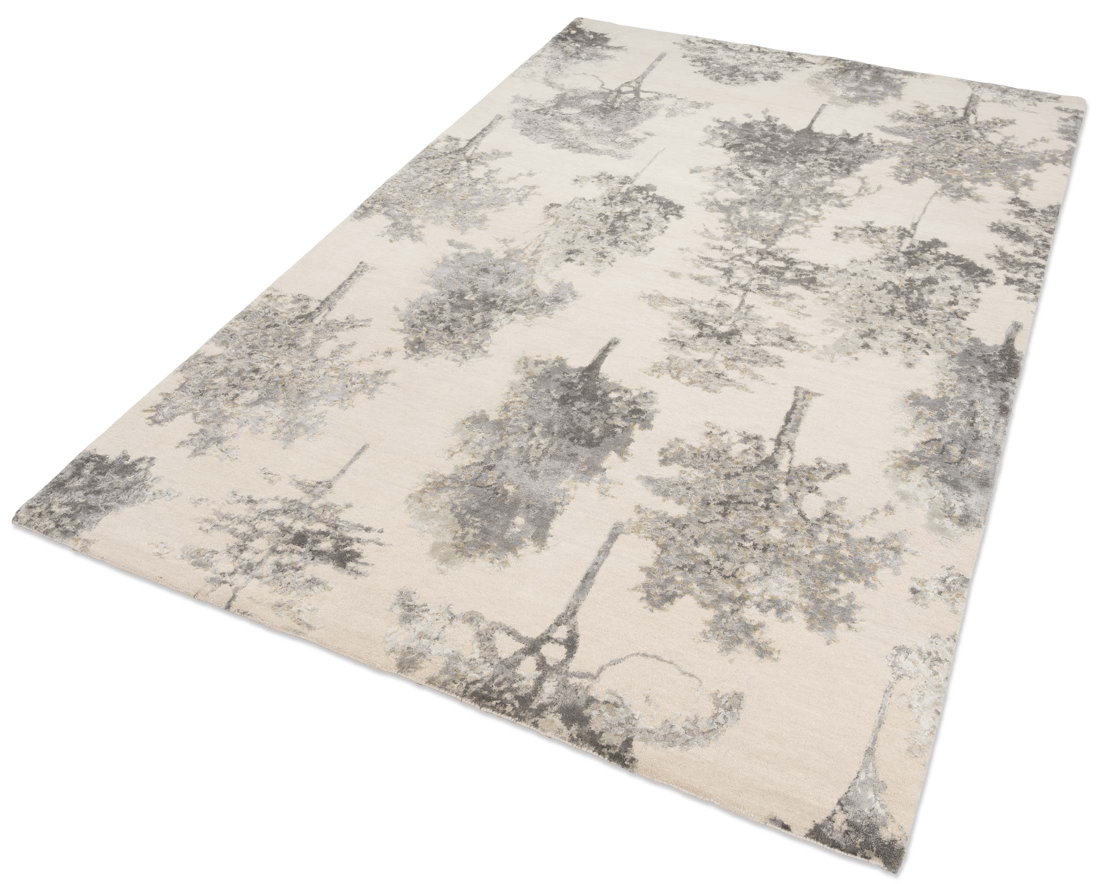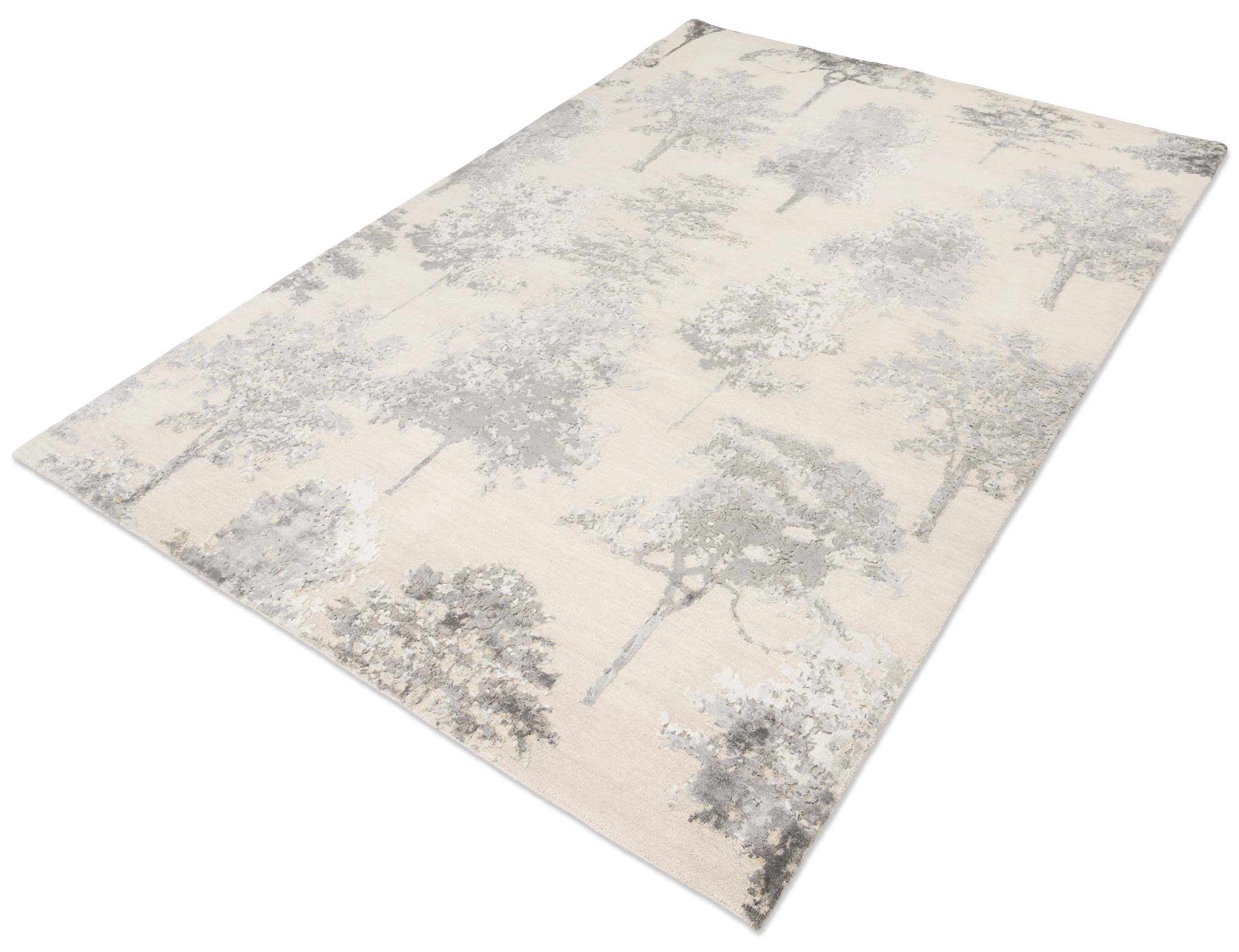 Dieser handgeknüpfte Teppich aus der Eterno-Kollektion präsentiert sich in einer eleganten Cremefarbe als Hauptfarbe, die eine beruhigende Basis schafft. Das Design wird durch stilvolle Grautöne und subtile Akzente in Silber ergänzt, die dem Teppich eine sanfte, moderne Ästhetik verleihen. Das Muster zeigt sich in einem erfrischenden Baumdesign, das dem Raum eine natürliche und zugleich stilvolle Atmosphäre verleiht. Die Verwendung von handgekardeter Schafwolle und erstklassiger ...mehr Beschreibung