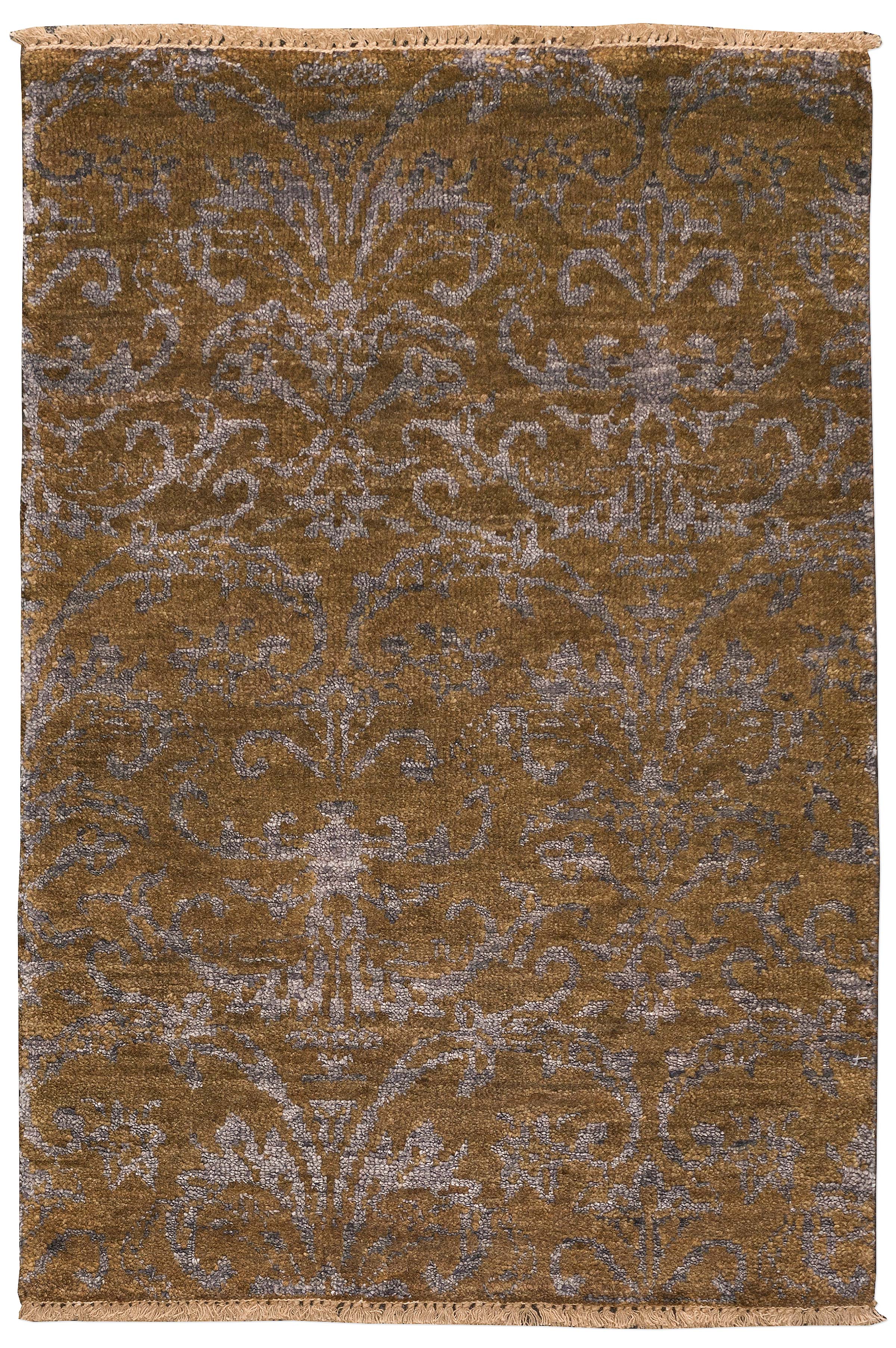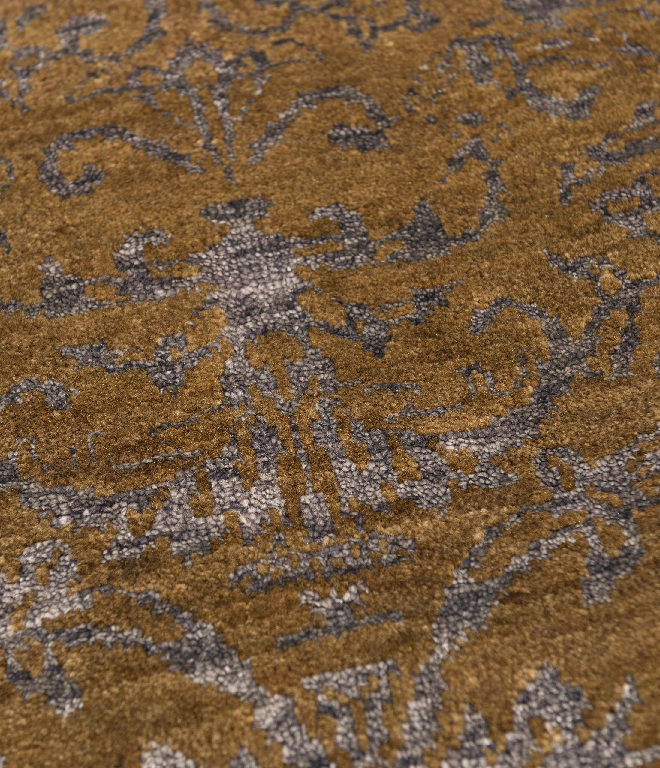 Dieser handgeknüpfte Teppich aus Indien, bekannt als Eterno, besticht durch seine warme, goldbraune Hauptfarbe, die Eleganz und Behaglichkeit in jeden Raum bringt. Die feinen Musterungen in kühlem Grau verleihen dem Teppich Tiefe und Struktur, während dezente Akzente in einem sanften Beigeton das Design harmonisch abrunden. Das florale Muster im Vintage-Stil erinnert an klassische Ornamente und schafft eine zeitlose Atmosphäre.Dieser Teppich wurde aus handgekardeter Schafwolle und ...